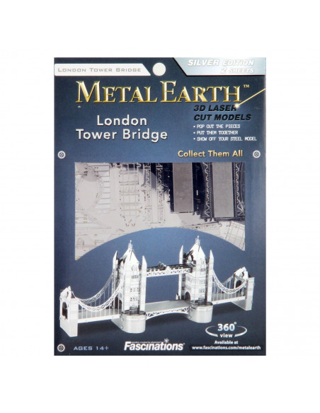 Dit model van de Londen Tower Bridge bestaat uit twee metalen vellen met onderdeeltjes en een gedetailleerde bouwtekening.