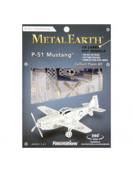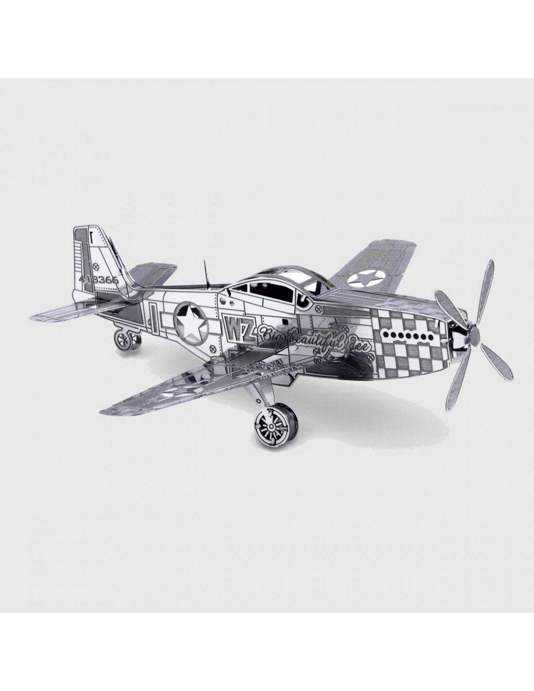 Dit model van het Mustang P-51 jachtvliegtuig bestaat uit één metalen vel met onderdeeltjes en een gedetailleerde bouwtekening.