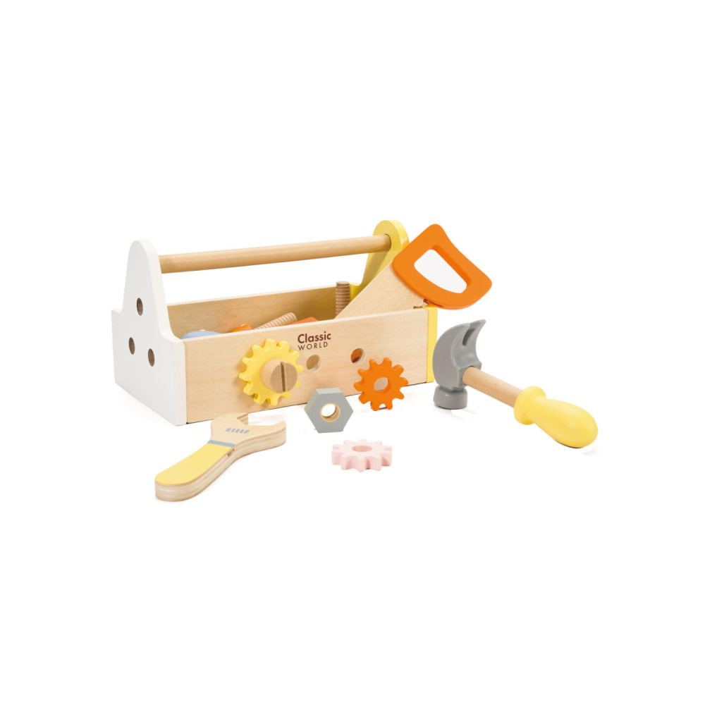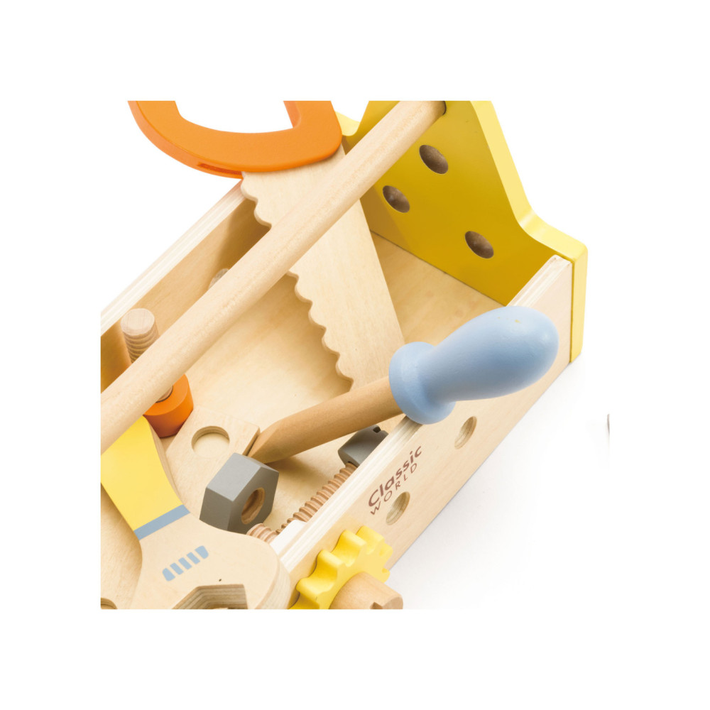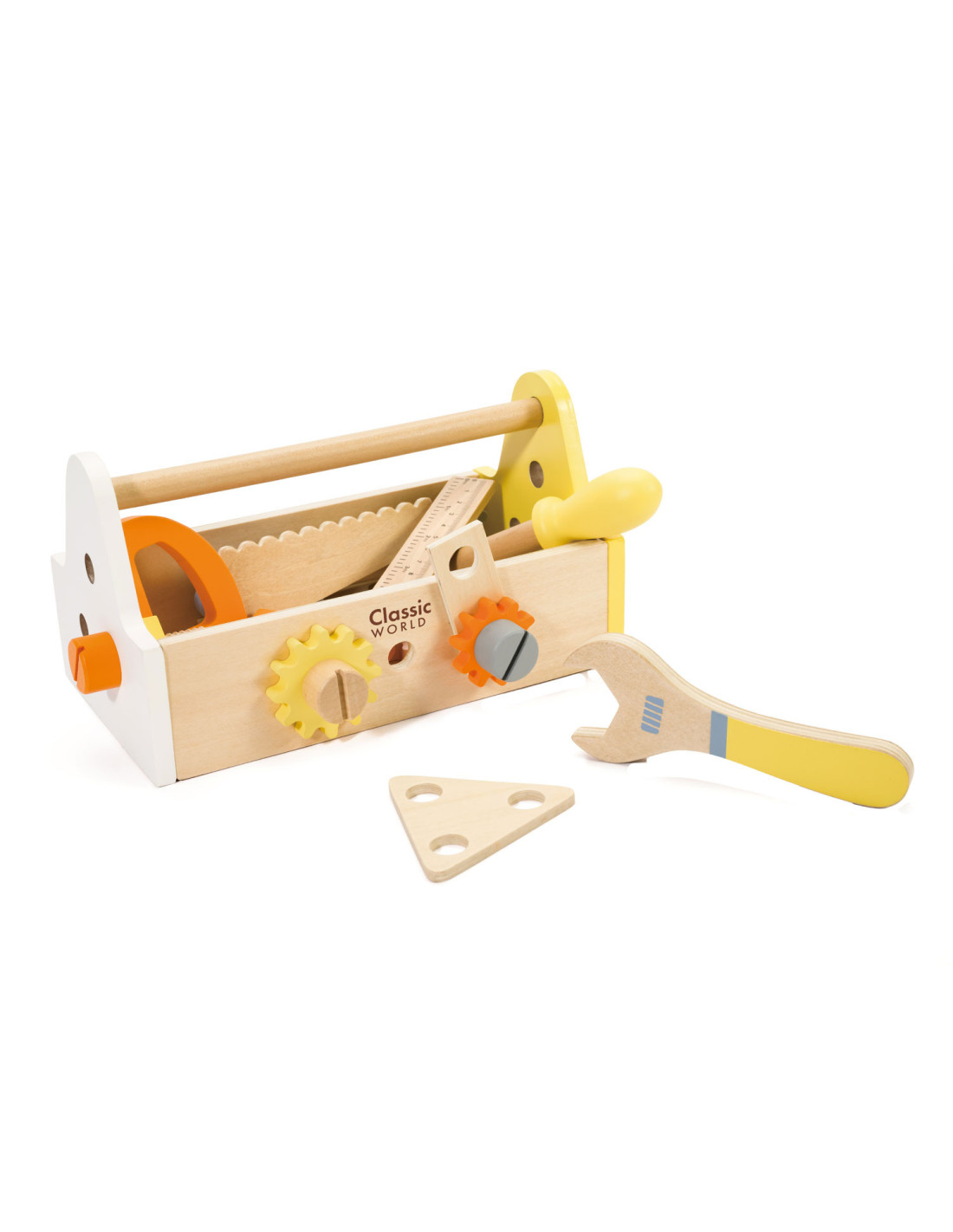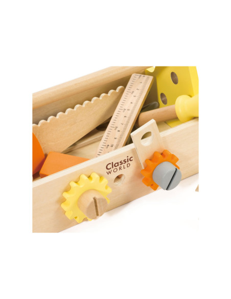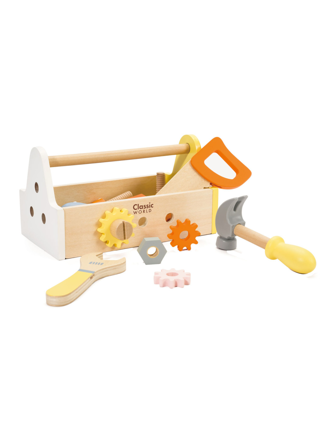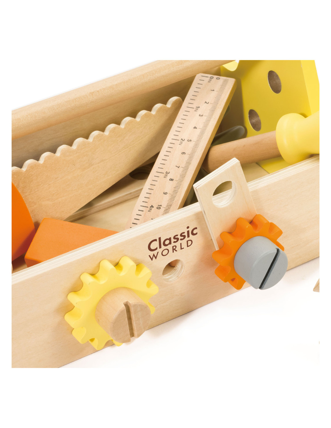 Houten gereedschapskist van Classic World met houten gereedschap zoals een hamer, schroevendraaier en moersleutel. Inclusief diverse accessoires zoals bouten, plankjes en tandwielen. De gereedschapskist is 24 x 13 centimeter groot en geschikt vanaf 3 jaar.