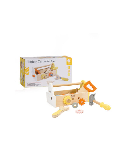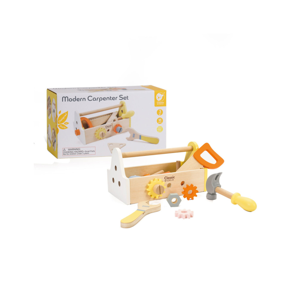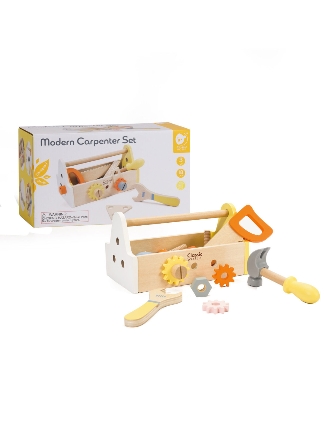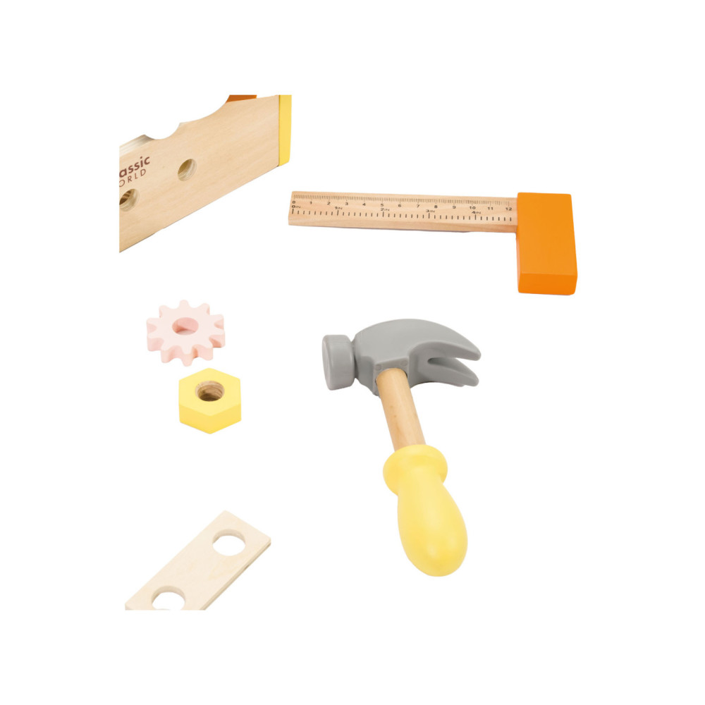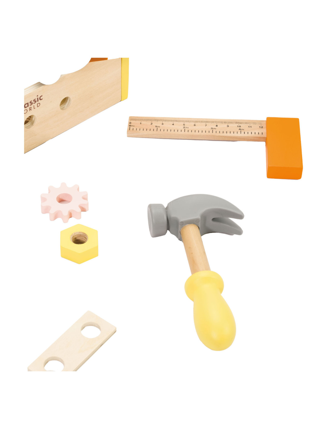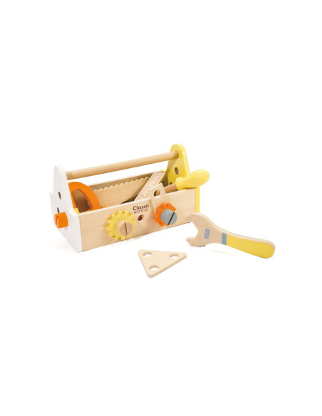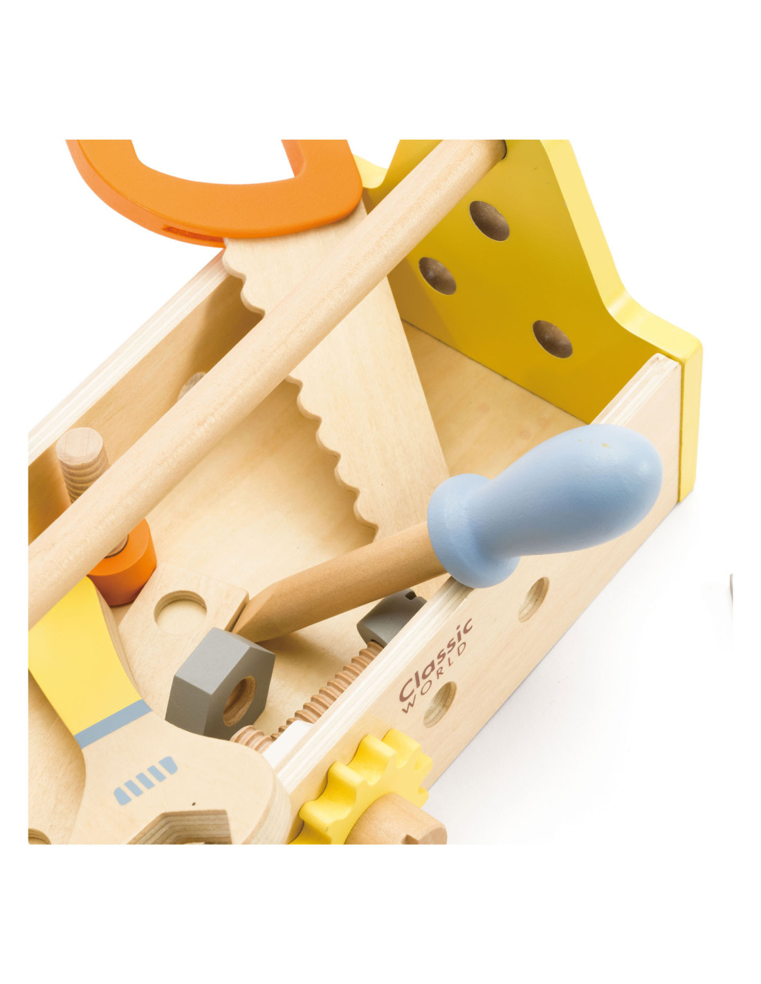 Houten gereedschapskist van Classic World met houten gereedschap zoals een hamer, schroevendraaier en moersleutel. Inclusief diverse accessoires zoals bouten, plankjes en tandwielen. De gereedschapskist is 24 x 13 centimeter groot en geschikt vanaf 3 jaar.