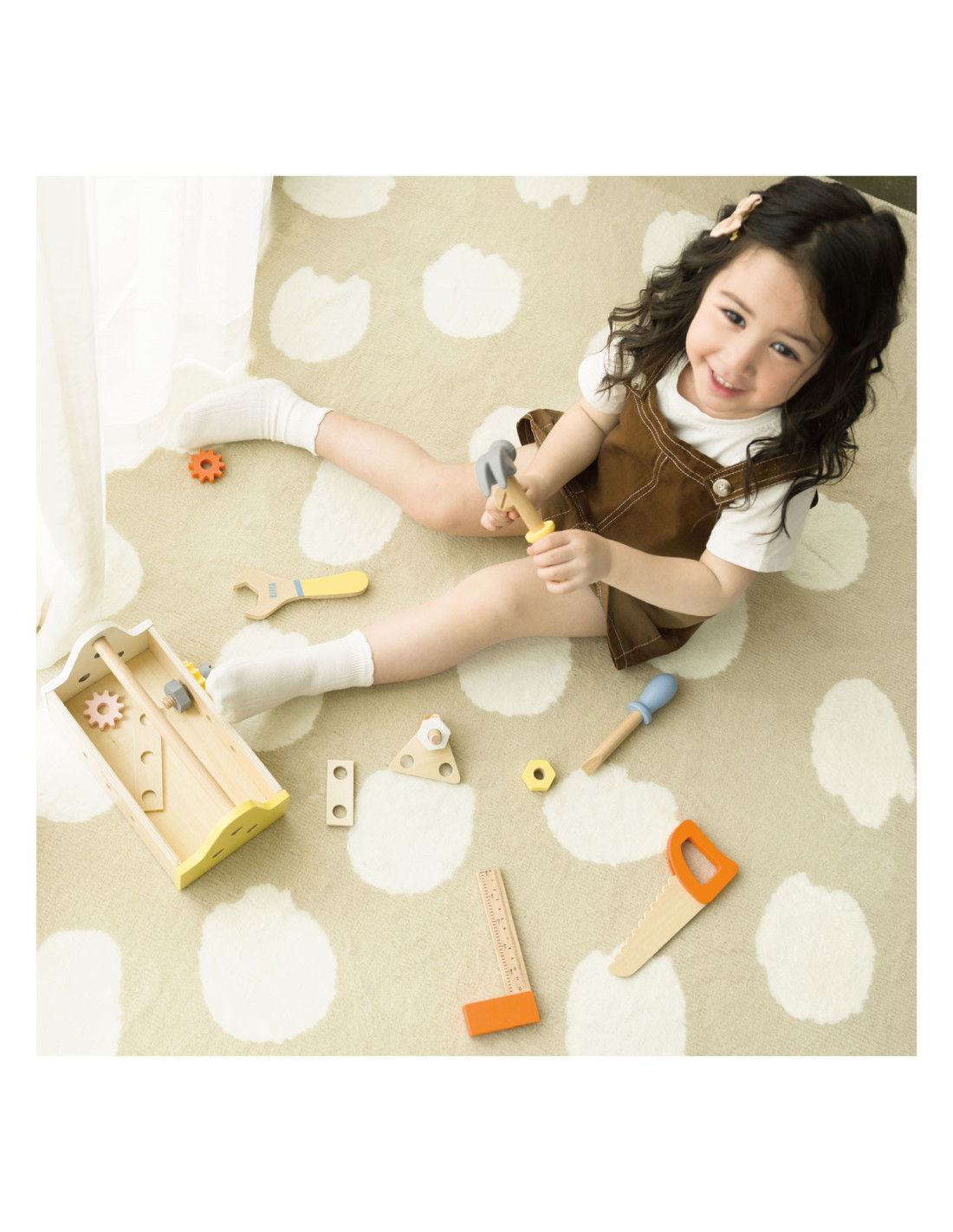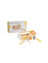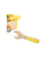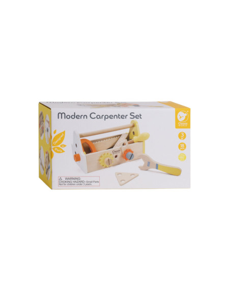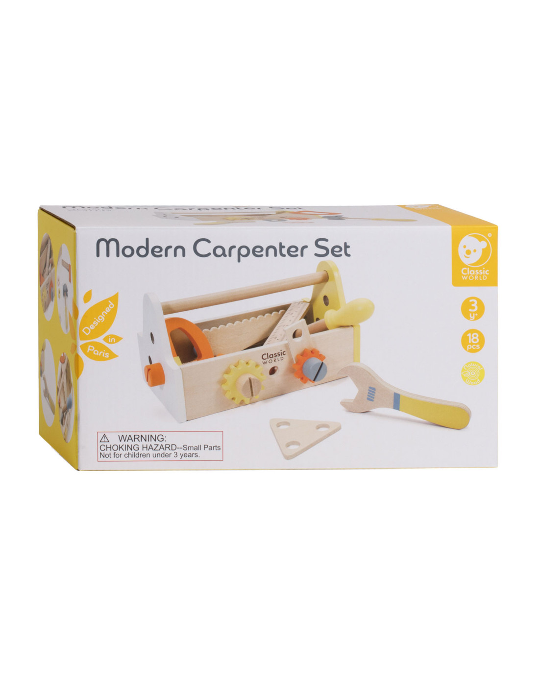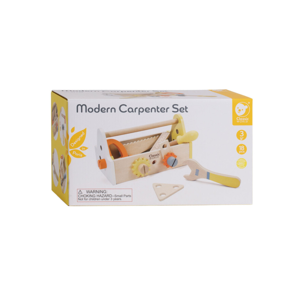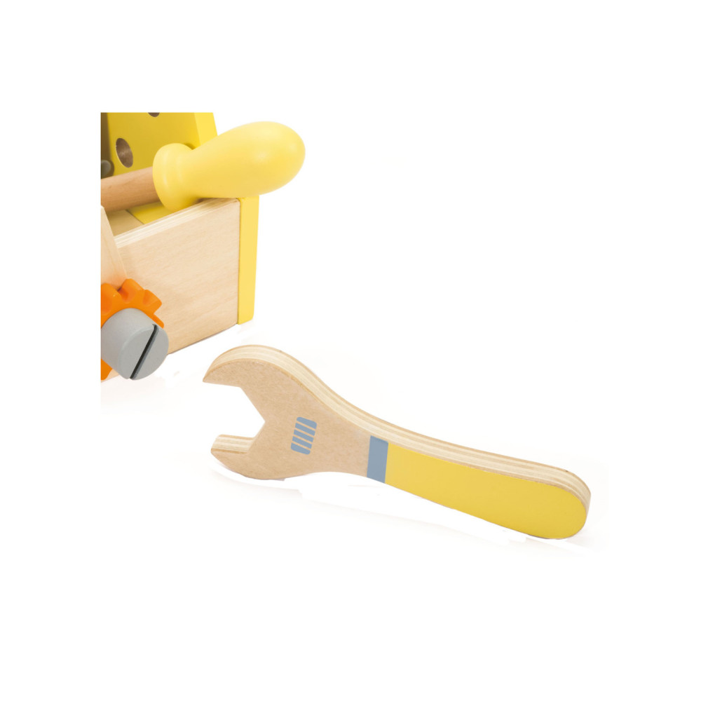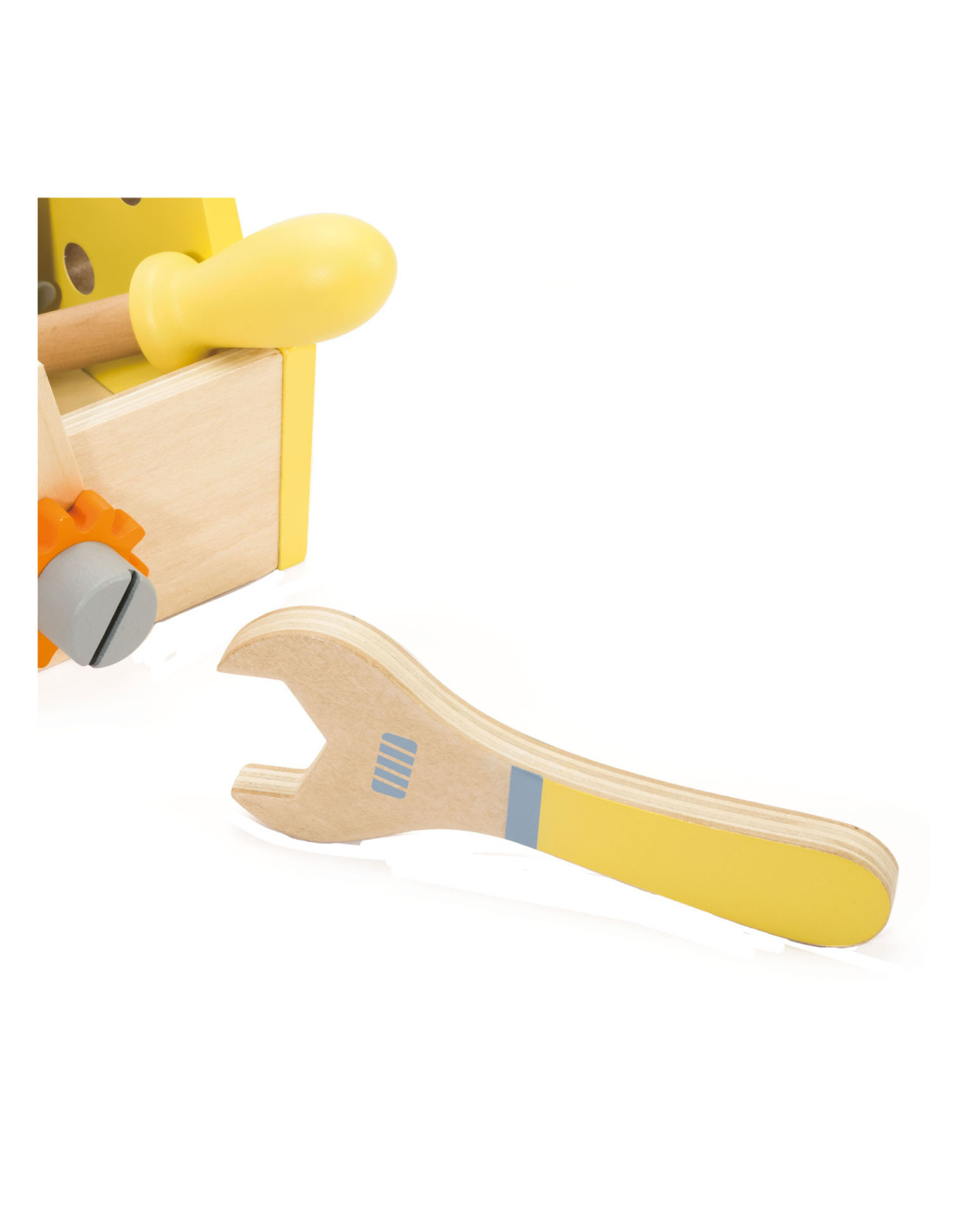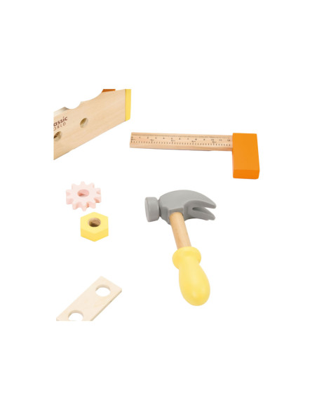 Houten gereedschapskist van Classic World met houten gereedschap zoals een hamer, schroevendraaier en moersleutel. Inclusief diverse accessoires zoals bouten, plankjes en tandwielen. De gereedschapskist is 24 x 13 centimeter groot en geschikt vanaf 3 jaar.