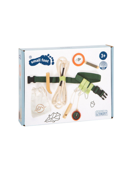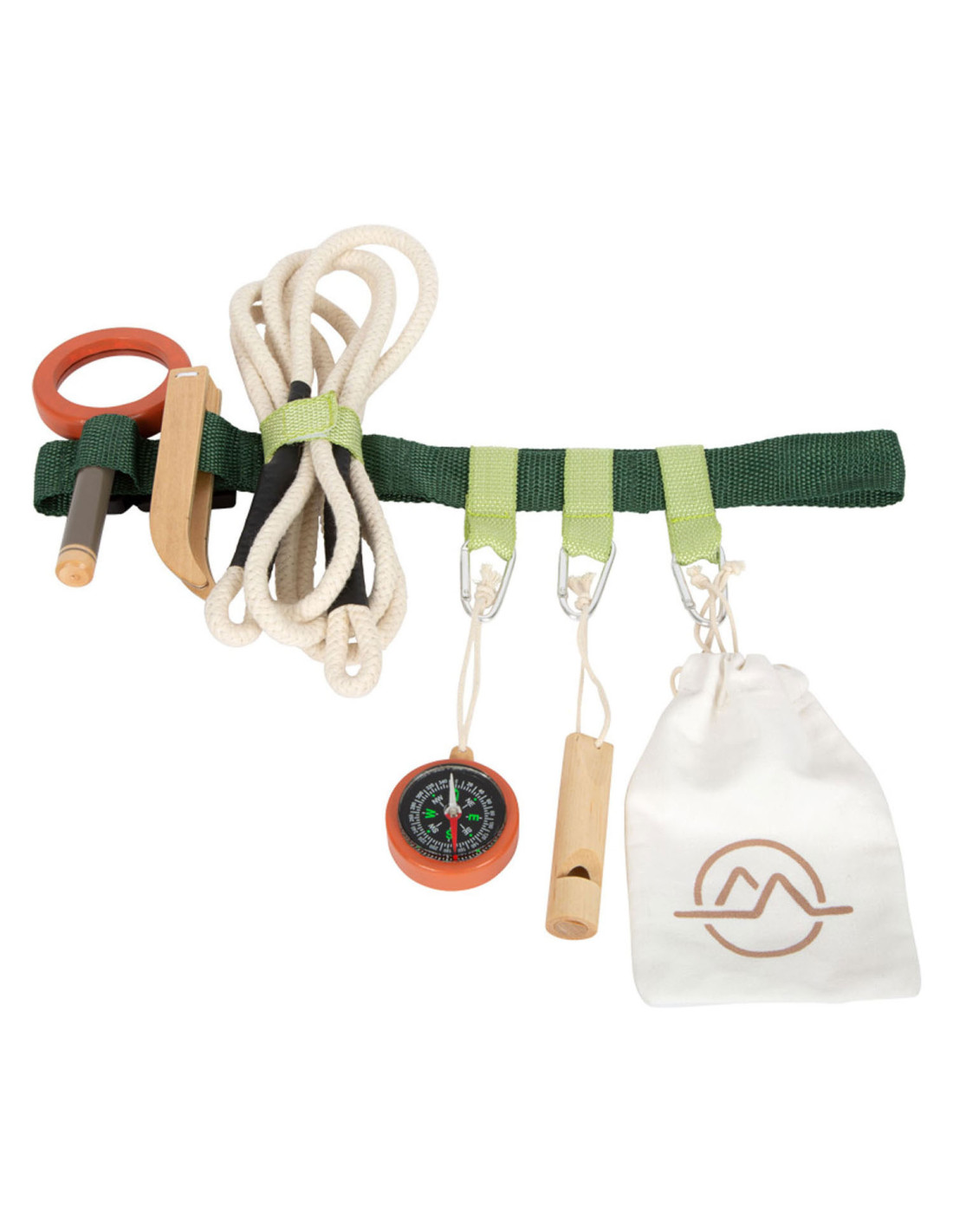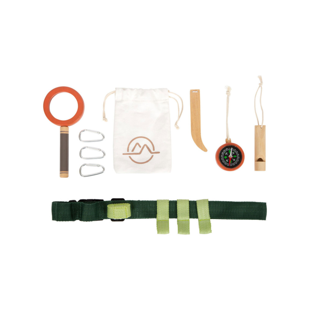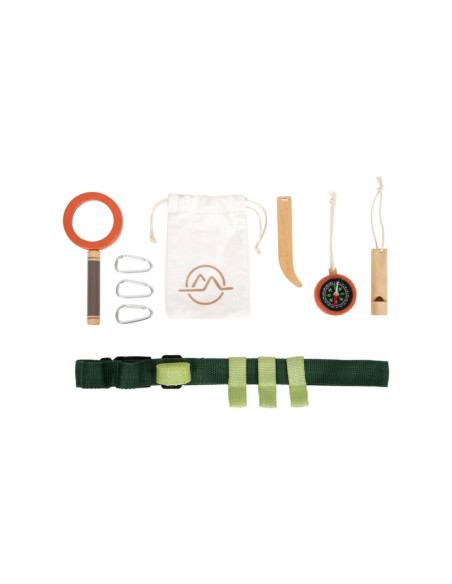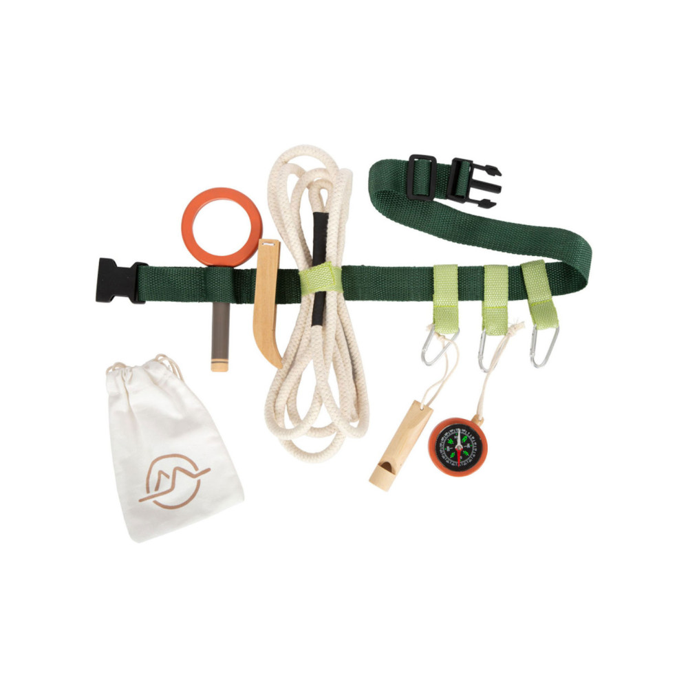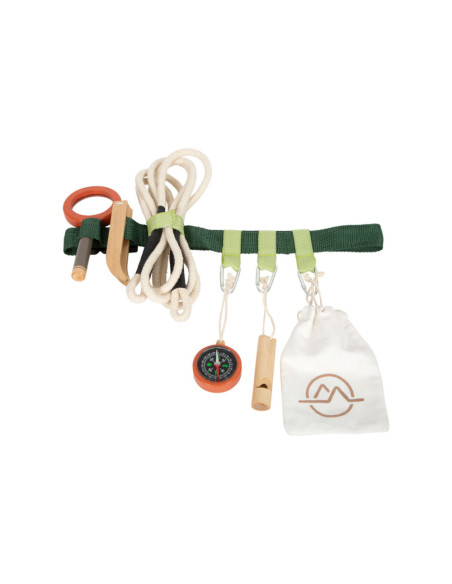 Gereedschapsriem voor kleine avonturiers. Inhoud: karabijnhaken, signaalfluit van massief hout, vergrootglas met vergrotingsfunctie, pincet, kompas, touw en katoenen zak om dingen uit de natuur te verzamelen. Geschikt vanaf 3 jaar.
