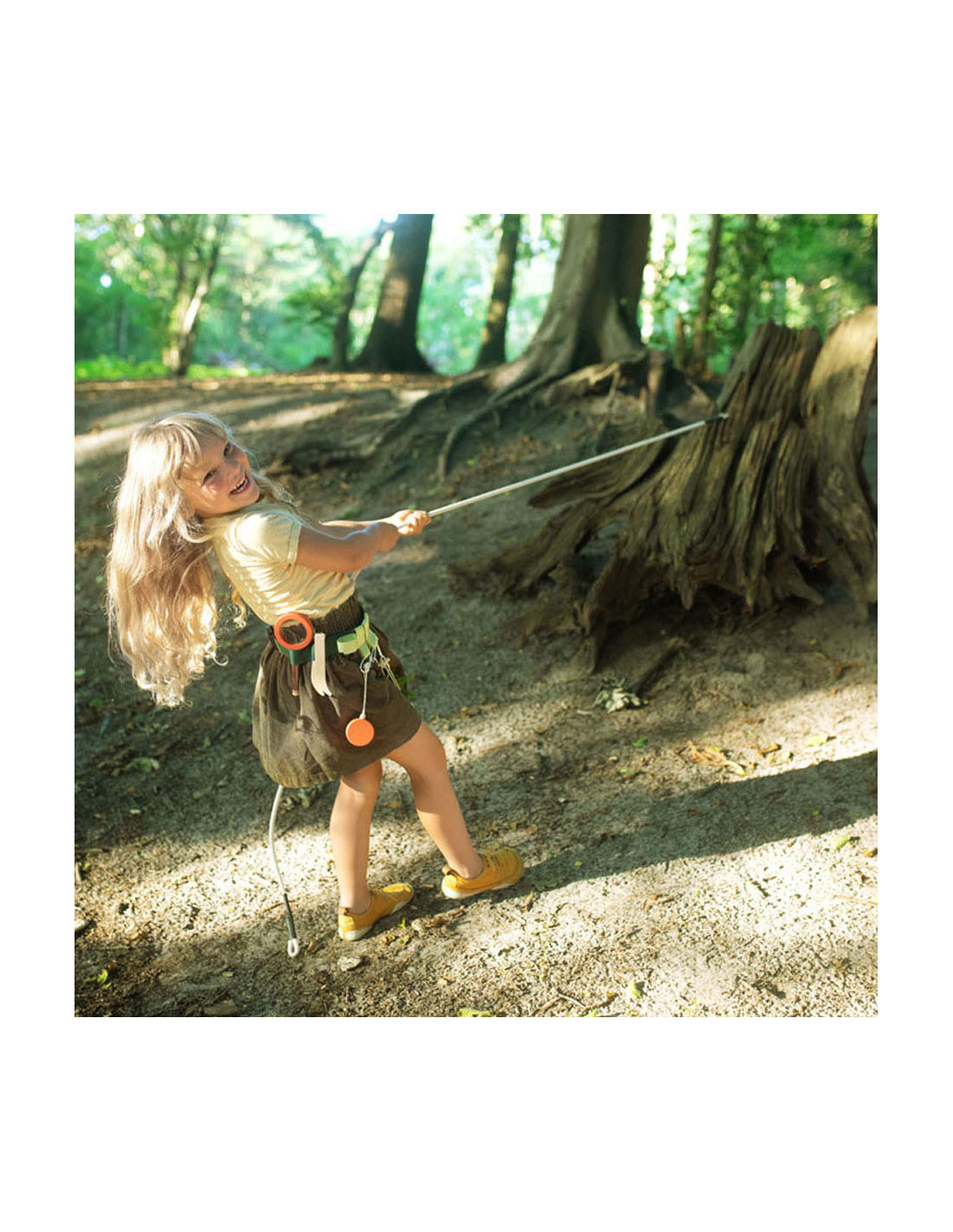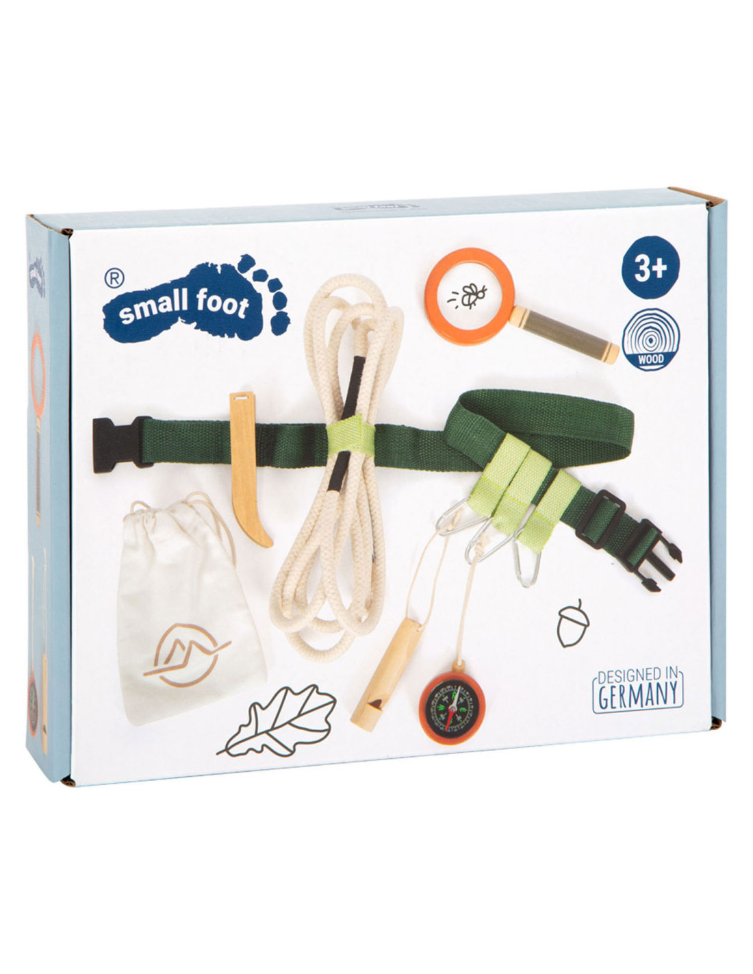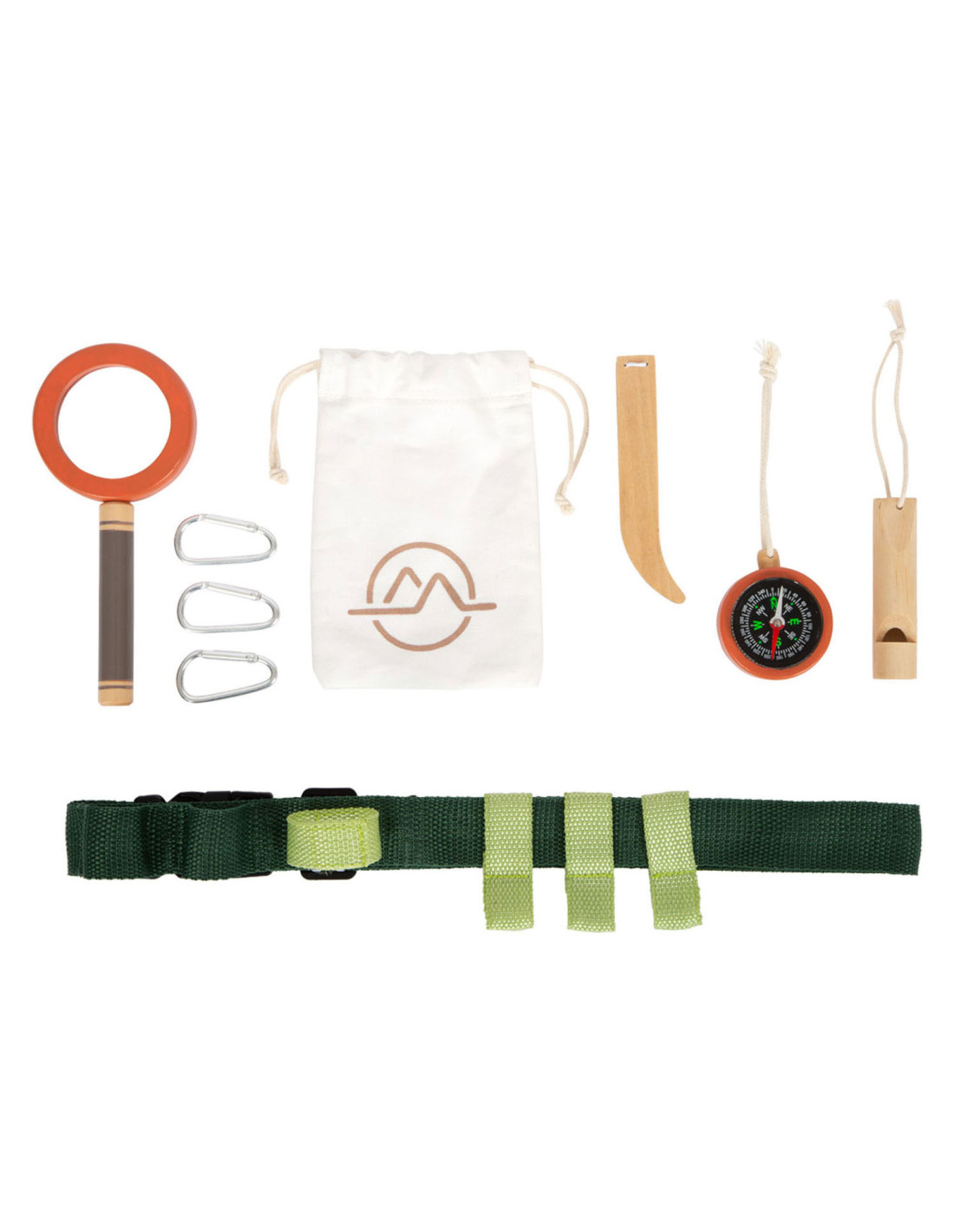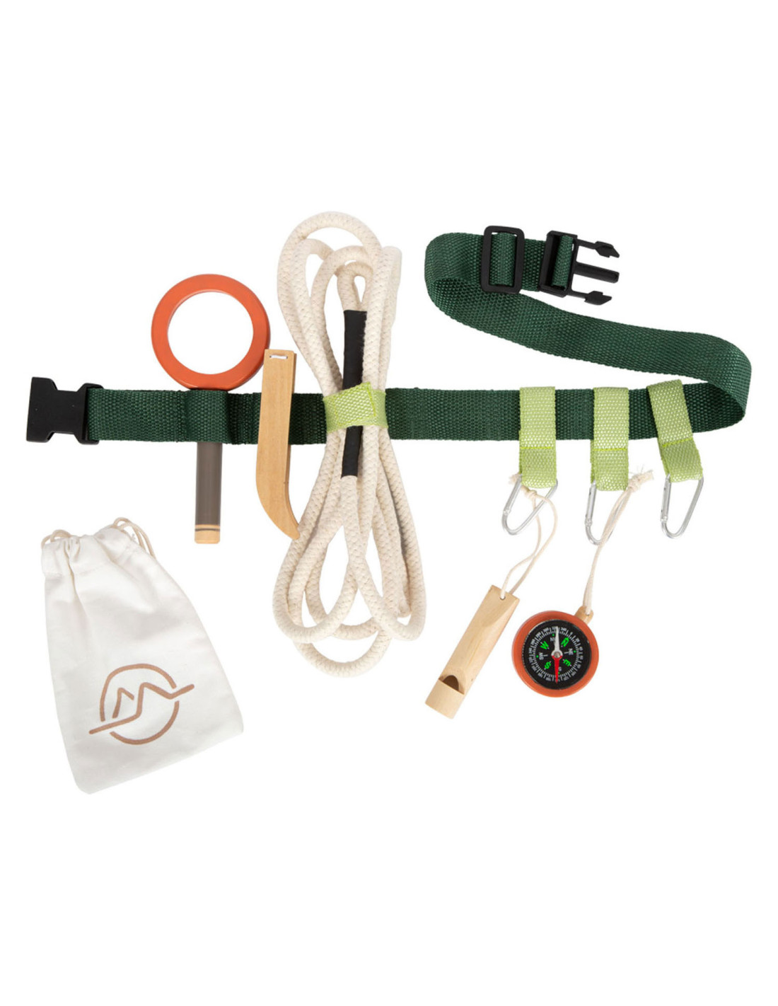 Gereedschapsriem voor kleine avonturiers. Inhoud: karabijnhaken, signaalfluit van massief hout, vergrootglas met vergrotingsfunctie, pincet, kompas, touw en katoenen zak om dingen uit de natuur te verzamelen. Geschikt vanaf 3 jaar.