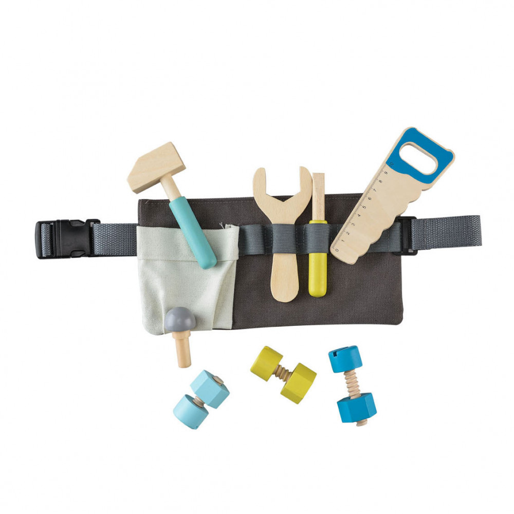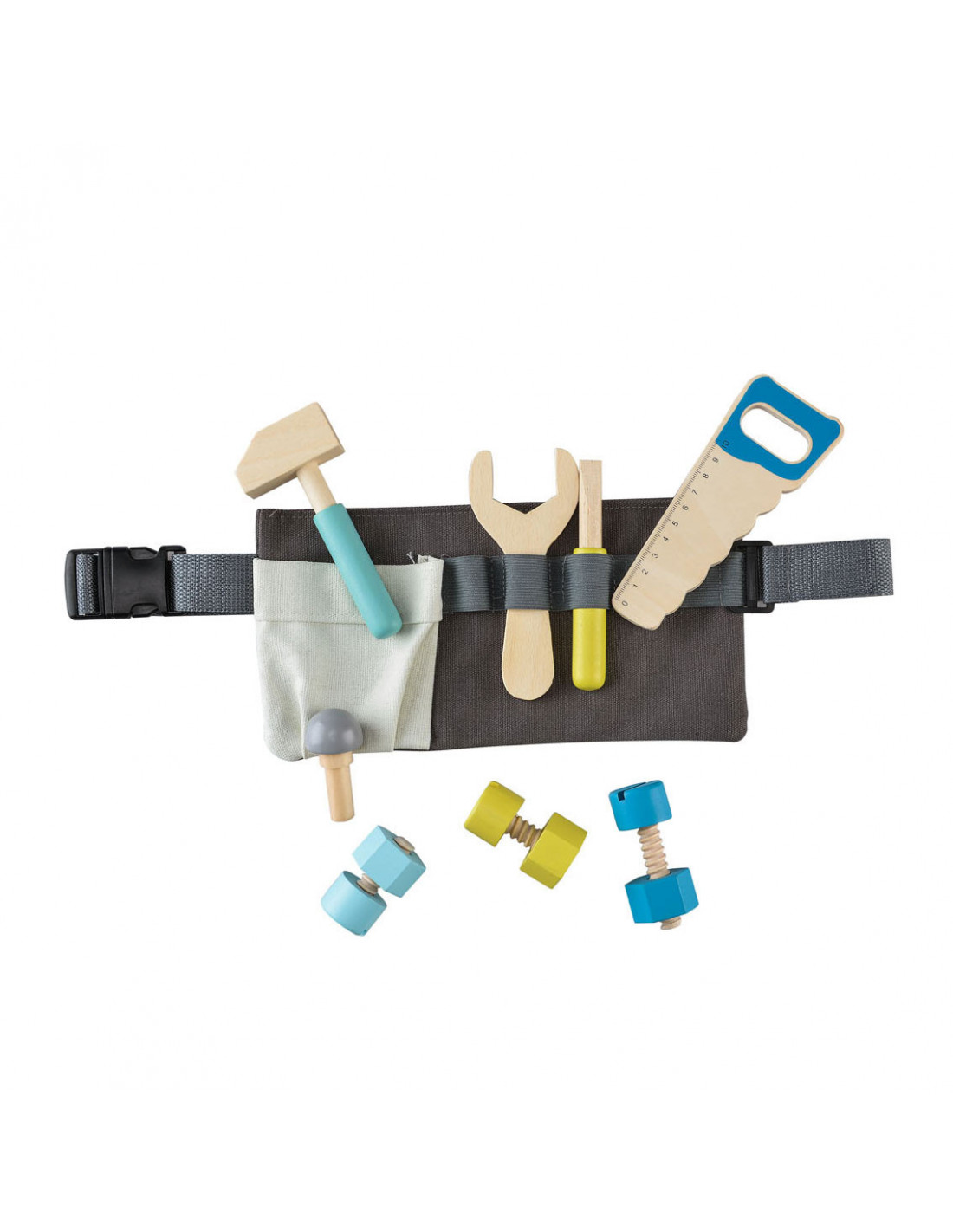 Deze set bestaat uit 3 bouten en moeren die je in het zakje kan doen en een hamer, moersleutel, schroevendraaier en zaag.