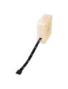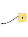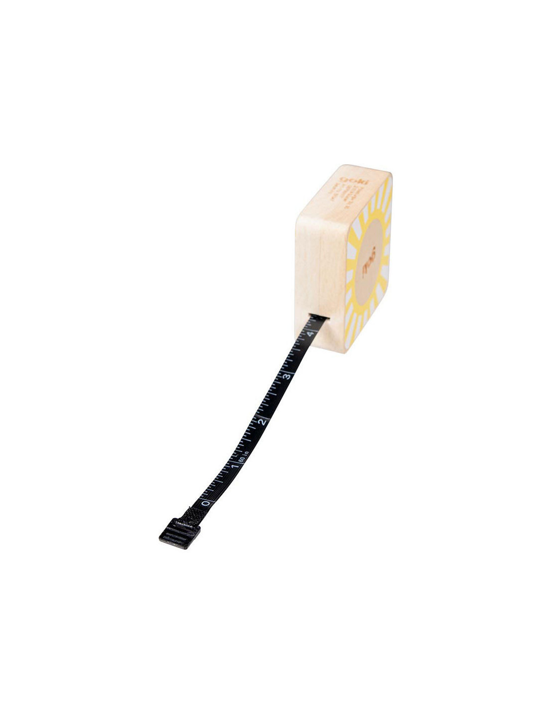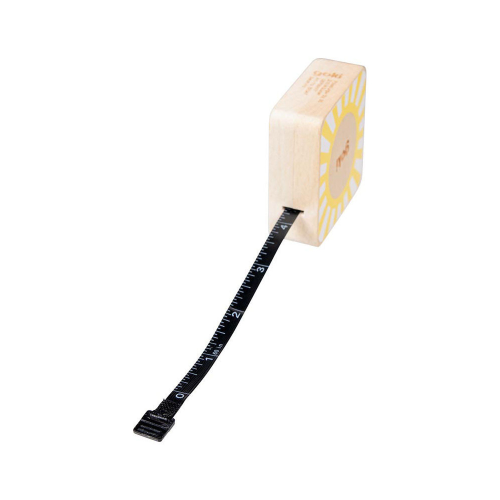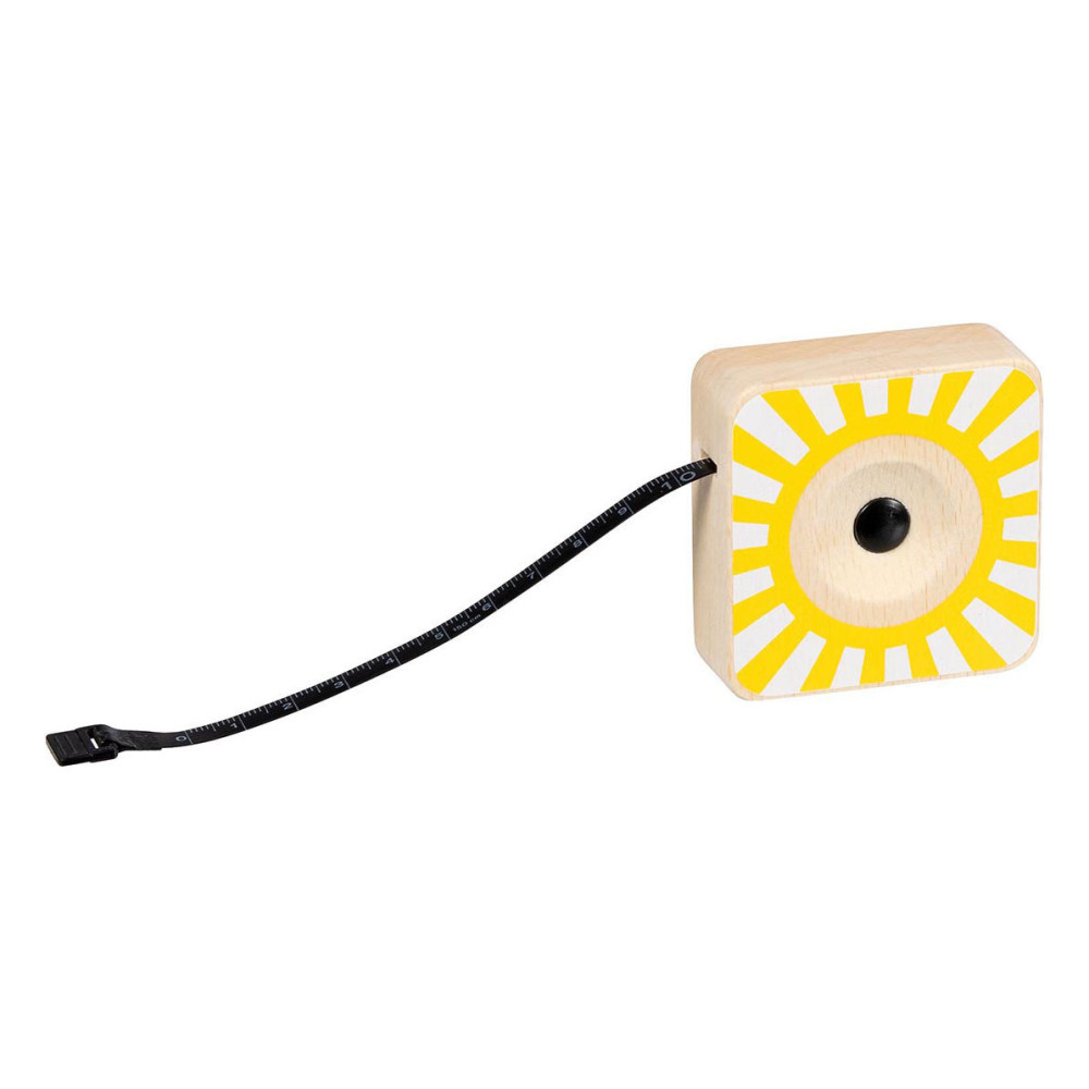 Vrolijke rolmaat in een houten behuizing met een zon erop afgebeeld. Trek de rolmaat eruit en druk op het zwarte knopje om hem weer op te rollen.