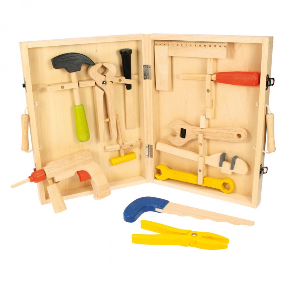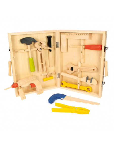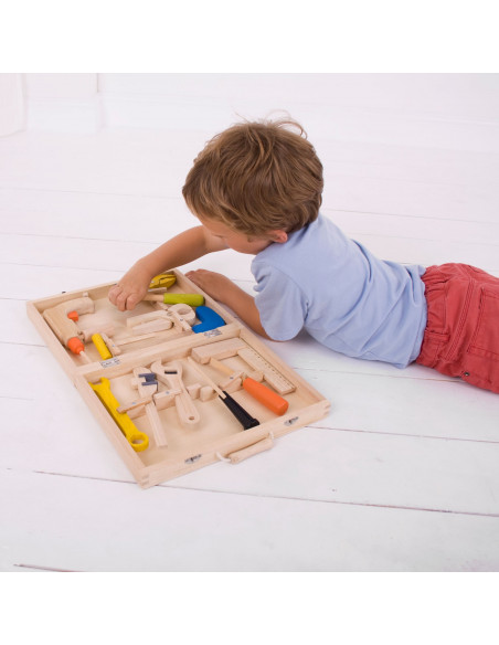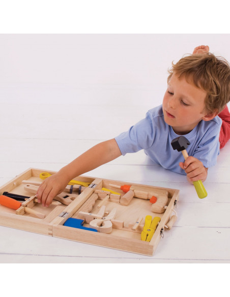 Word een echte timmerman met deze houten gereedschapskist van Bigjigs. De houten kist bevat een schroevendraaier, een nijptang, een moersleutel, een boor, een plamuurmes, een schroevendraaier, een winkelhaak, een boormachine, een kniptang, een hamer en een handzaag. Al het gereedschap is gemaakt van prachtig afgewerkt hout, waardoor het veilig in gebruik is! In de handige opbergkist neem je het gereedschap gemakkelijk mee naar de klus! Spelen met de set stimuleert fantasie, creativiteit, hand-oogcoördinatie, probleemoplossend vermogen en geeft inzicht in oorzaak en gevolgrelaties.