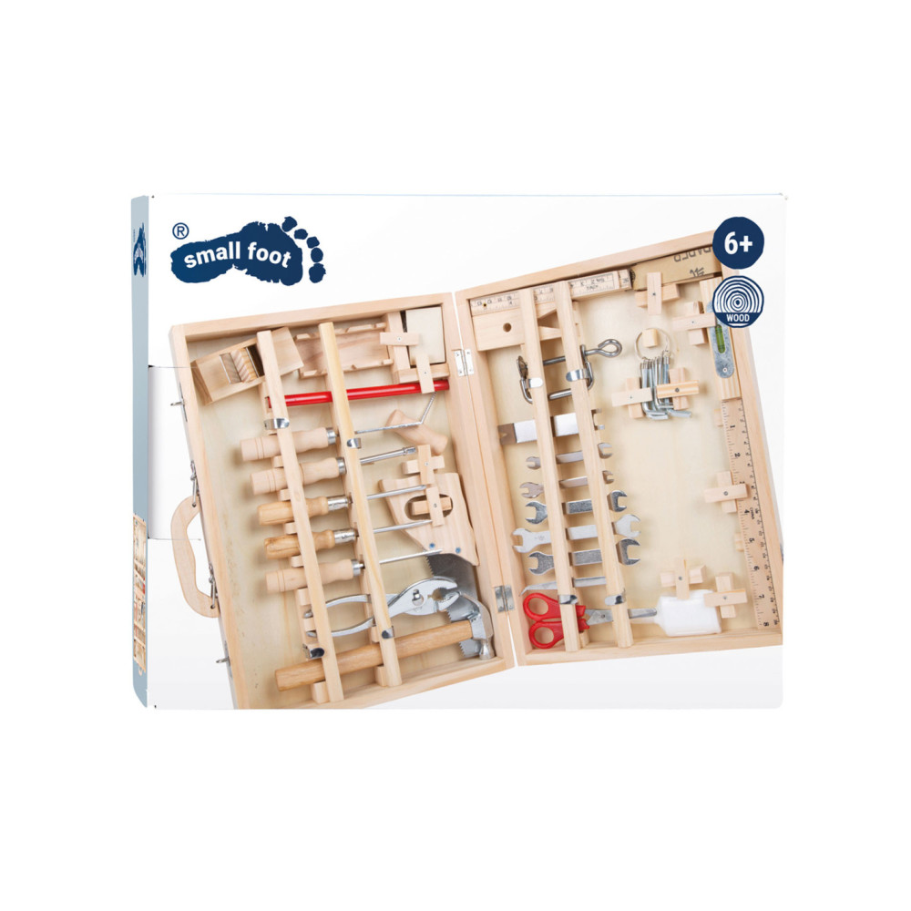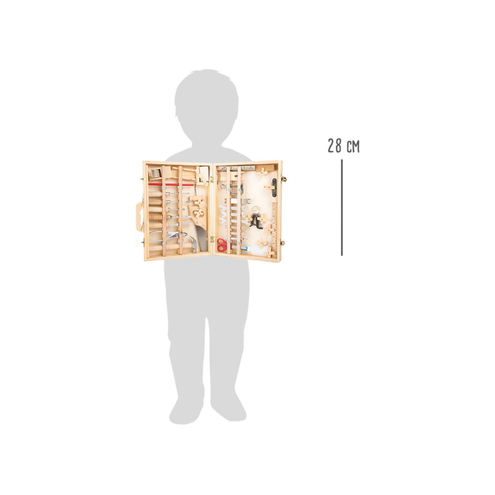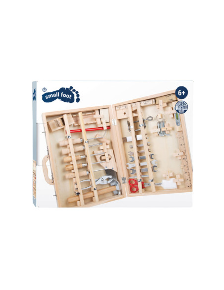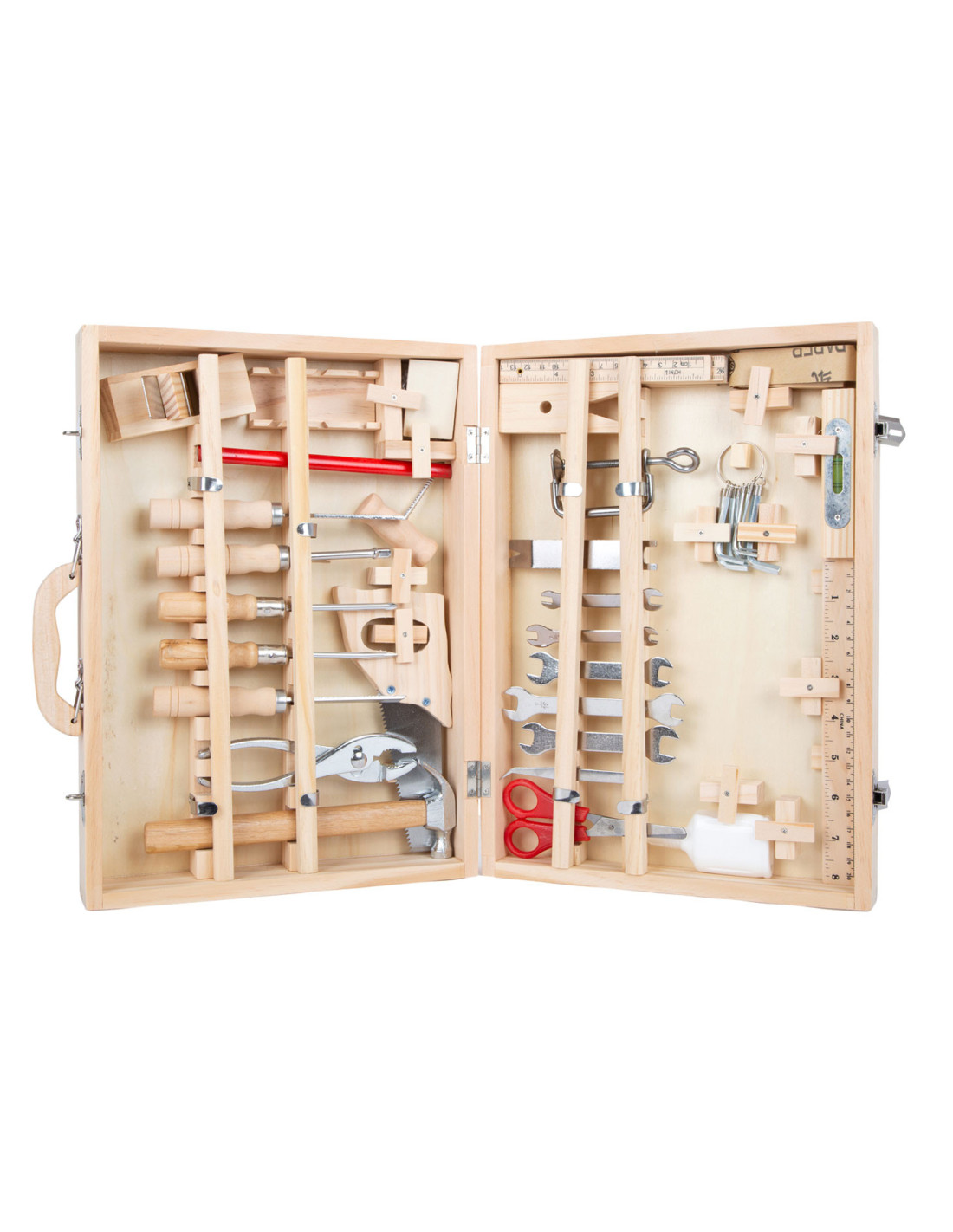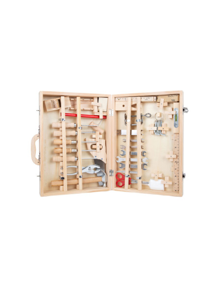 Dit is het beste van onze gereedschapskoffers: scharnierende houten kist met veel onderdelen voor de kleine ambachtslieden! Voor elke essentiële reparatie vindt u het juiste gereedschap, bijvoorbeeld een liniaal en een timmermanspotlood, een schroefsleutel, een dopsleutel, een hamer en een zaag! Al het gereedschap, netjes opgeborgen, is afgesloten en beveiligd voor transport. Onmisbaar voor kleine ambachtslieden die met metaal en hout werken! Onmisbaar voor kleine vakmensen in de metaal- en houtsector!