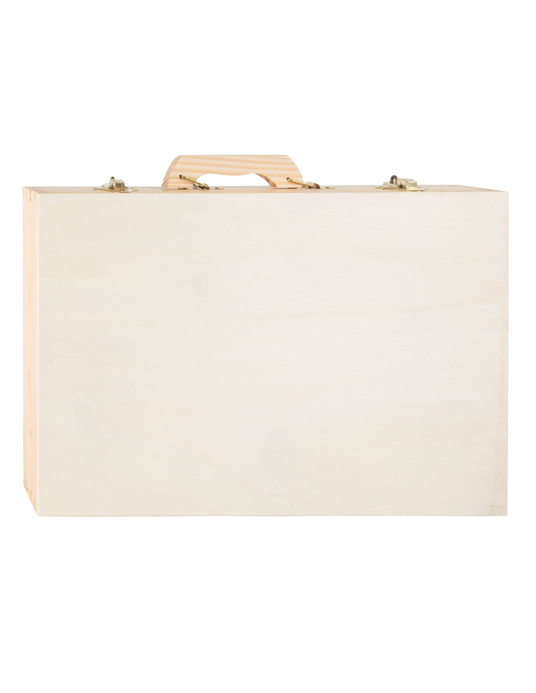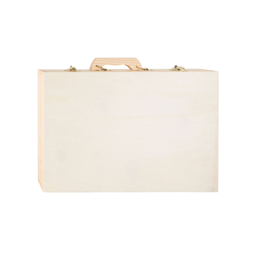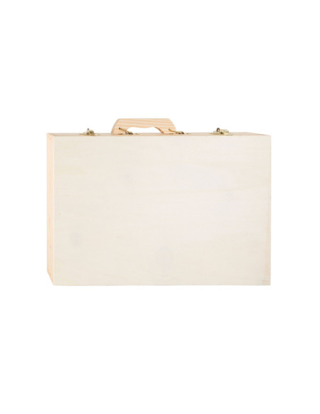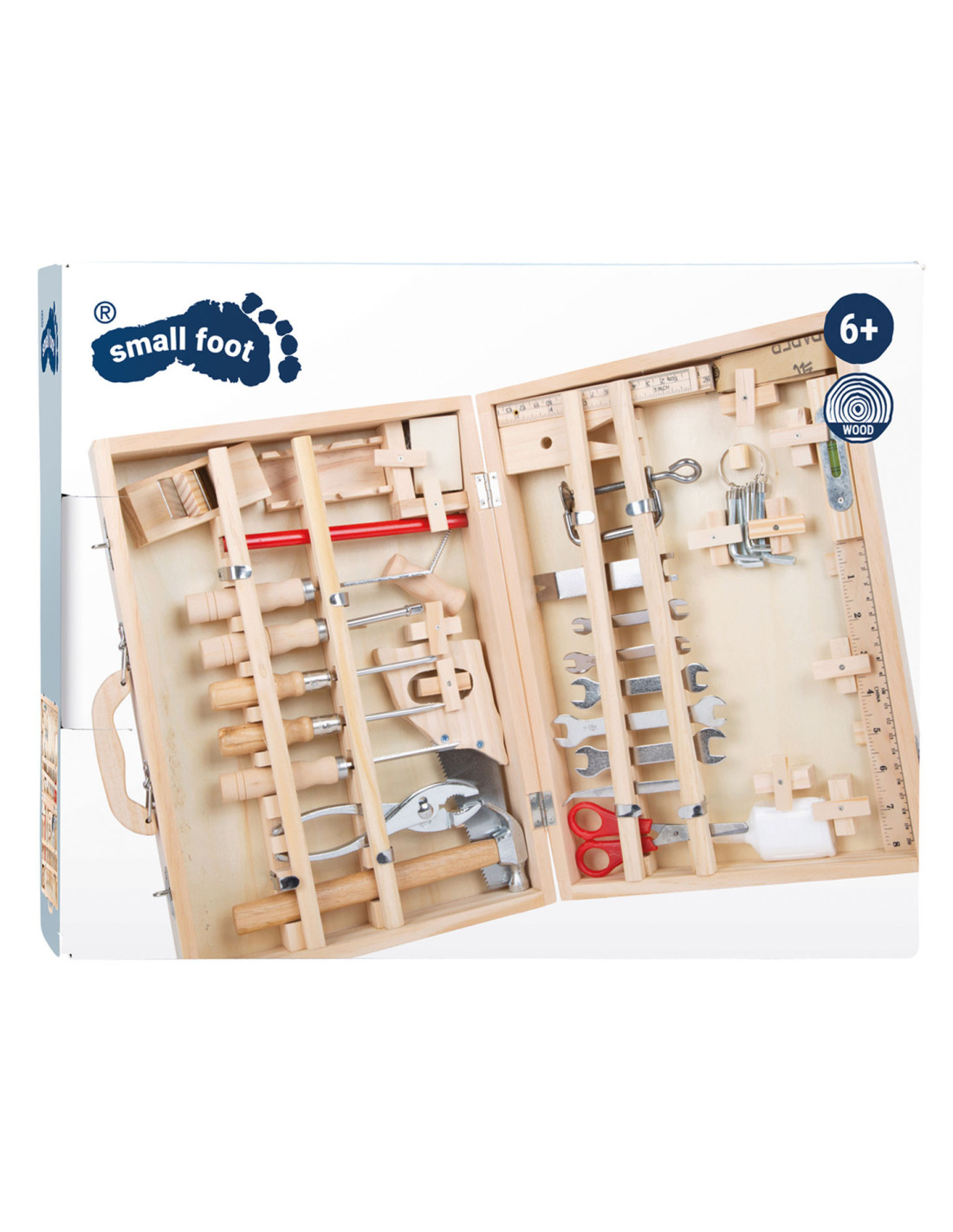 Dit is het beste van onze gereedschapskoffers: scharnierende houten kist met veel onderdelen voor de kleine ambachtslieden! Voor elke essentiële reparatie vindt u het juiste gereedschap, bijvoorbeeld een liniaal en een timmermanspotlood, een schroefsleutel, een dopsleutel, een hamer en een zaag! Al het gereedschap, netjes opgeborgen, is afgesloten en beveiligd voor transport. Onmisbaar voor kleine ambachtslieden die met metaal en hout werken! Onmisbaar voor kleine vakmensen in de metaal- en houtsector!