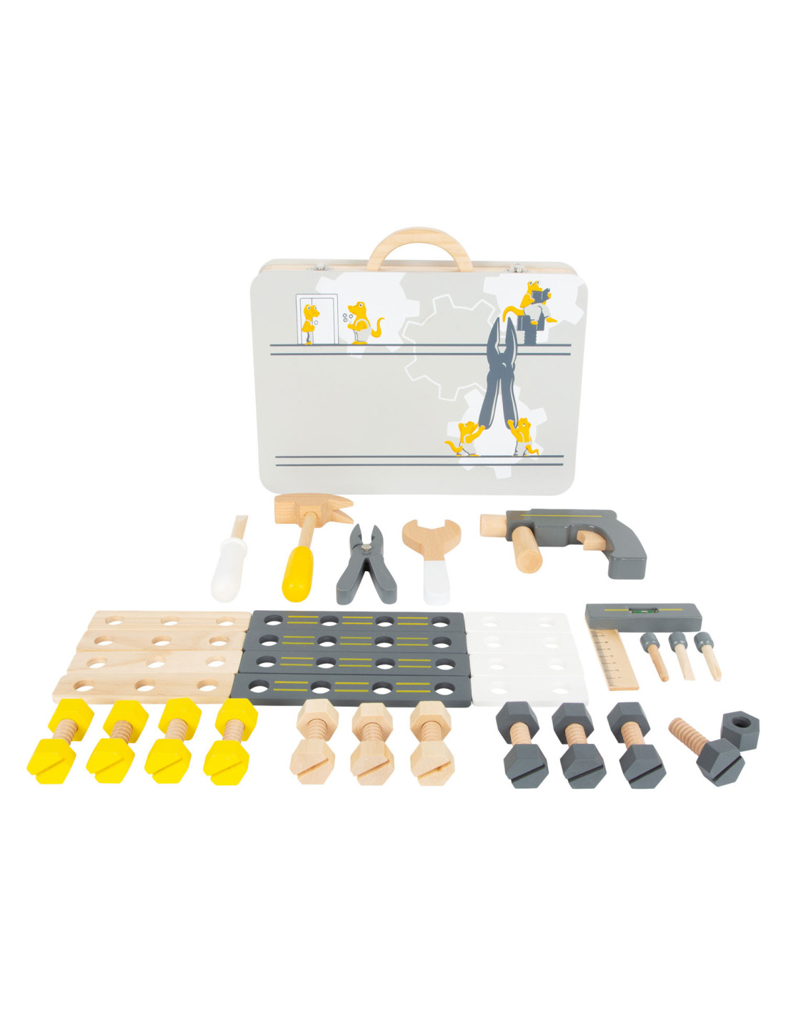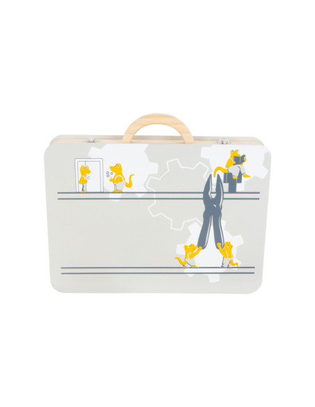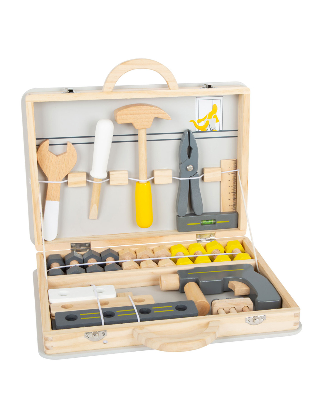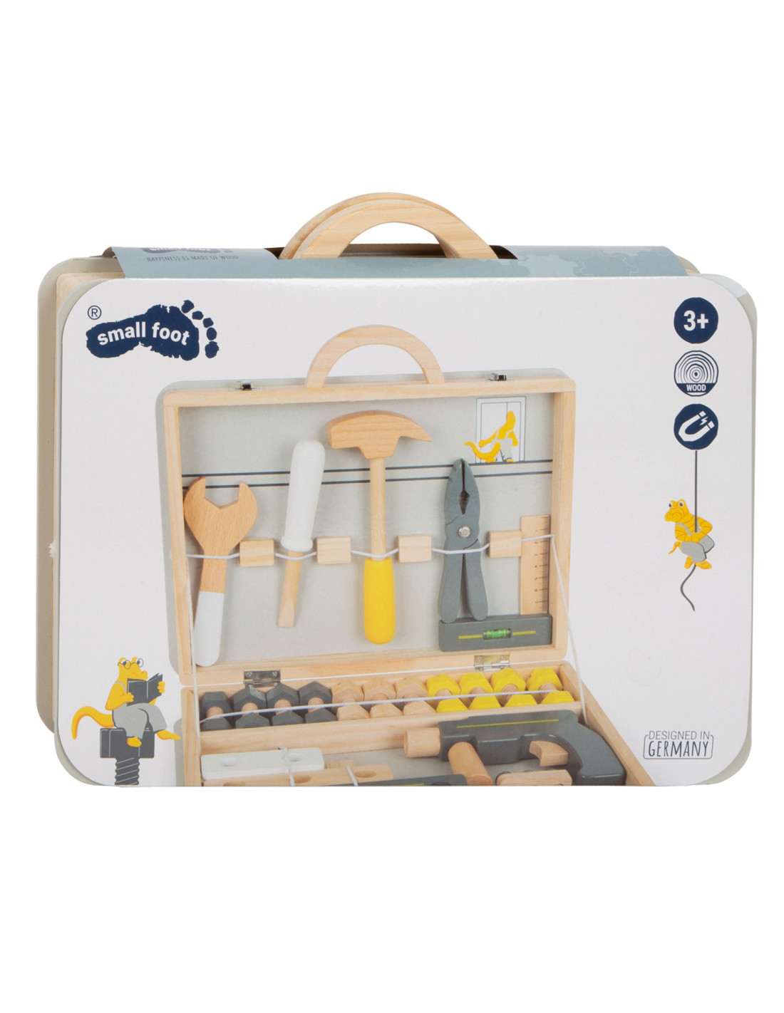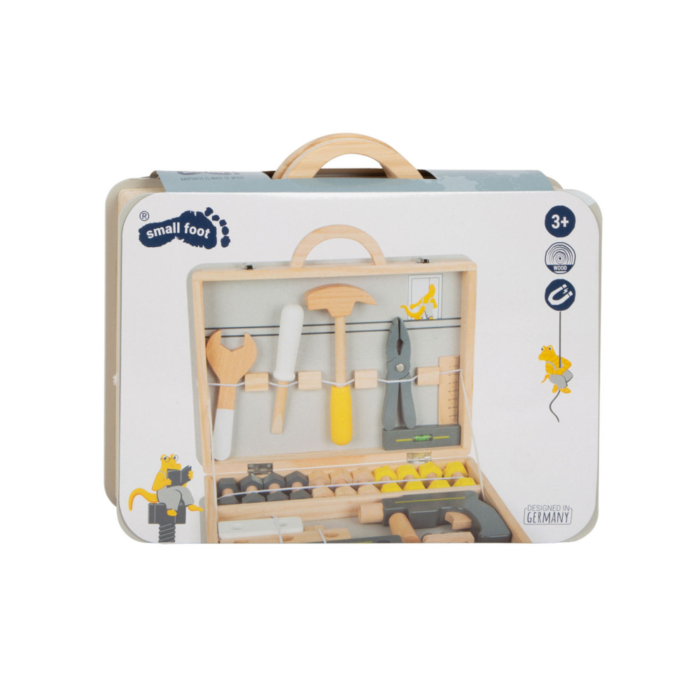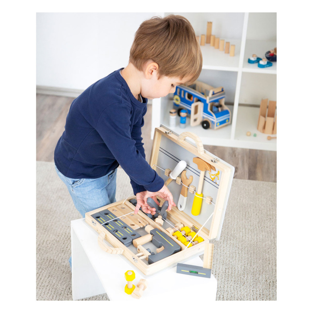Alle mini-klussers opgelet! Met deze houten gereedschapskist in klassieke werkplaatskleuren worden kinderen tijdens het rollenspel echte klussers en klusseressen. De realistische accessoires en gereedschappen, zoals een schrijnwerker met waterpas of een handige elektrische speelgoedboormachine met delen die kunnen worden verwisseld met behulp van magneten, bevorderen het speelplezier en de motivatie voor nieuwe bouwprojecten! De flexibele elastische banden in de gereedschapskist houden het gereedschap onderweg op hun plaats. Het zichtbare houten materiaal van het speelgoed past goed bij de werkplaatslook en de onopvallende illustraties van de drukke “miniwobs” zullen de fantasie van kinderen inspireren. De accessoires en gereedschappen omvatten 1 hamer, 1 schroevendraaier, 1 schroevendraaier, 1 tang, 1 waterpas, 11 schroeven, 11 moeren, 1 draadloze elektrische schroevendraaier, 3 bits, 4 grote boorgaten, 4 middelgrote boorgaten, 4 kleine boorgaten. Met de clipsluitingen kan alles veilig worden opgeborgen en met het houten handvat is de gereedschapskist klaar voor de volgende klus. Het past goed bij het thema van de workshop dankzij de intense maar onopvallende kleurstelling.