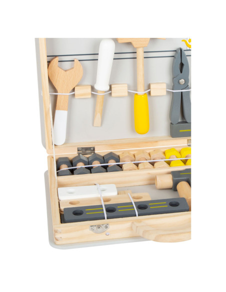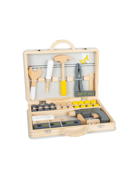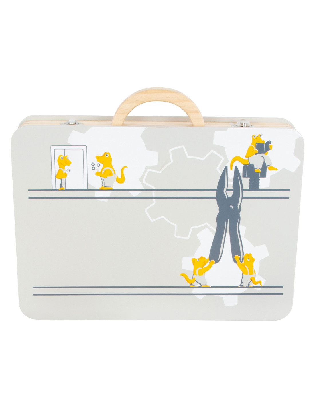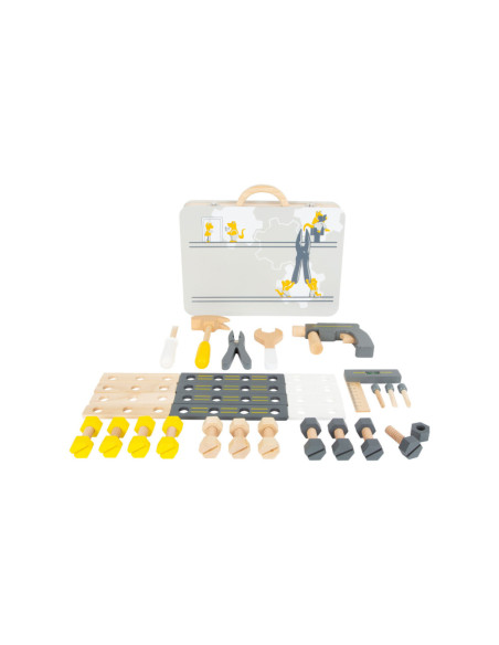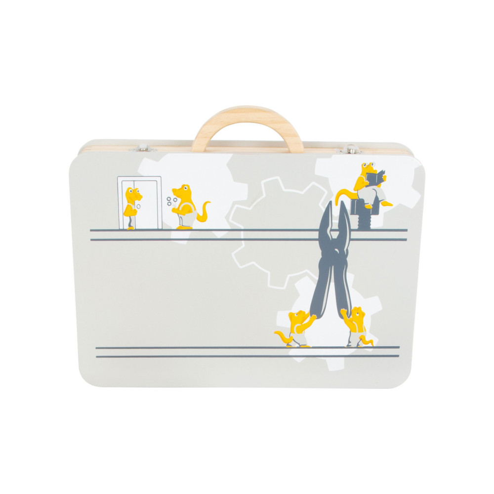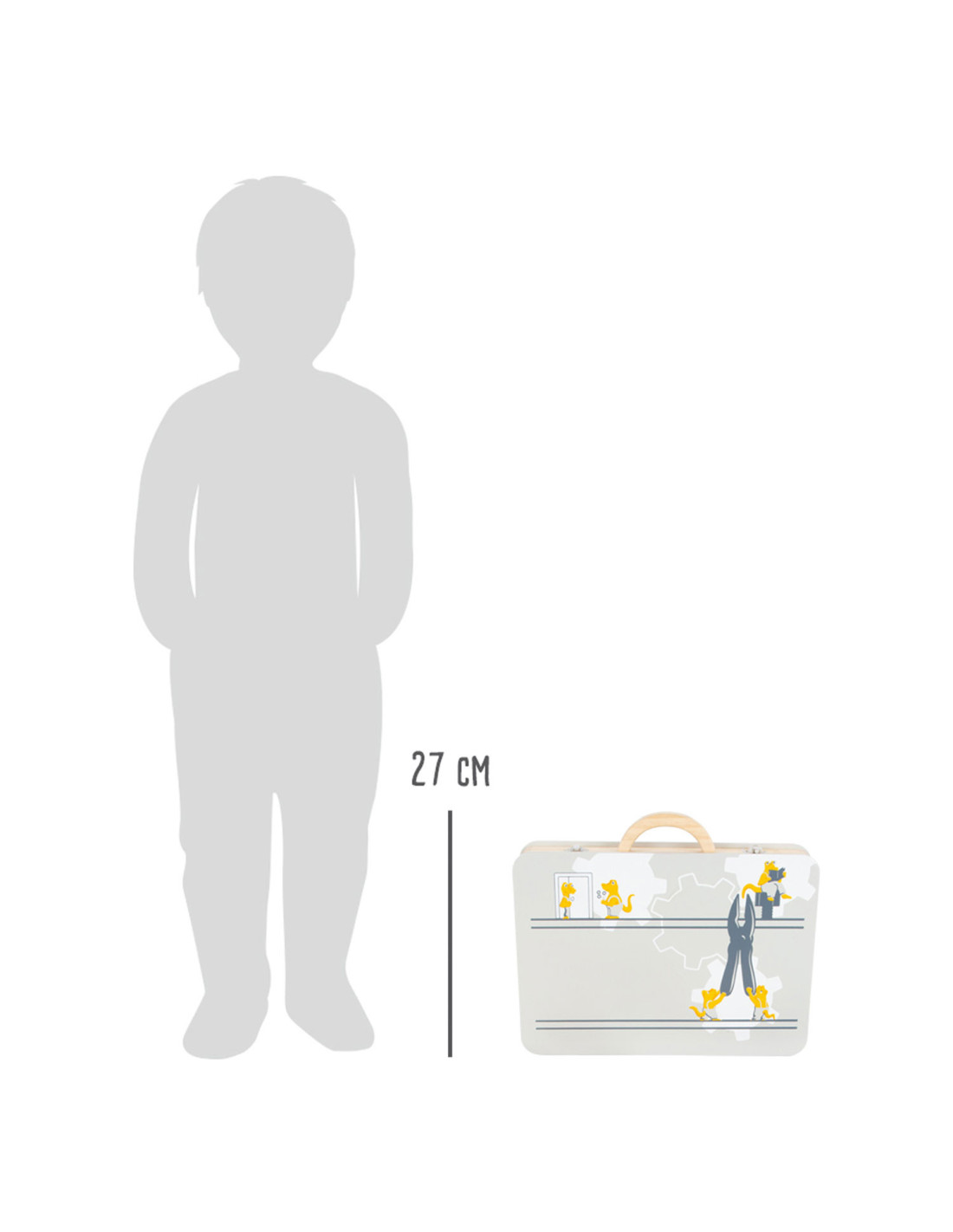 Alle mini-klussers opgelet! Met deze houten gereedschapskist in klassieke werkplaatskleuren worden kinderen tijdens het rollenspel echte klussers en klusseressen. De realistische accessoires en gereedschappen, zoals een schrijnwerker met waterpas of een handige elektrische speelgoedboormachine met delen die kunnen worden verwisseld met behulp van magneten, bevorderen het speelplezier en de motivatie voor nieuwe bouwprojecten! De flexibele elastische banden in de gereedschapskist houden het gereedschap onderweg op hun plaats. Het zichtbare houten materiaal van het speelgoed past goed bij de werkplaatslook en de onopvallende illustraties van de drukke “miniwobs” zullen de fantasie van kinderen inspireren. De accessoires en gereedschappen omvatten 1 hamer, 1 schroevendraaier, 1 schroevendraaier, 1 tang, 1 waterpas, 11 schroeven, 11 moeren, 1 draadloze elektrische schroevendraaier, 3 bits, 4 grote boorgaten, 4 middelgrote boorgaten, 4 kleine boorgaten. Met de clipsluitingen kan alles veilig worden opgeborgen en met het houten handvat is de gereedschapskist klaar voor de volgende klus. Het past goed bij het thema van de workshop dankzij de intense maar onopvallende kleurstelling.