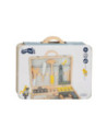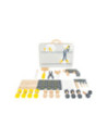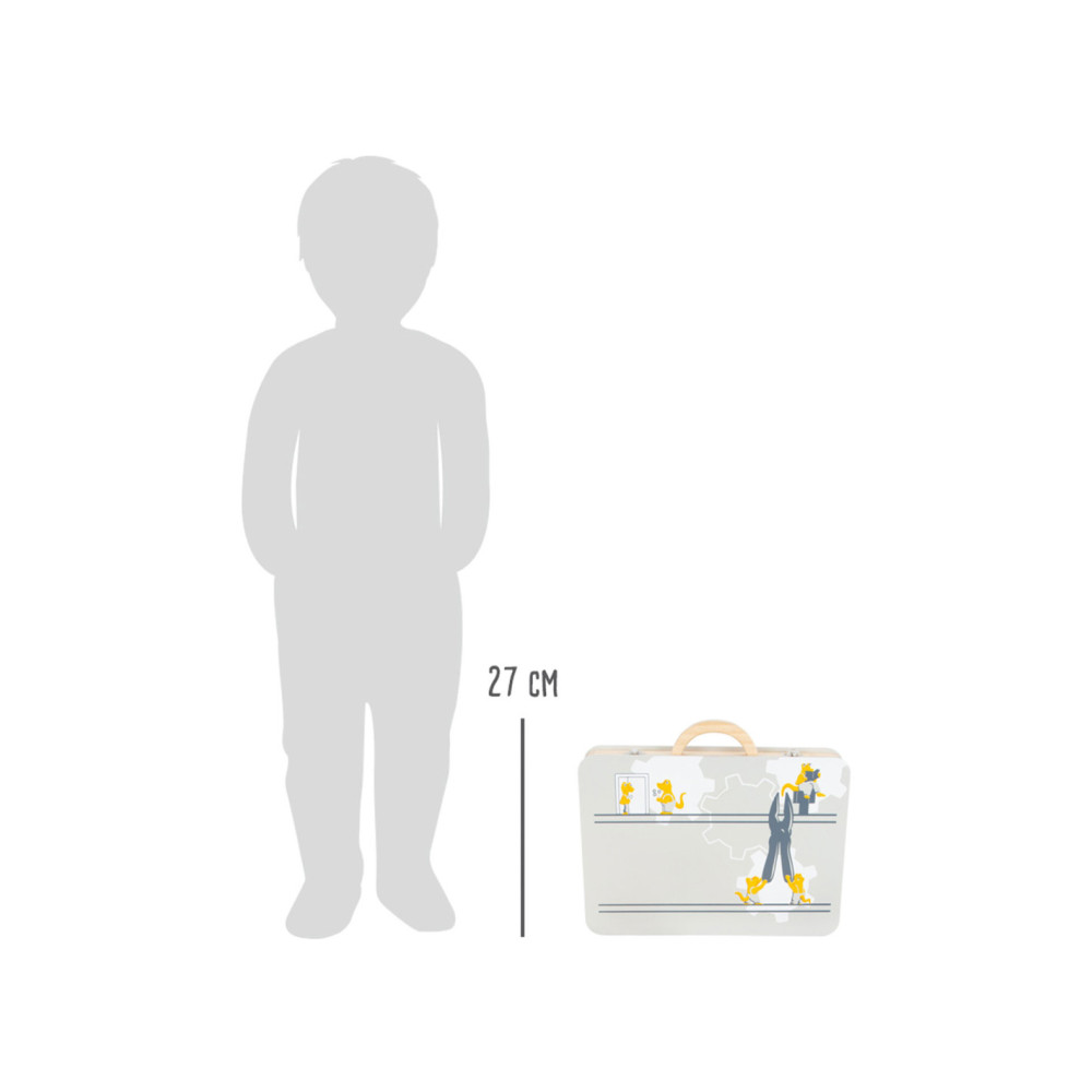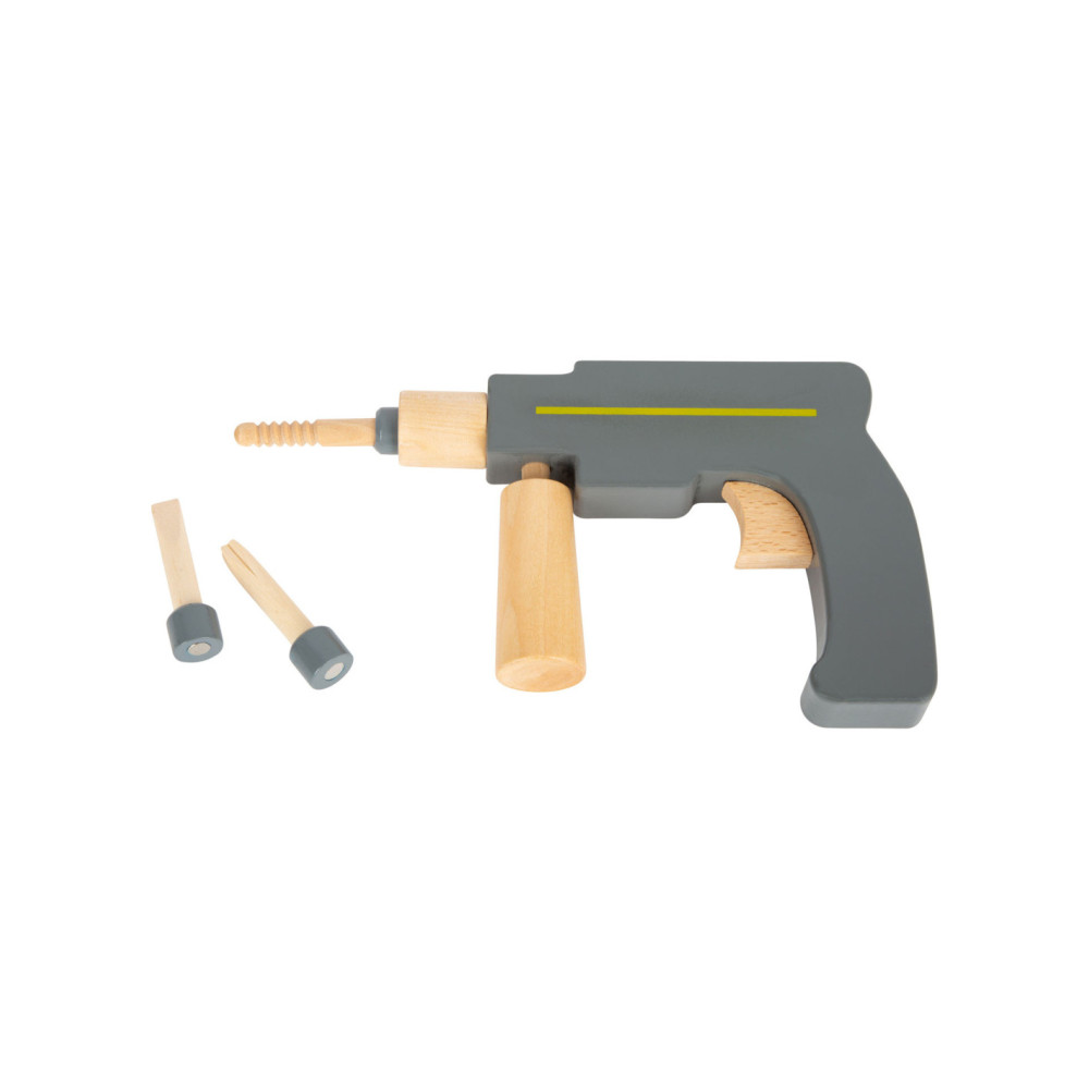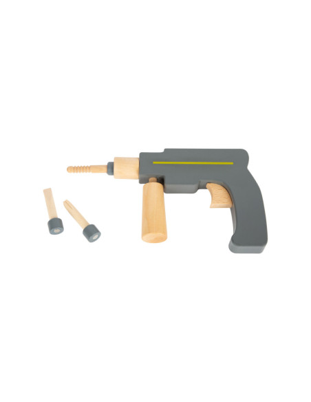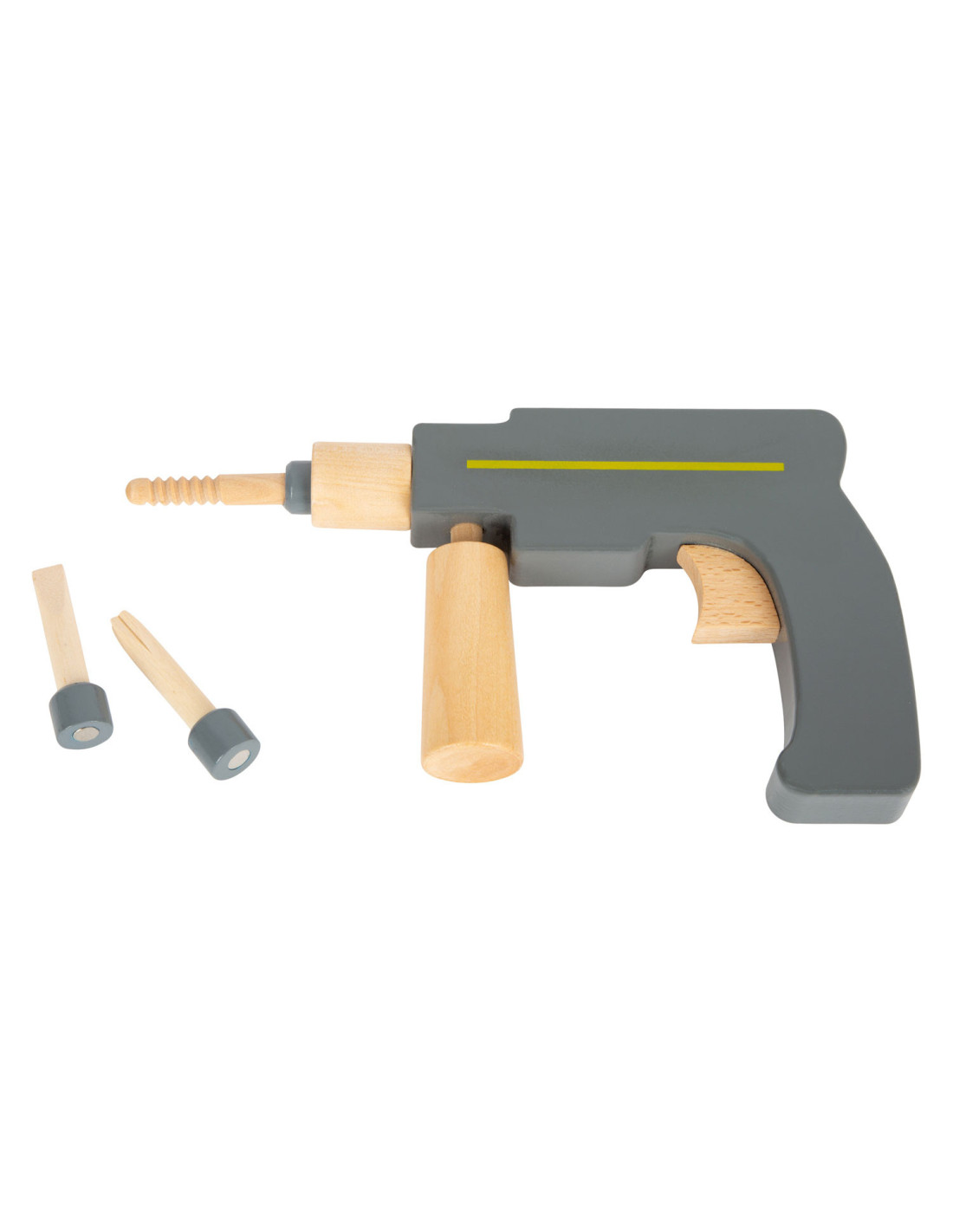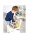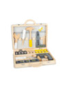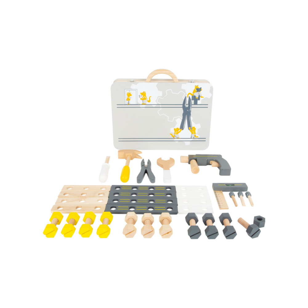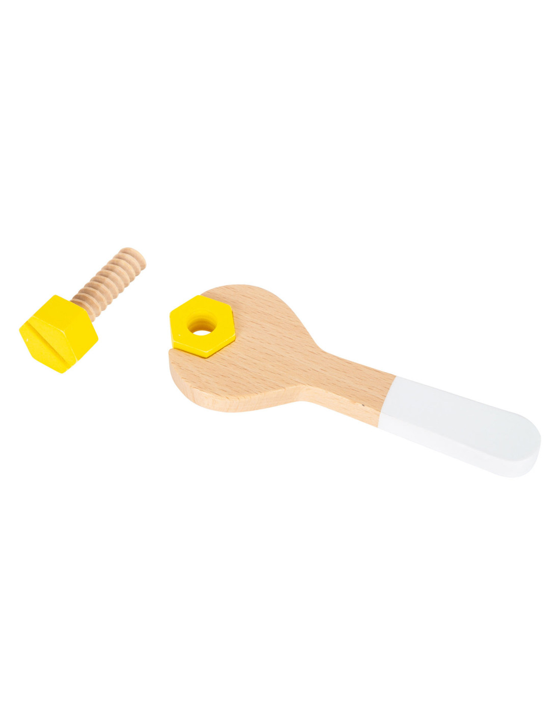 Alle mini-klussers opgelet! Met deze houten gereedschapskist in klassieke werkplaatskleuren worden kinderen tijdens het rollenspel echte klussers en klusseressen. De realistische accessoires en gereedschappen, zoals een schrijnwerker met waterpas of een handige elektrische speelgoedboormachine met delen die kunnen worden verwisseld met behulp van magneten, bevorderen het speelplezier en de motivatie voor nieuwe bouwprojecten! De flexibele elastische banden in de gereedschapskist houden het gereedschap onderweg op hun plaats. Het zichtbare houten materiaal van het speelgoed past goed bij de werkplaatslook en de onopvallende illustraties van de drukke “miniwobs” zullen de fantasie van kinderen inspireren. De accessoires en gereedschappen omvatten 1 hamer, 1 schroevendraaier, 1 schroevendraaier, 1 tang, 1 waterpas, 11 schroeven, 11 moeren, 1 draadloze elektrische schroevendraaier, 3 bits, 4 grote boorgaten, 4 middelgrote boorgaten, 4 kleine boorgaten. Met de clipsluitingen kan alles veilig worden opgeborgen en met het houten handvat is de gereedschapskist klaar voor de volgende klus. Het past goed bij het thema van de workshop dankzij de intense maar onopvallende kleurstelling.