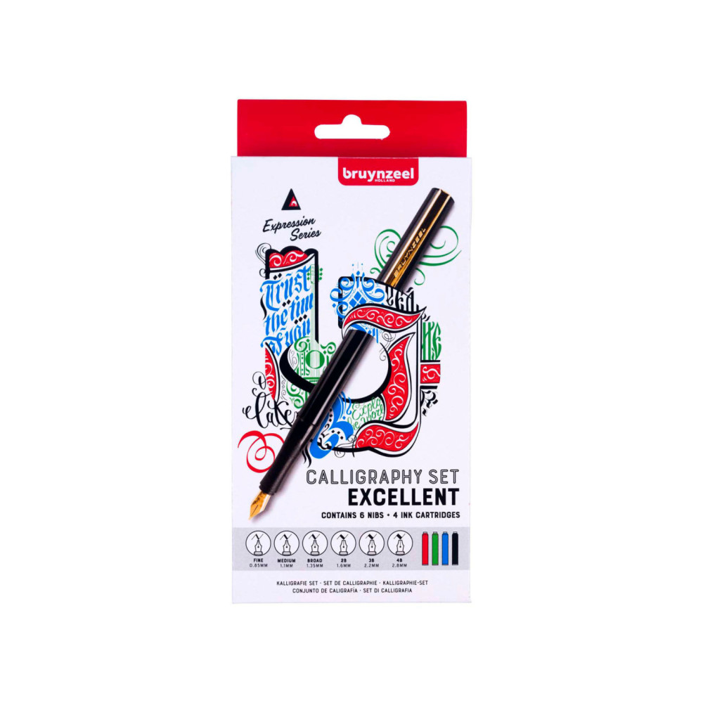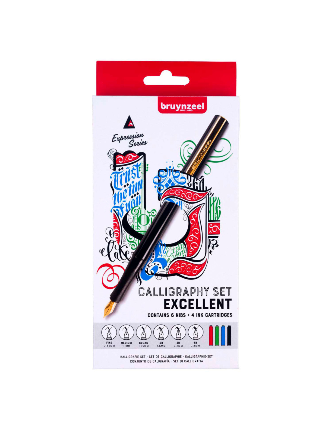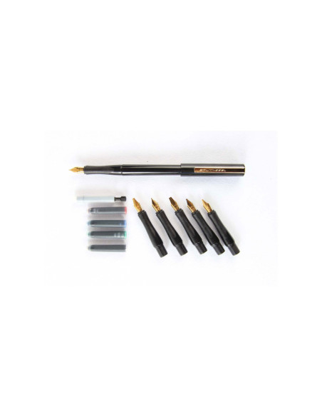 Deze complete set bevat alles wat je nodig hebt voor het beoefenen van kalligrafie en handletteren. De set bevat een vulpen, 6 verschillende messing penpunten (fijn, medium, breed, 2B, 3B en 4B), 4 gekleurde inktpatronen, 4 doppen voor de patronen en een inktconverter voor gebruik met inkt uit flacons. Maak in een handomdraai prachtige kalligrafische werken door de QR-code op de verpakking te scannen voor instructies en andere handige tips en trucs.