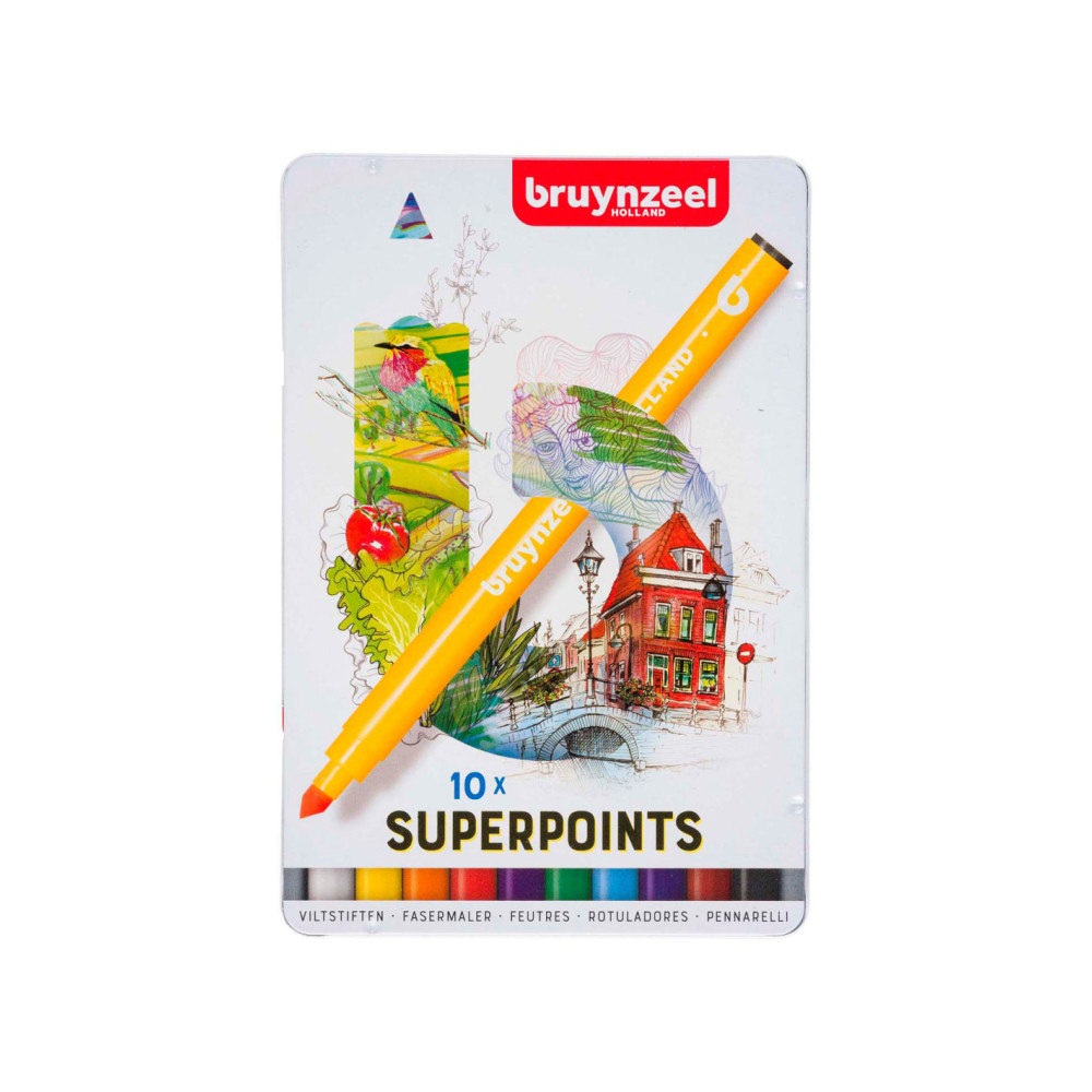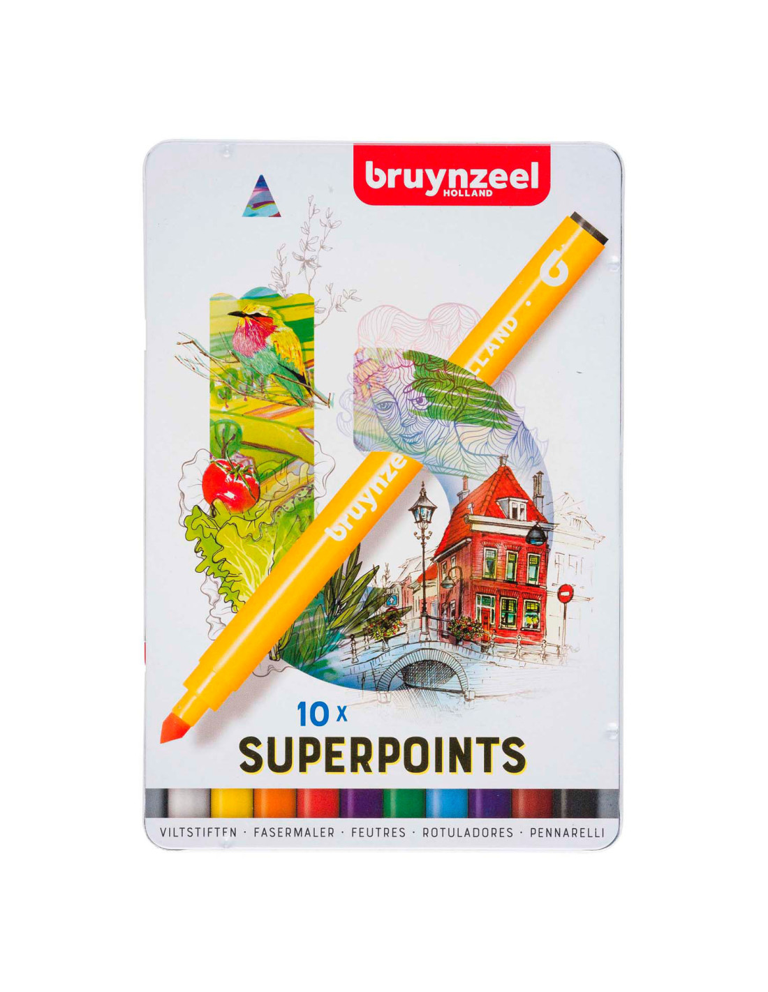 10 Super Point viltstiften in verschillende kleuren in een blik. Inclusief een witte wisstift. De Bruynzeel Super Point vilstiften zijn perfect voor creatieve volwassenen voor het maken van mandala's, bijhouden van een bullet journal en kleuren voor volwassenen! met de speciale punt, die niet kan worden ingedrukt, kun je zowel dikke als dunne lijnen kleuren. met de witte stift kun je elk deel van de tekening 'bedekken', zodat je niet per ongeluk een andere kleur gebruikt. De inkt kan van de huid worden gewassen en is uitwasbaar uit de meeste textielsoorten (een vlek kan eerst met de witte stift worden behandeld). De verpakking bevat 14 fineliners in verschillende kleuren en een witte wisstift. Glutenvrij.