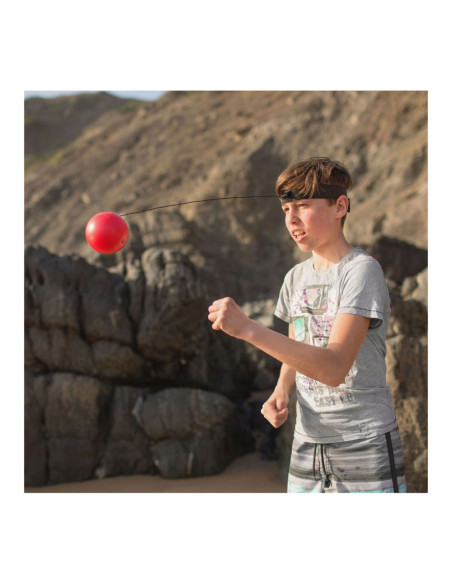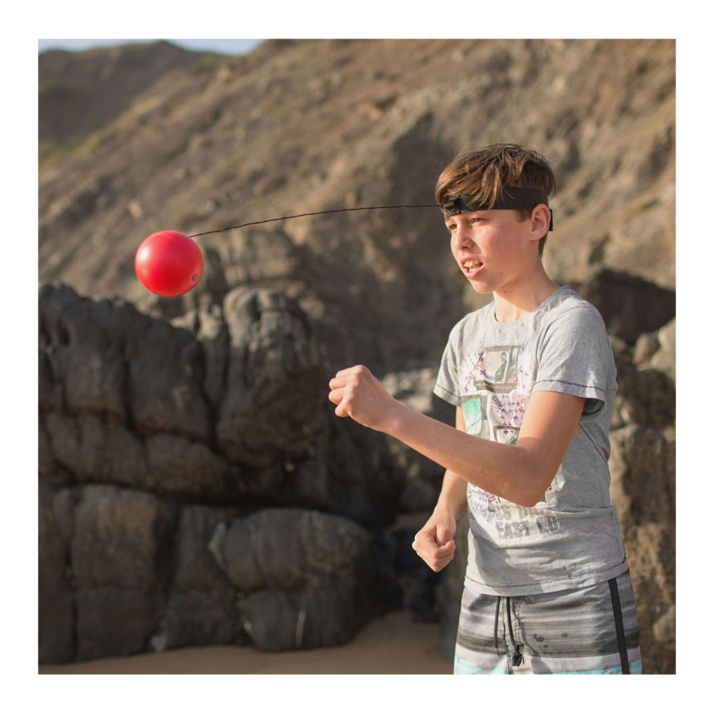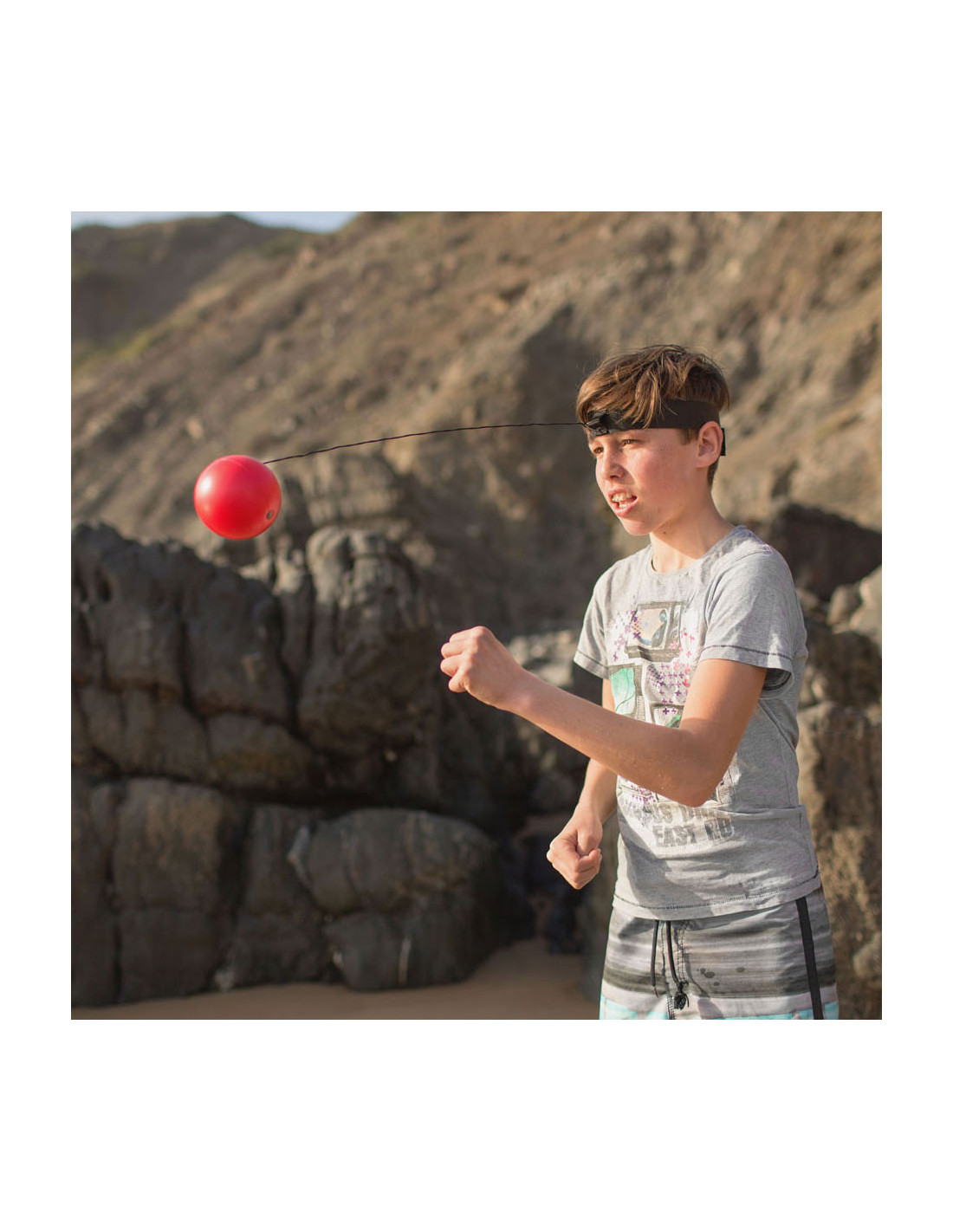 Train je oog-handcoördinatie en reflexen. Doe de band om je hoofd. Probeer nu de bal zo vaak mogelijk achter elkaar te boksen. Door het elastiek keert de bal naar je terug, dus hoe harder je slaat, hoe harder hij terugkomt.