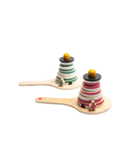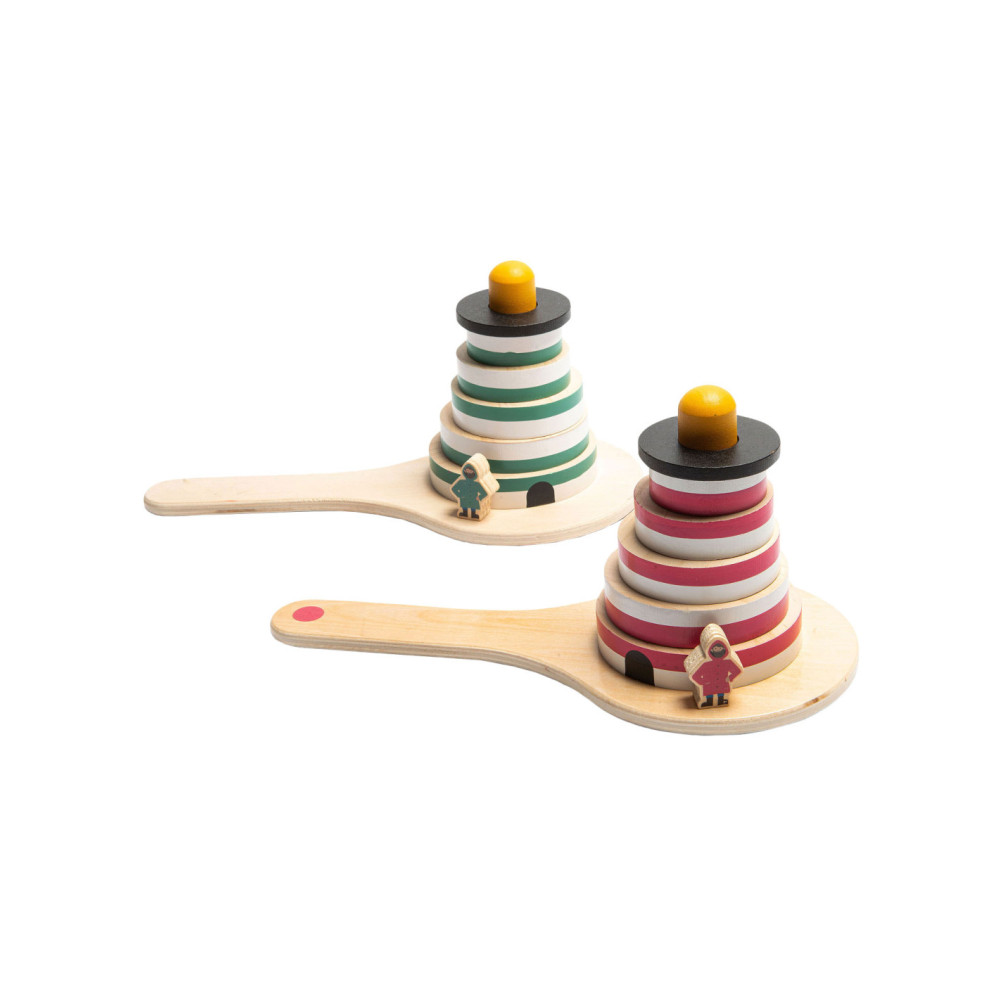 Regels: Ga me beide spelers bij de rackets staan en neem er ieder een. Draai de rackets om zodat je ziet met welke kleur je speelt. (A) Bouw nu zo snel mogelijk de vuurtoren in die kleur. Onderdeel voor onderdeel en van groot naar klein. Vergeet ook de vuurtorenwachter niet!