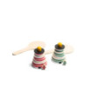 Voorbereiding: Leg de rackets op de grond, met de gekleurde stip naar beneden. Doe 5 stappen naar voren en leg hier alle overige houten onderdelen verspreid over de grond.