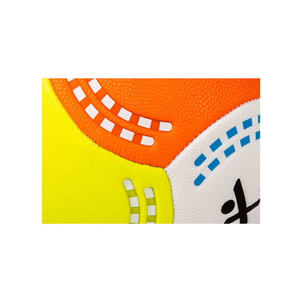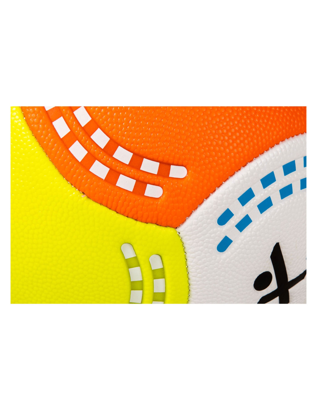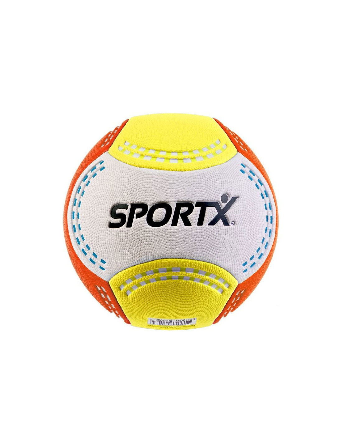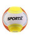 SportX beach mini voetbal, in de kleurencombinatie wit, geel en oranje, met blauwe accenten. Gewicht: 130-150 gram. Materiaal: mat pvc. Diameter: 16 cm. Dikte van de lagen: 2,7 mm. Wordt onopgeblazen geleverd.