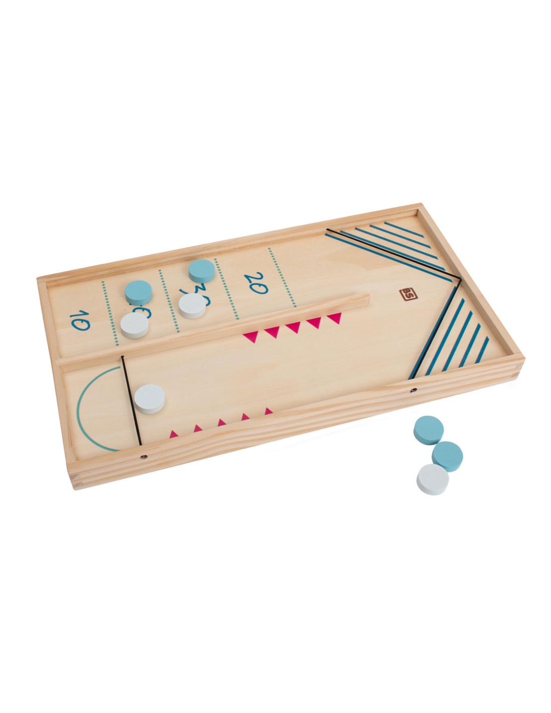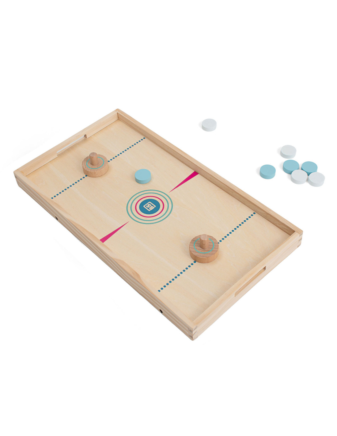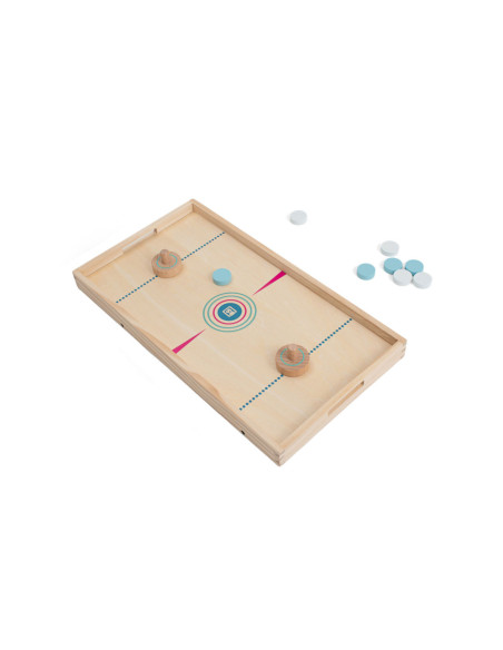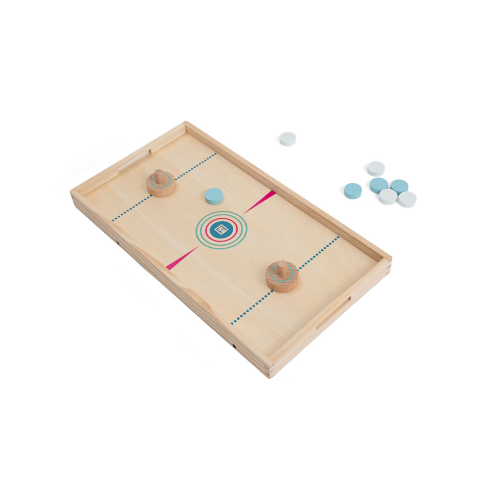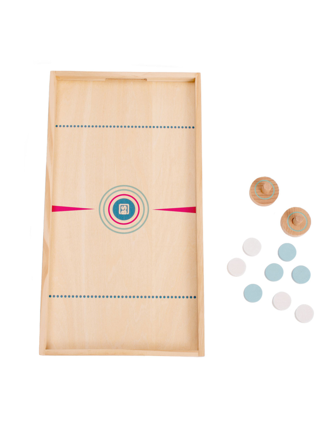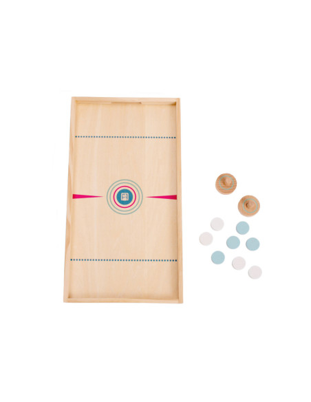 Twee spellen in één! Speel Sling Puck en probeer zoveel mogelijk punten te scoren door de fiches met elastiek te slingeren, of draai het bord om en waag je aan tafelhockey. Dubbelzijdig speelbord, 39x21x3 cm, 10 fiches, diameter 2,5 cm, 2 stoters, 4x4x3 cm.