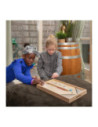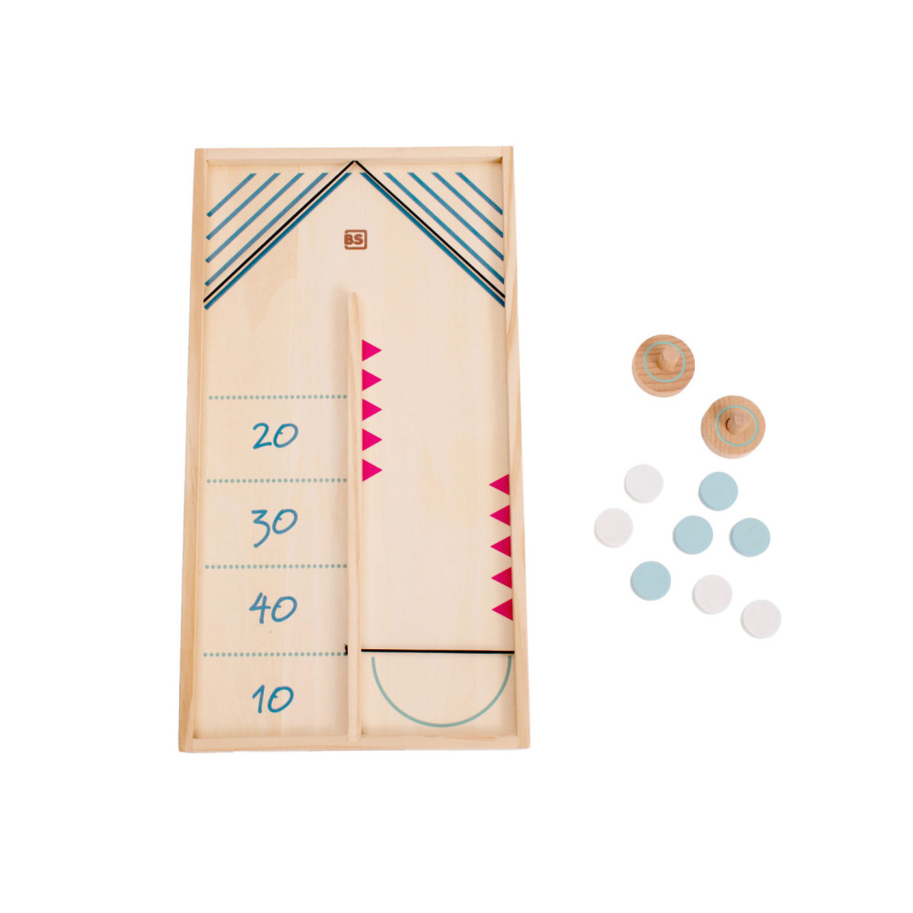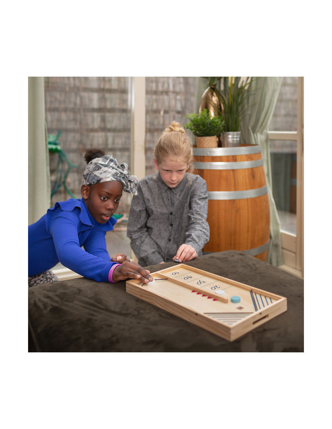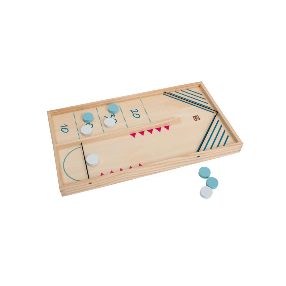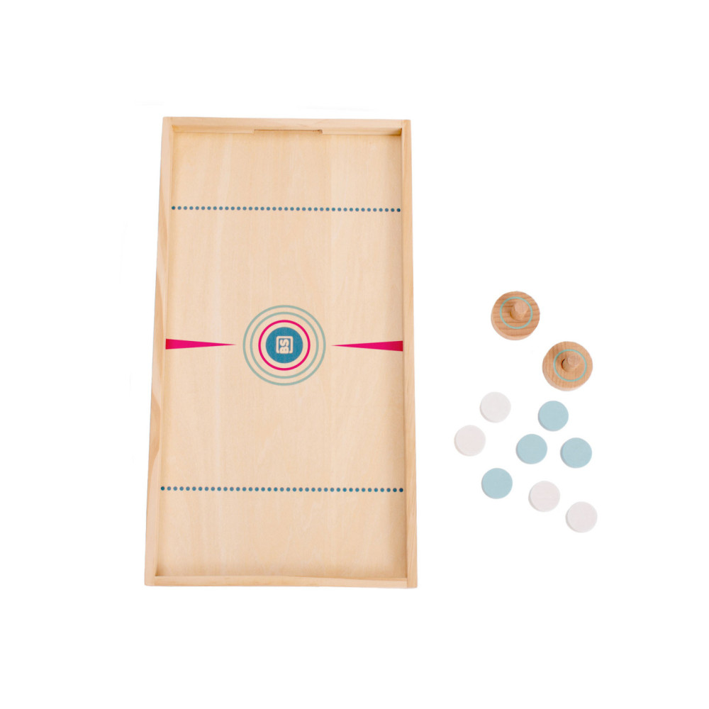 Twee spellen in één! Speel Sling Puck en probeer zoveel mogelijk punten te scoren door de fiches met elastiek te slingeren, of draai het bord om en waag je aan tafelhockey. Dubbelzijdig speelbord, 39x21x3 cm, 10 fiches, diameter 2,5 cm, 2 stoters, 4x4x3 cm.