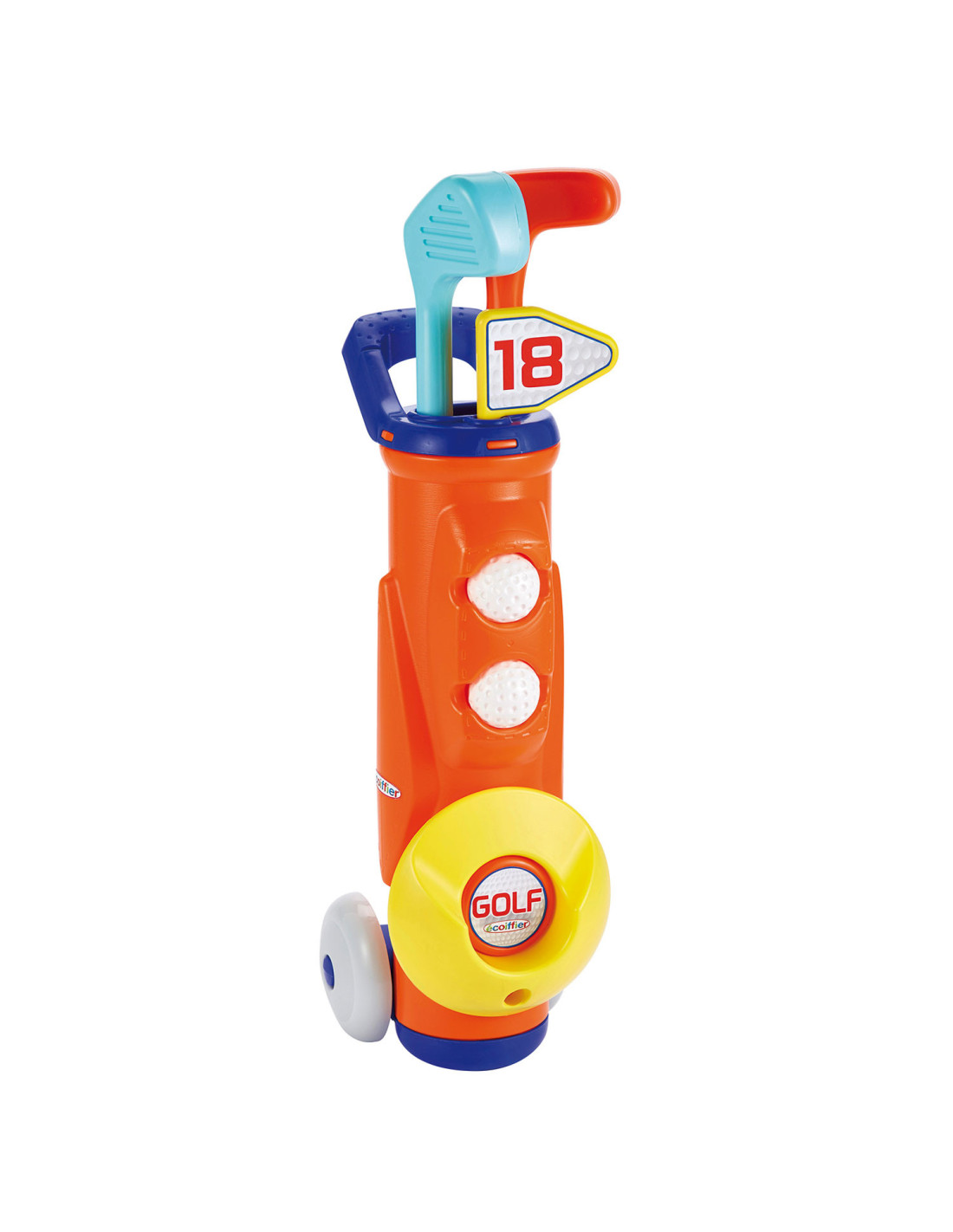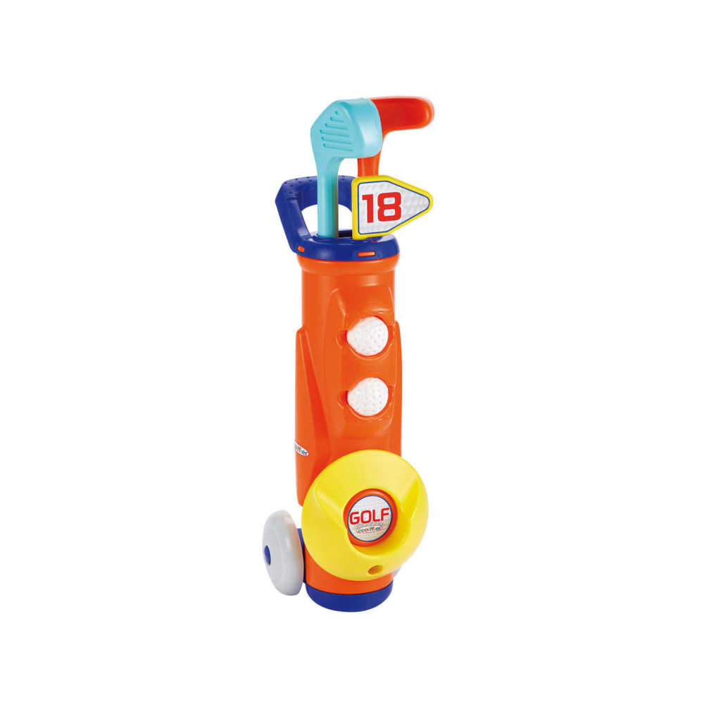 Kunststof golfset in trolley op wieltjes voor kinderen. Inclusief 2 clubs, 2 ballen, een hole en een vlag. Afmetingen: 14,5 x 17 x 51 cm en geschikt vanaf 3 jaar.