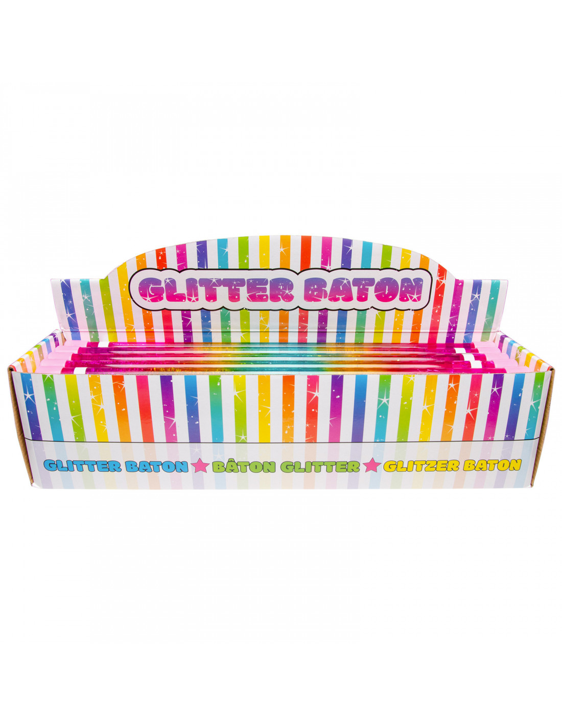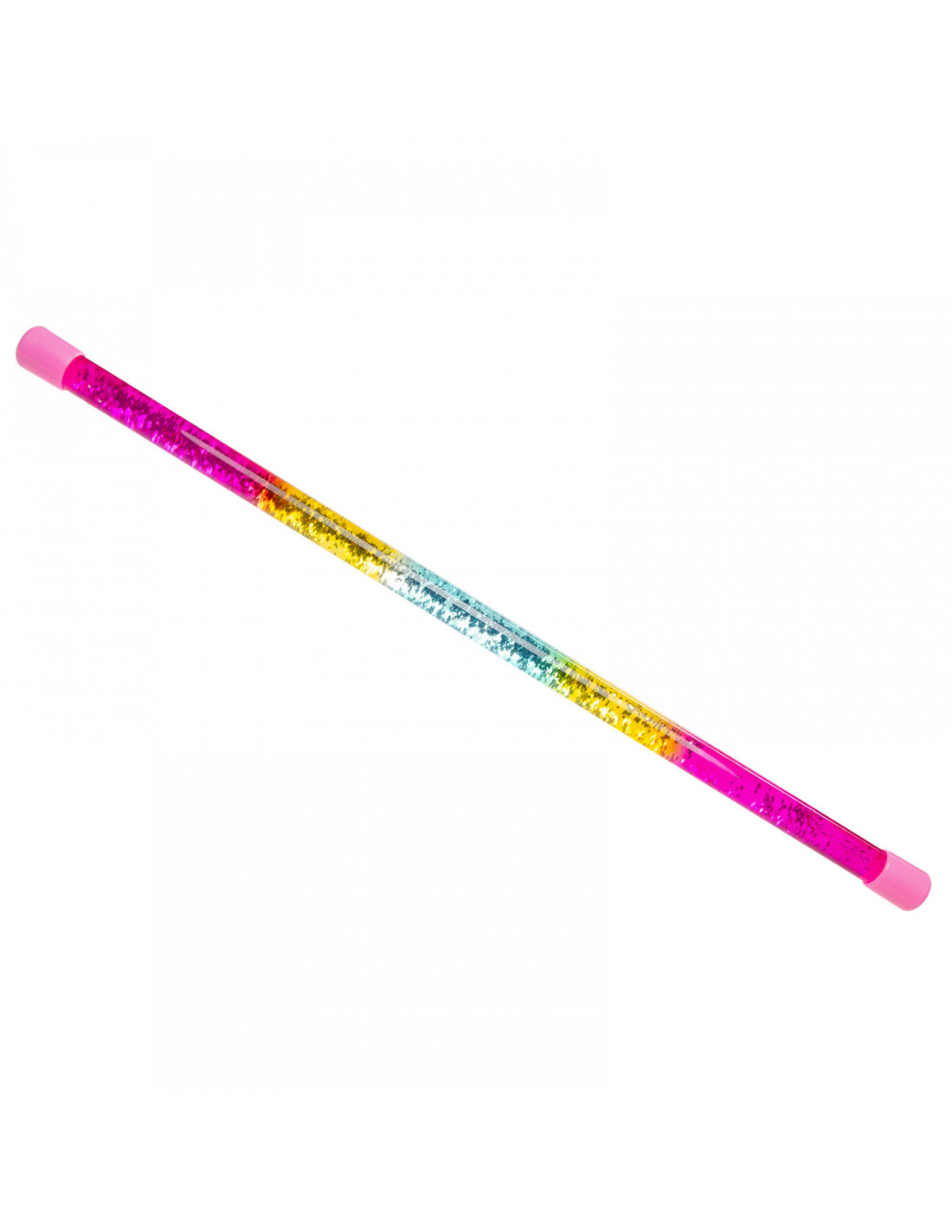 De glitterstaaf is 45 cm lang en heeft een diameter van 2 cm. De prachtige regenboogkleuren gaan naadloos in elkaar over, van roze naar geel en blauw. De glitterstaaf is gemaakt van kunststof en is gevuld met water en glitters. Hierdoor ziet de glitterstaaf er niet alleen fantastisch uit, maar beweegt hij ook nog eens sierlijk mee tijdens het spelen.