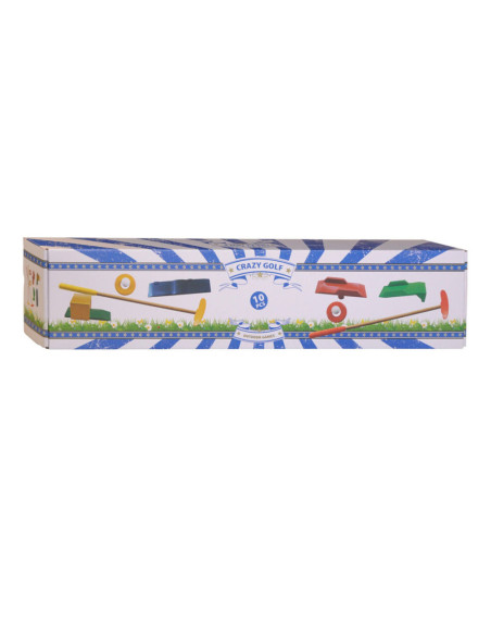 10-delige minigolfset van hout. Inhoud: 2 golfclubs, 2 ballen, 4 hindernissen en 2 putjes. Geschikt voor kinderen vanaf 5 jaar.