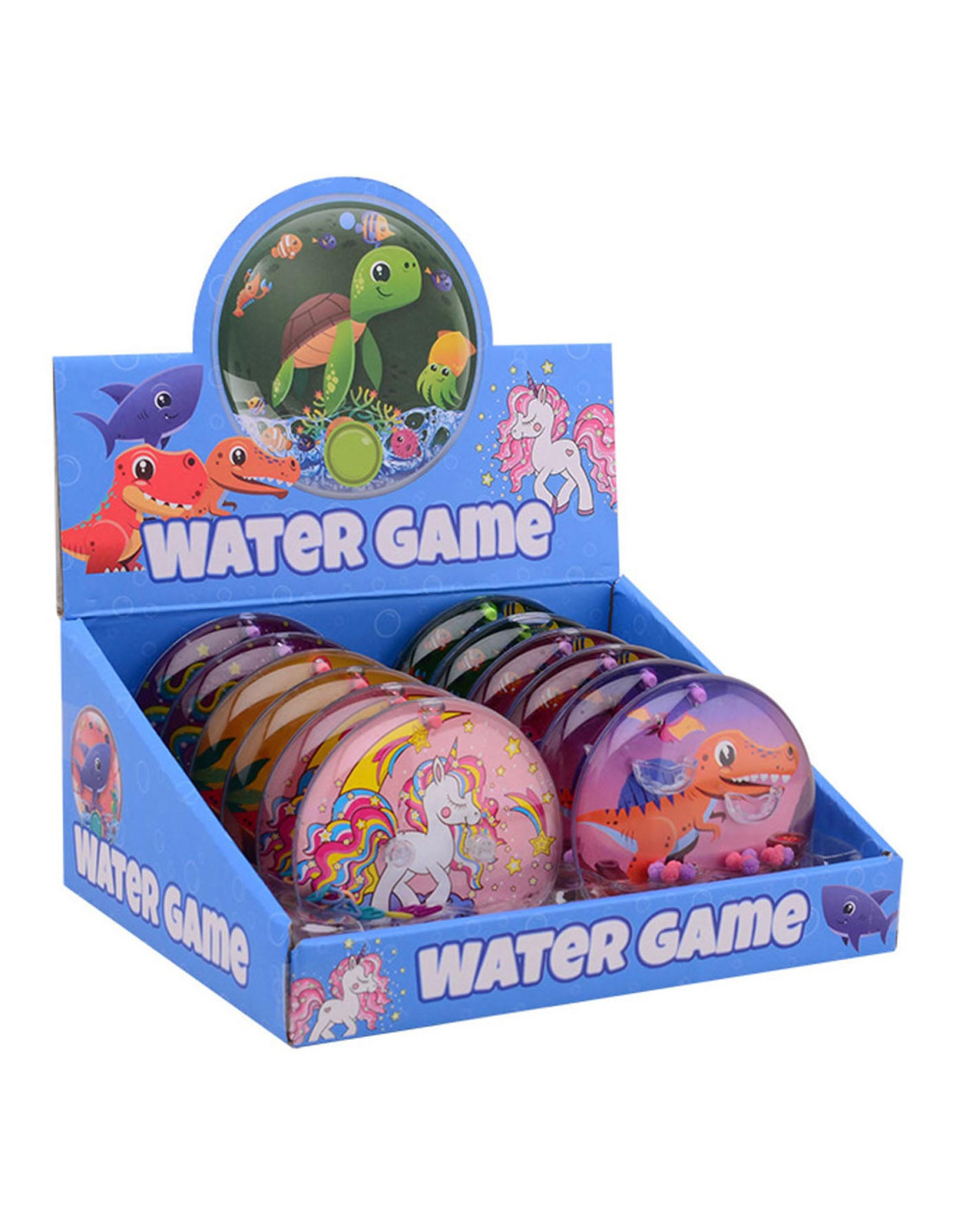 Doos met 12 waterspelletjes met kleurrijke dierenpatronen erop. Druk op de ronde knop om het water, en daarmee de gekleurde ringetjes, in beweging te brengen. In de doos zitten 12 spelletjes met 6 verschillende printjes per doos, ideaal als uitdeelcadeautje op scholen en kinderopvang. Geschikt vanaf 3 jaar oud. Afmetingen: 9,5 x 9,5 x 3 centimeter.