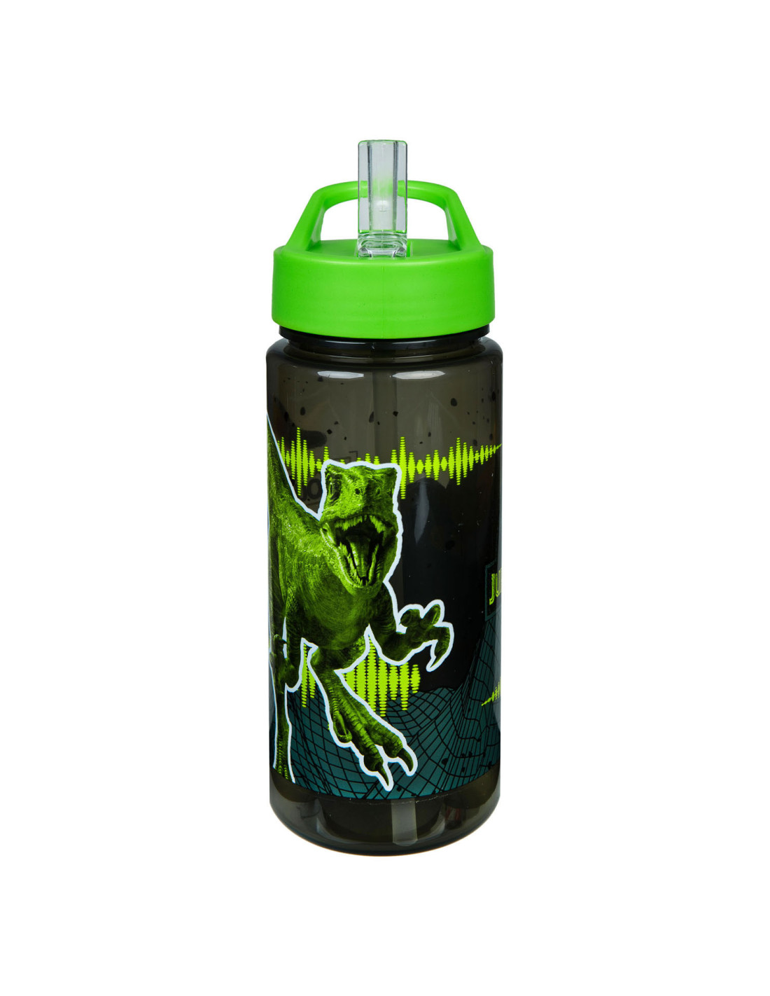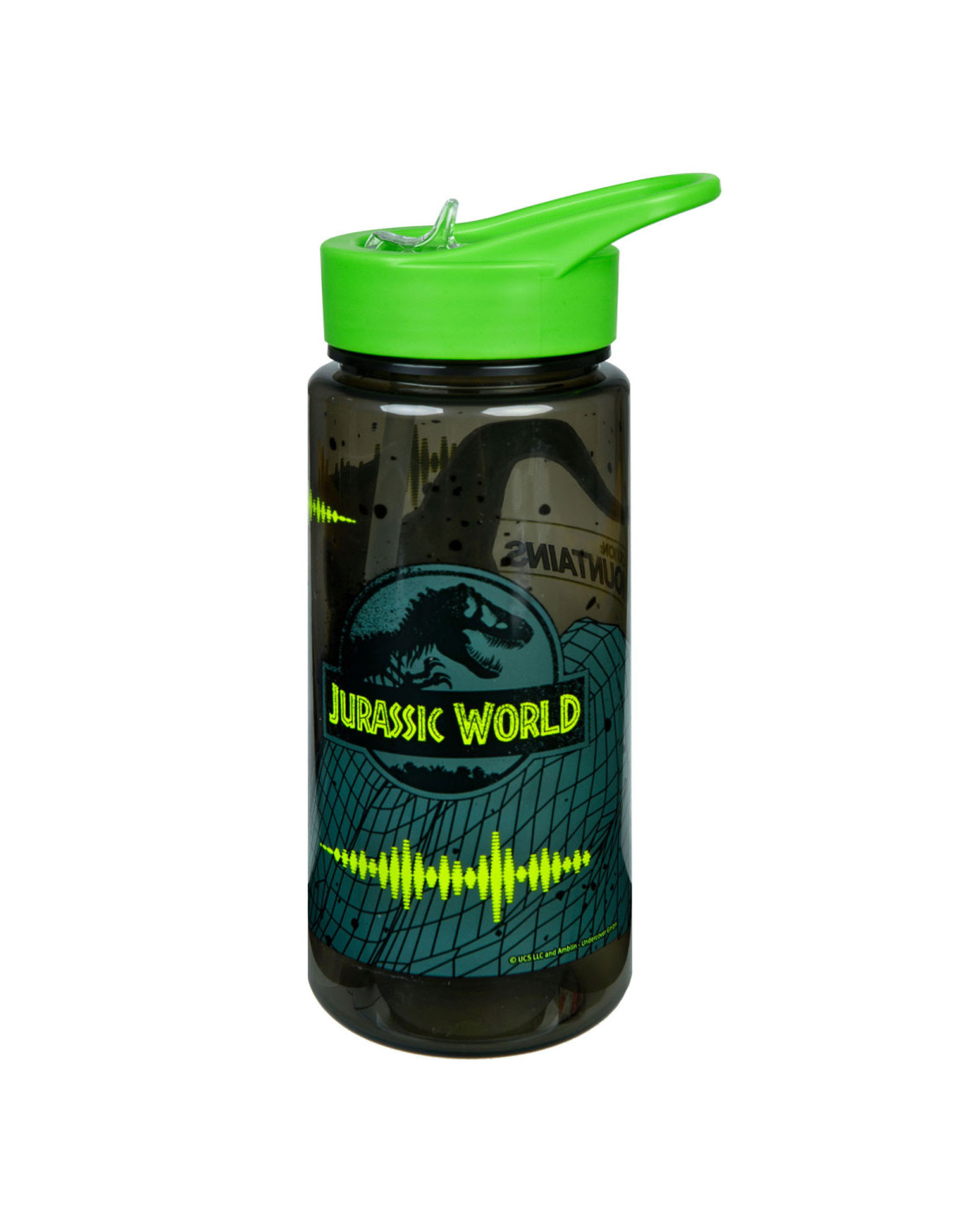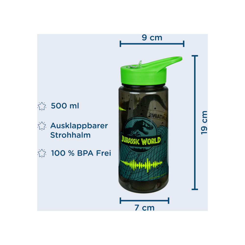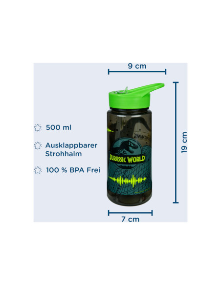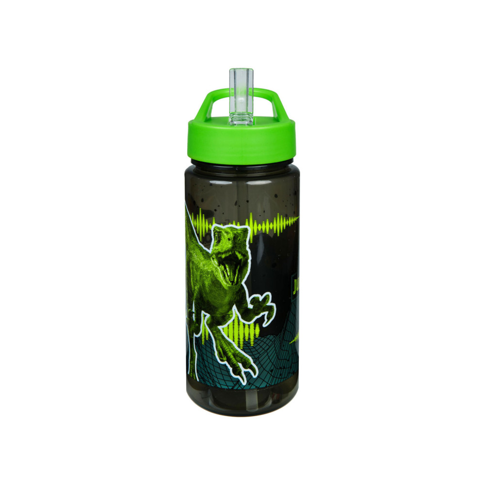 Zwart/groene Jurassic World-drinkfles met geïntegreerd rietje en een drinktuit. Afmetingen: 19 x 7 centimeter. Inhoud: 500ml. 100% BPA-vrij.