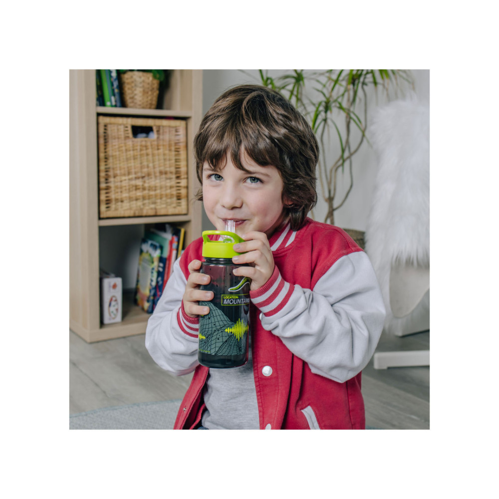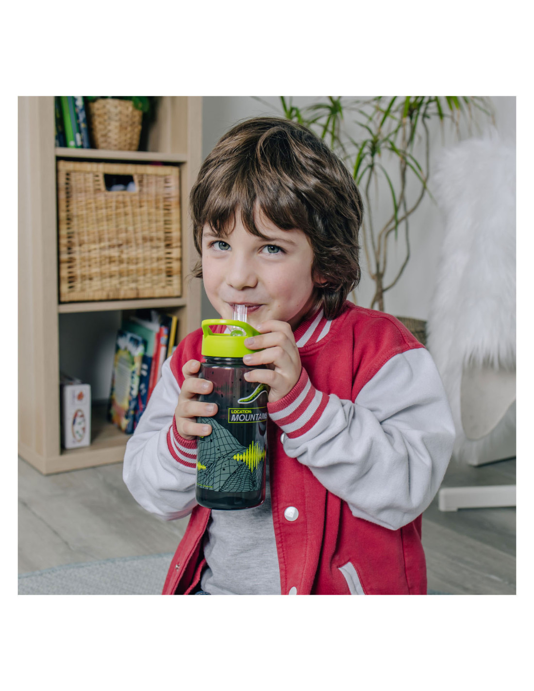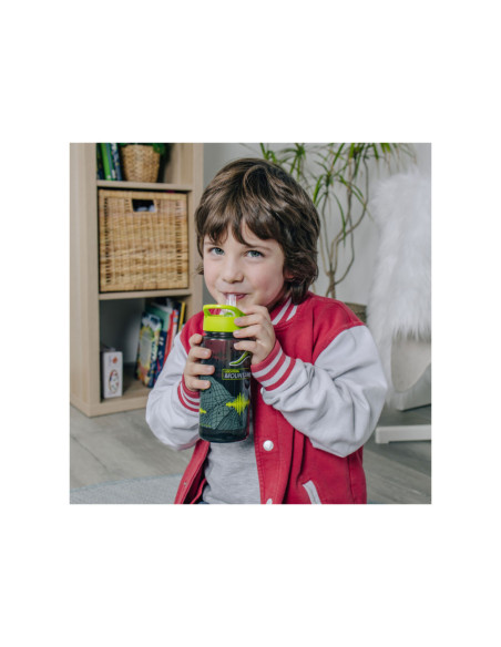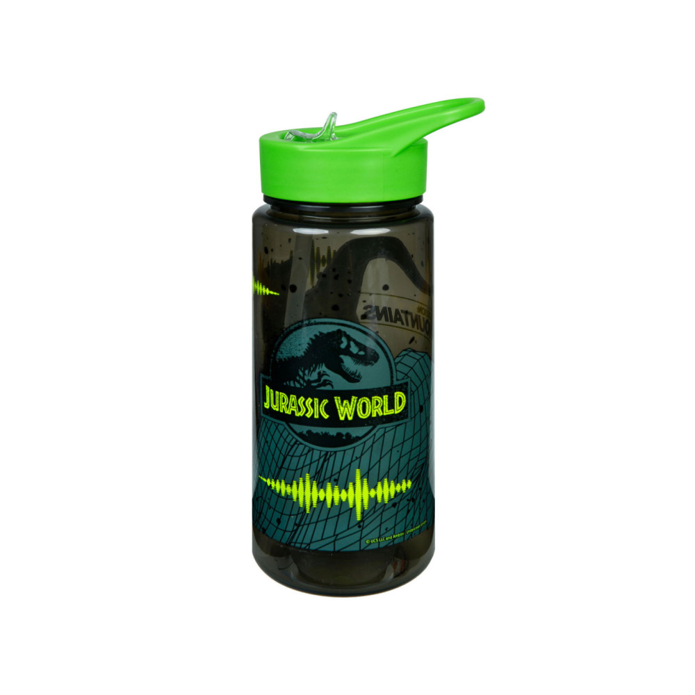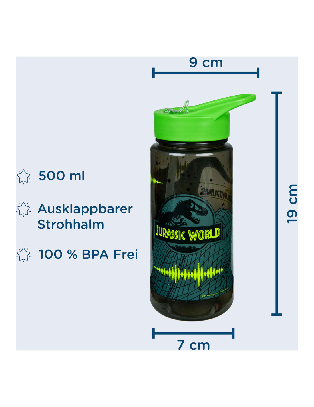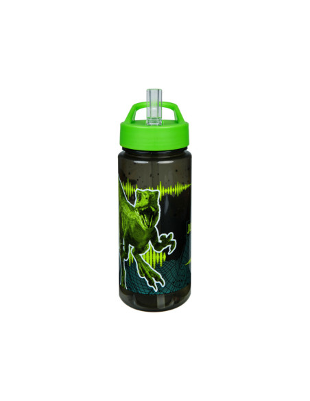 Zwart/groene Jurassic World-drinkfles met geïntegreerd rietje en een drinktuit. Afmetingen: 19 x 7 centimeter. Inhoud: 500ml. 100% BPA-vrij.