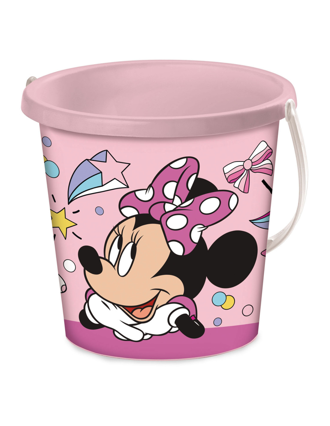 Roze emmertje met Minnie Mouse erop afgebeeld en allerlei leuke gekleurde figuren. Diameter: 17 cm.