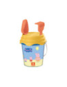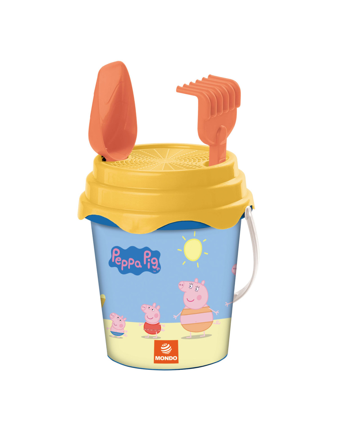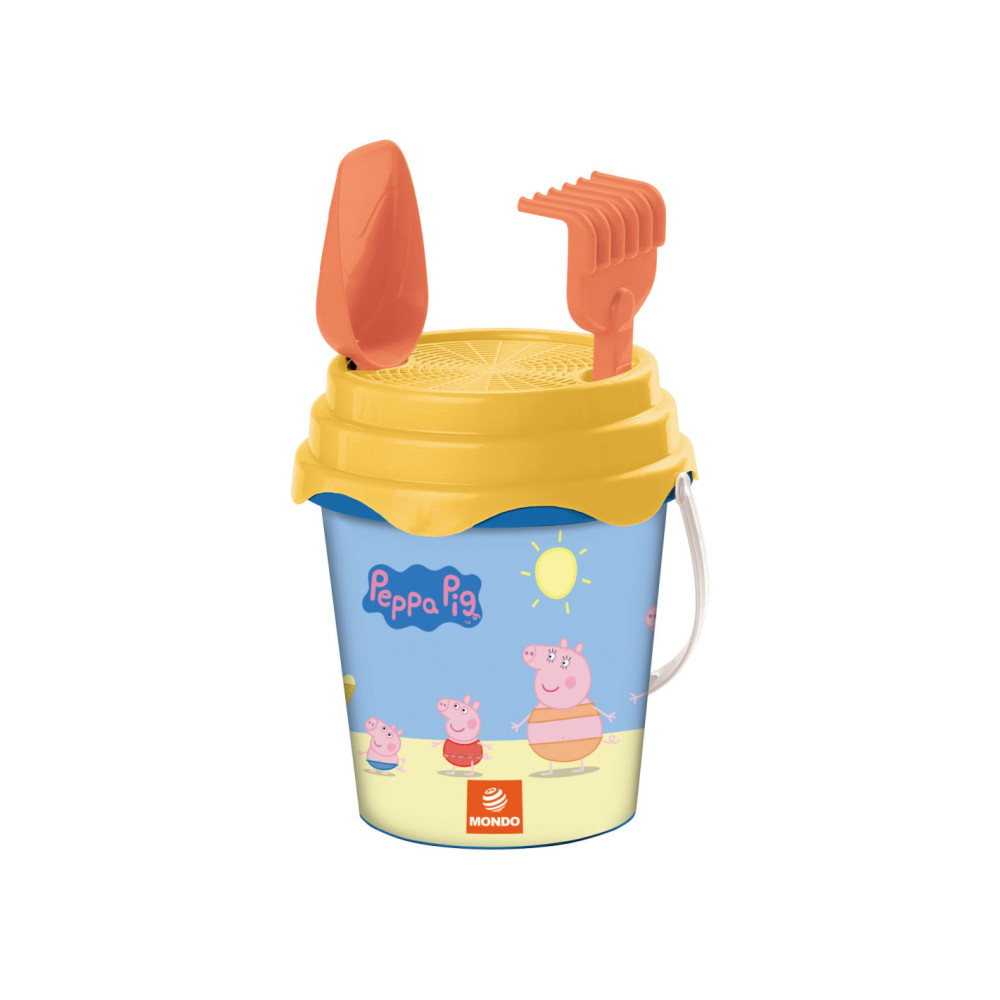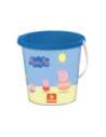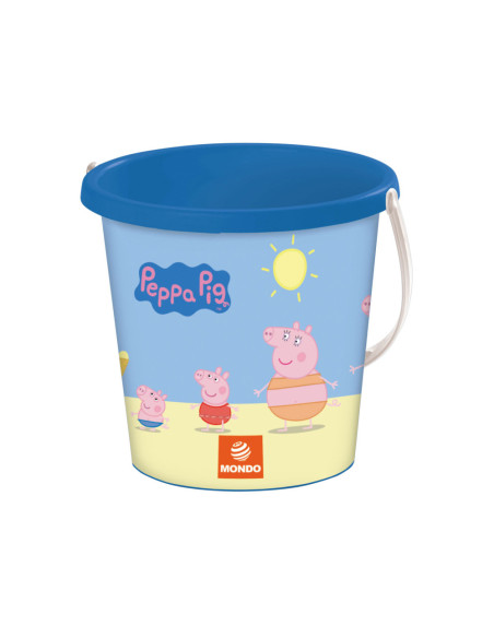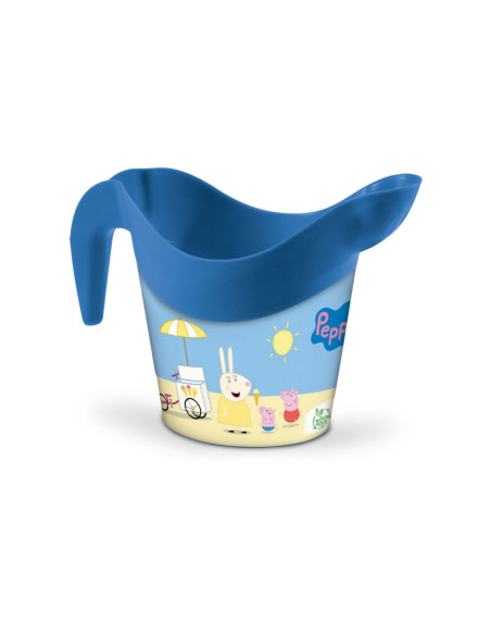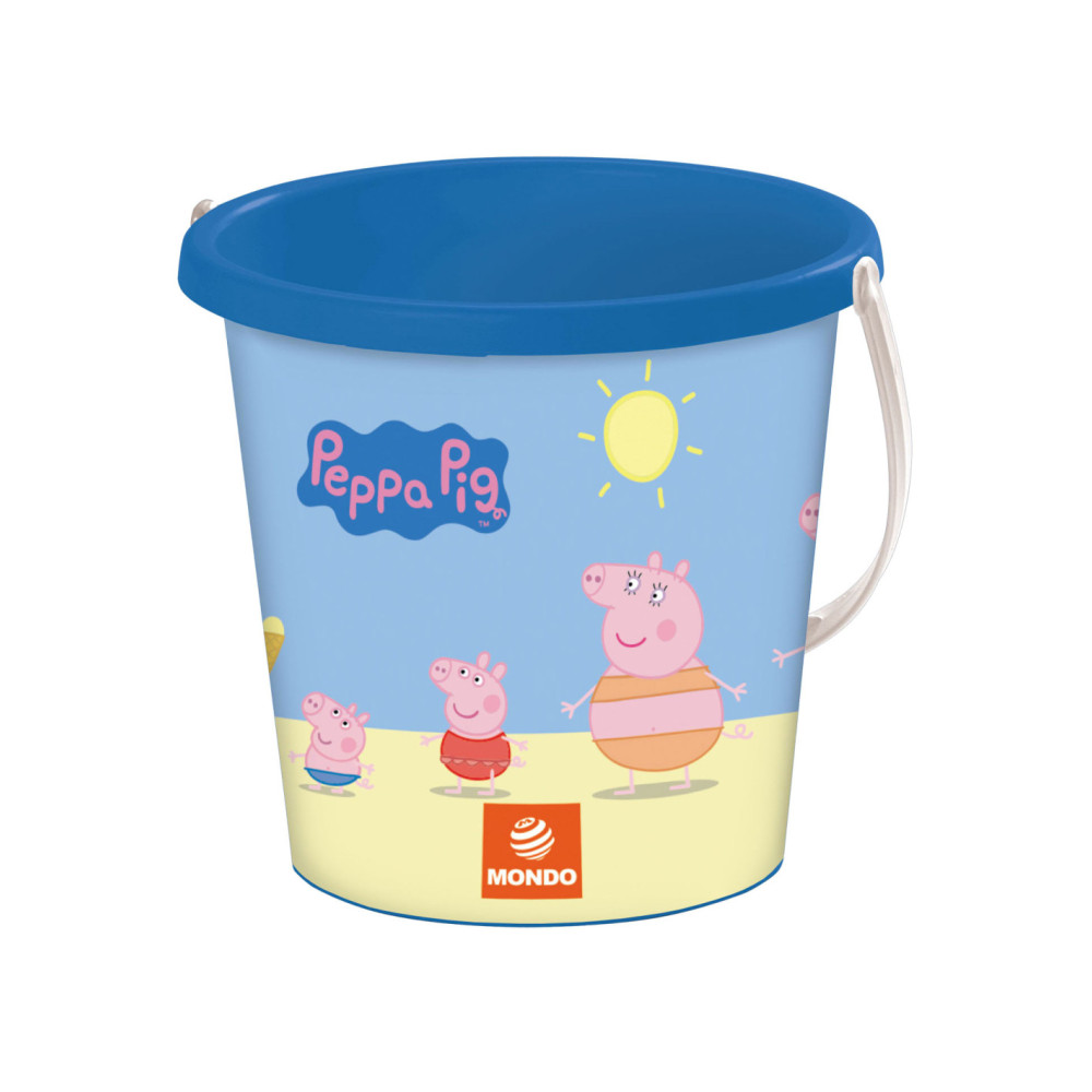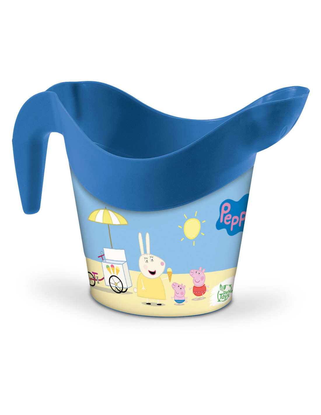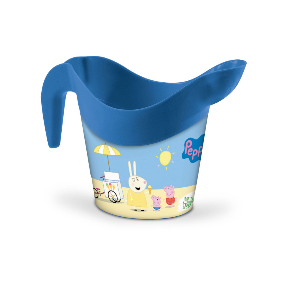 Emmertje met afbeelding van Peppa Big, George en papa en mama op het strand. Diameter: 17 centimeter.