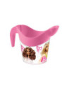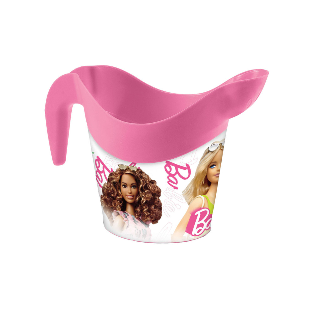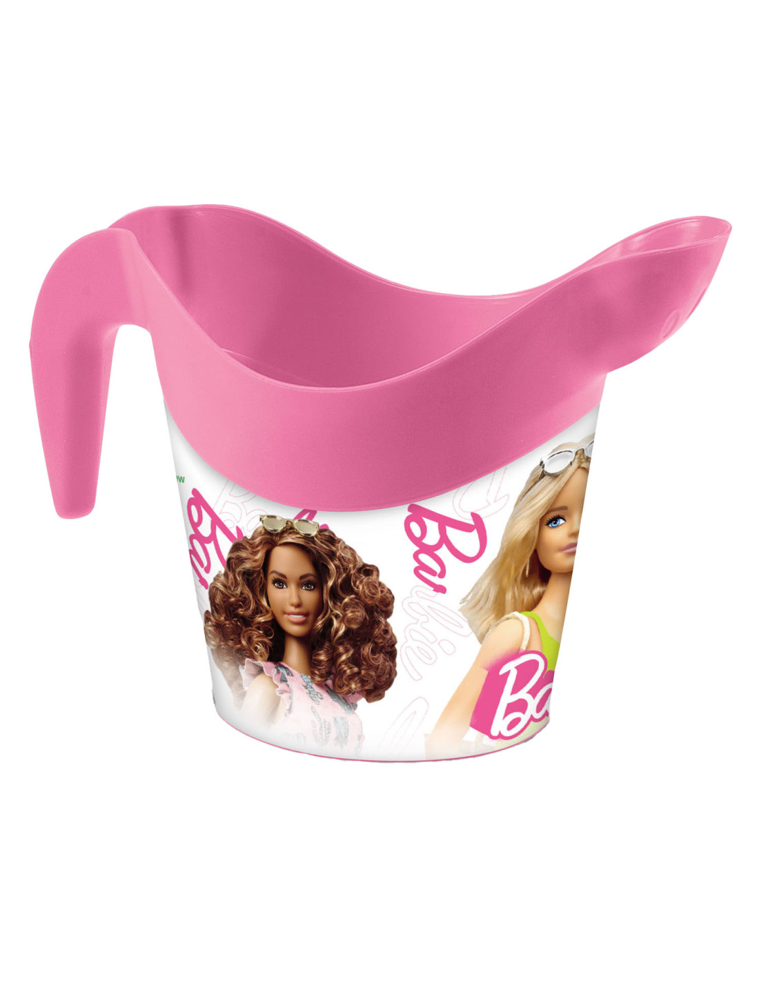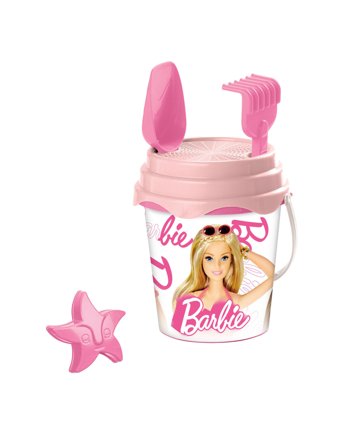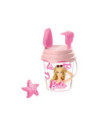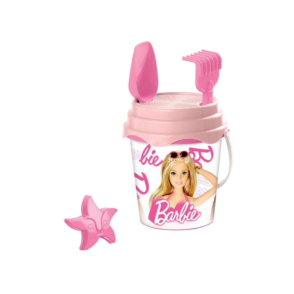 Barbie strandset. Emmer met deksel, zand vormpjes, schep, hark en gieter. Alles roze en/of wit gekleurd met afbeeldingen van Barbie. Diameter van de emmer is 17 centimeter.