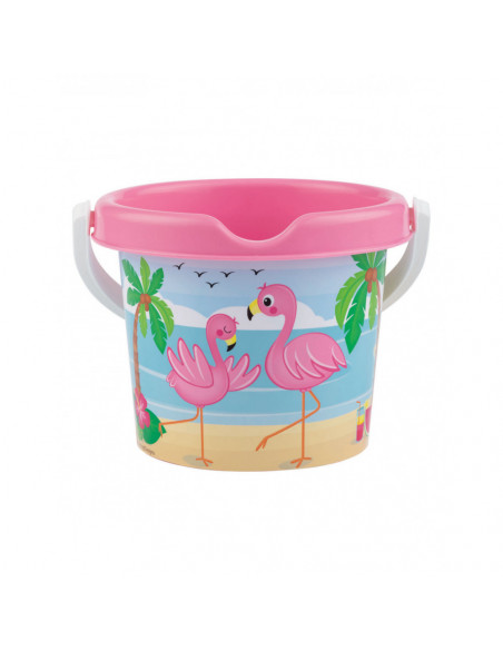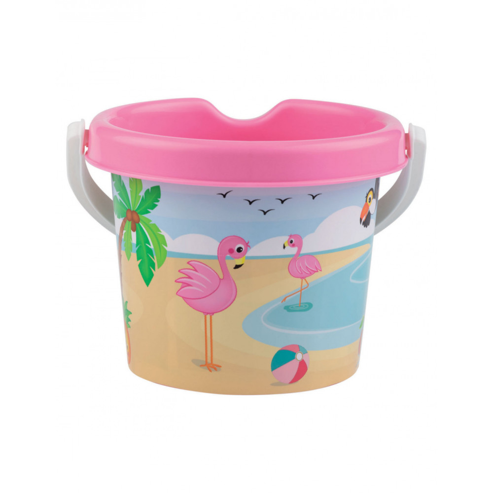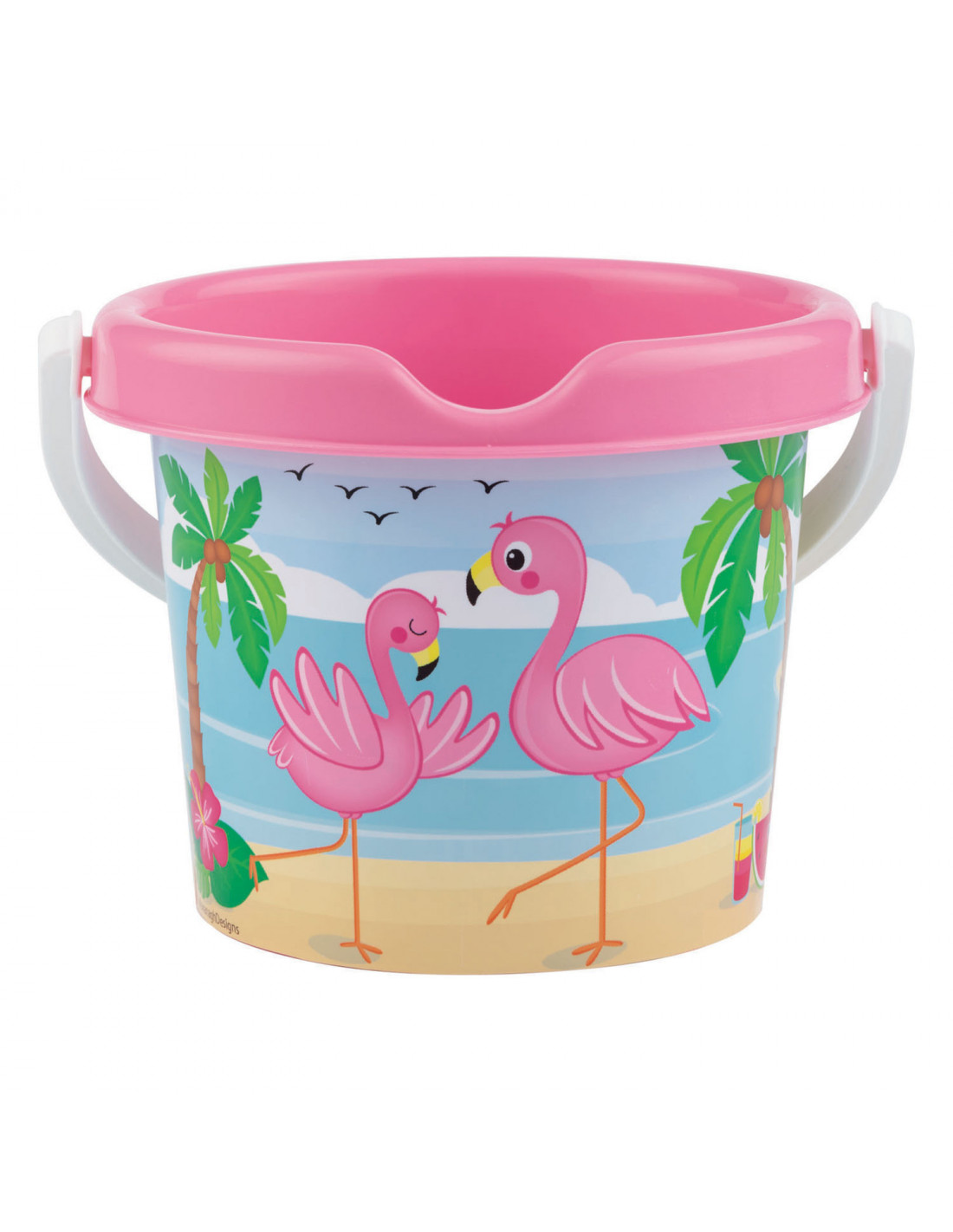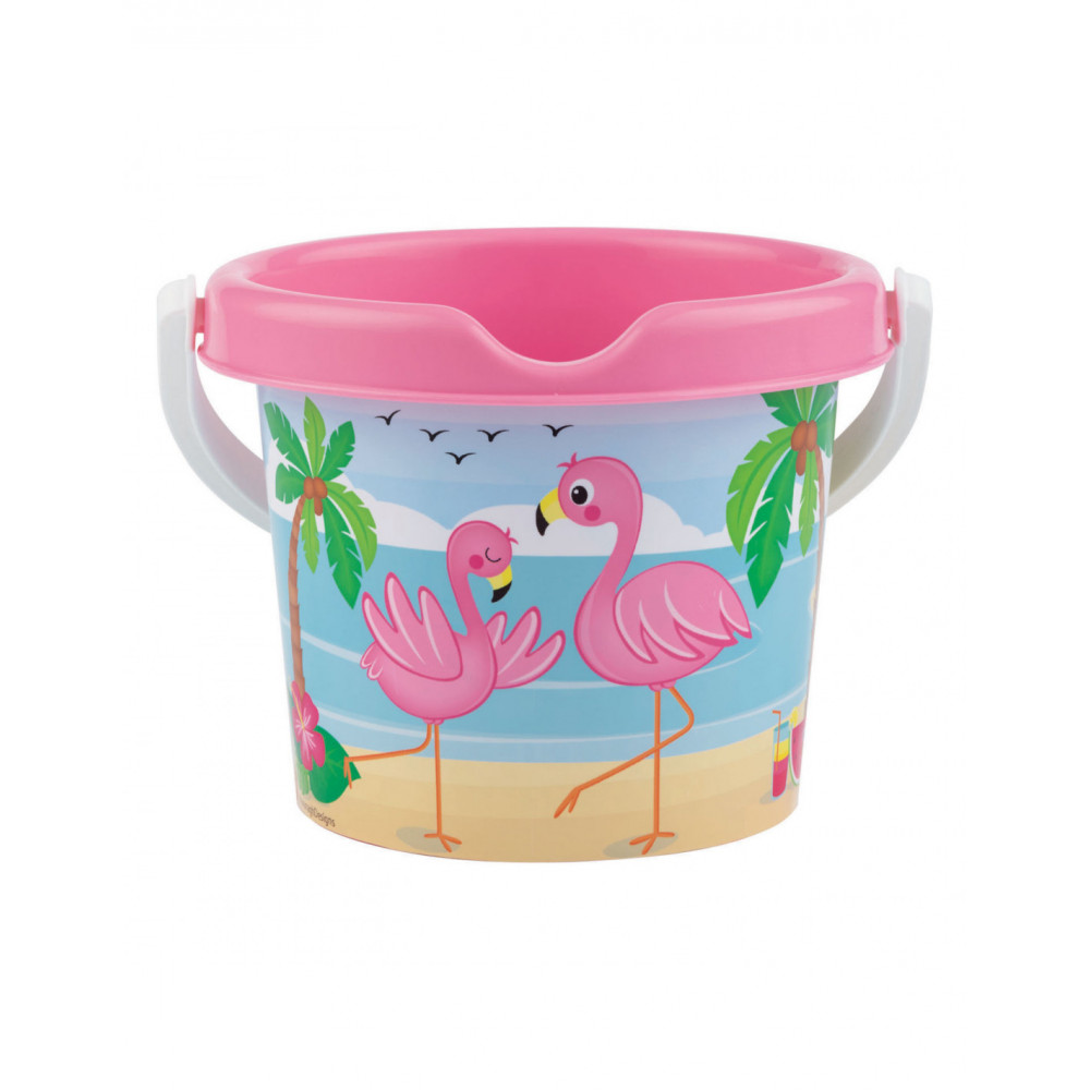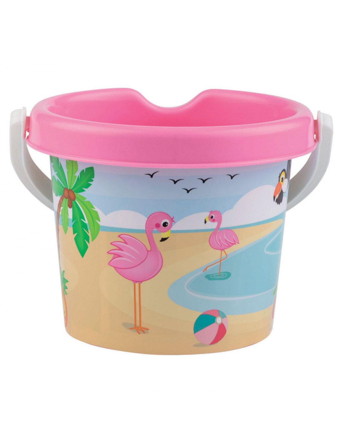 Deze Flamingo Peuteremmer is ideaal voor op het strand, bij het zwembad of in de tuin. Verzamel al je schatten erin en geniet van urenlang speelplezier! De peuteremmer is versierd met een vrolijke afbeelding van flamingo's op een prachtig strand, wat een extra vleugje zomerse sfeer toevoegt aan het speelplezier.