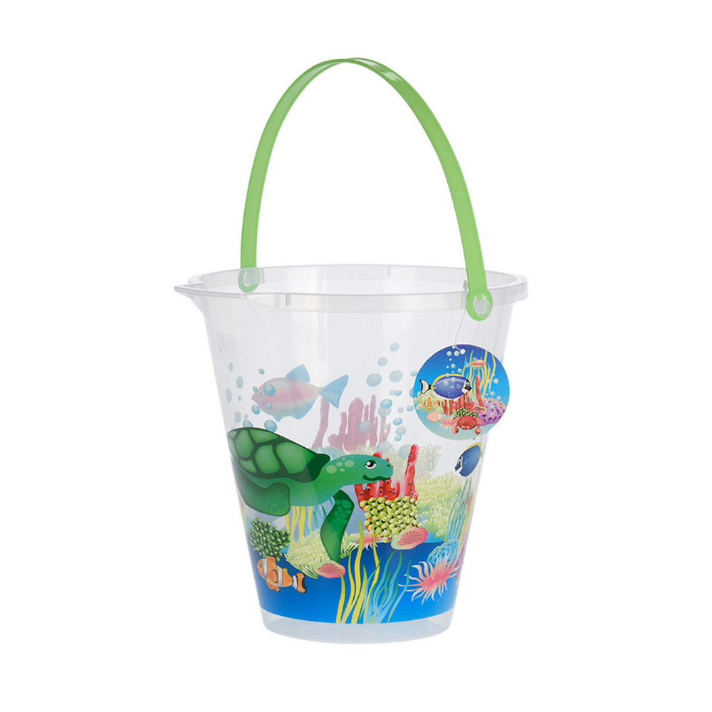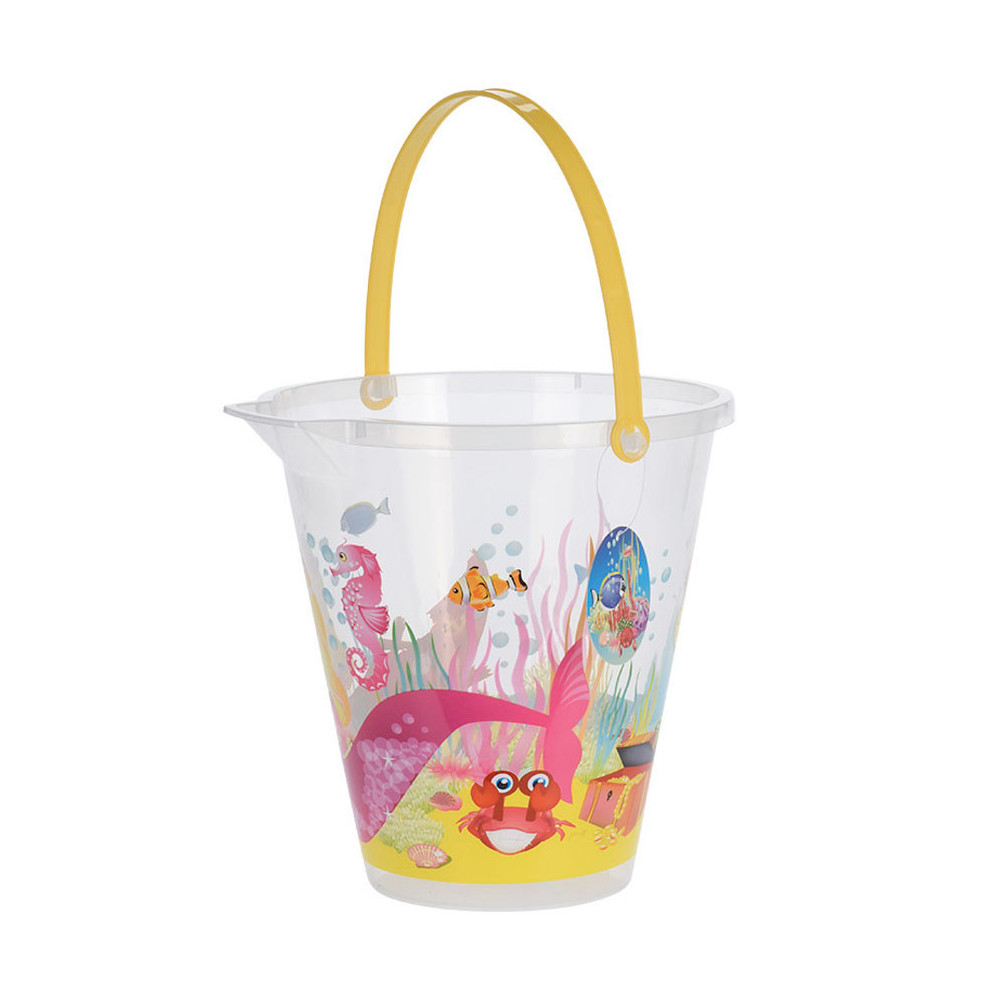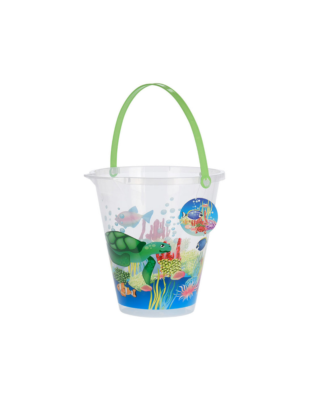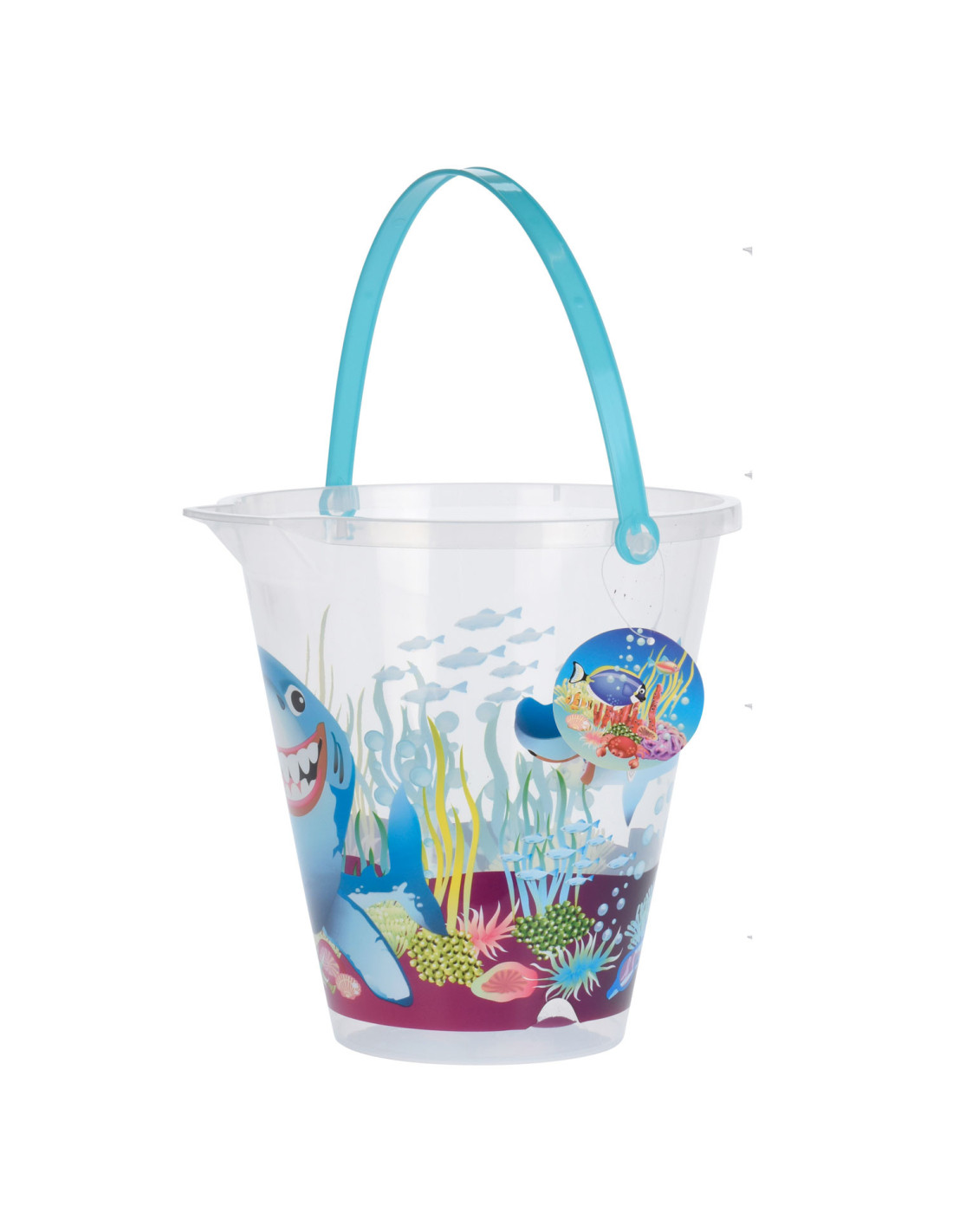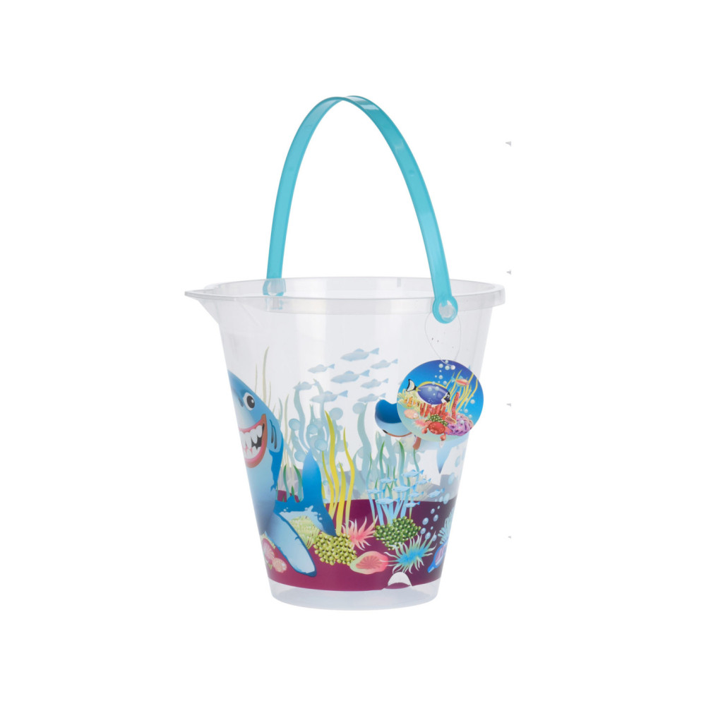 Verplaats water of zand met deze vrolijke strandemmer. De transparante emmer heeft een print van de onderwaterwereld rondom en een felgekleurd handvat. Dankzij de schenktuit aan de rand giet je het water of het zand gemakkelijk weer uit de emmer.
