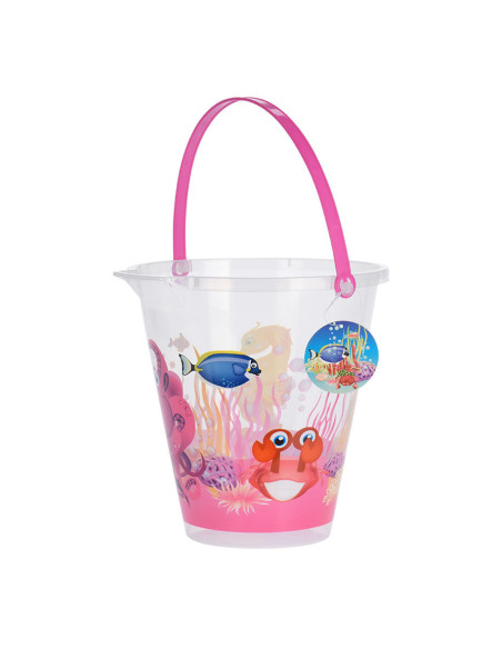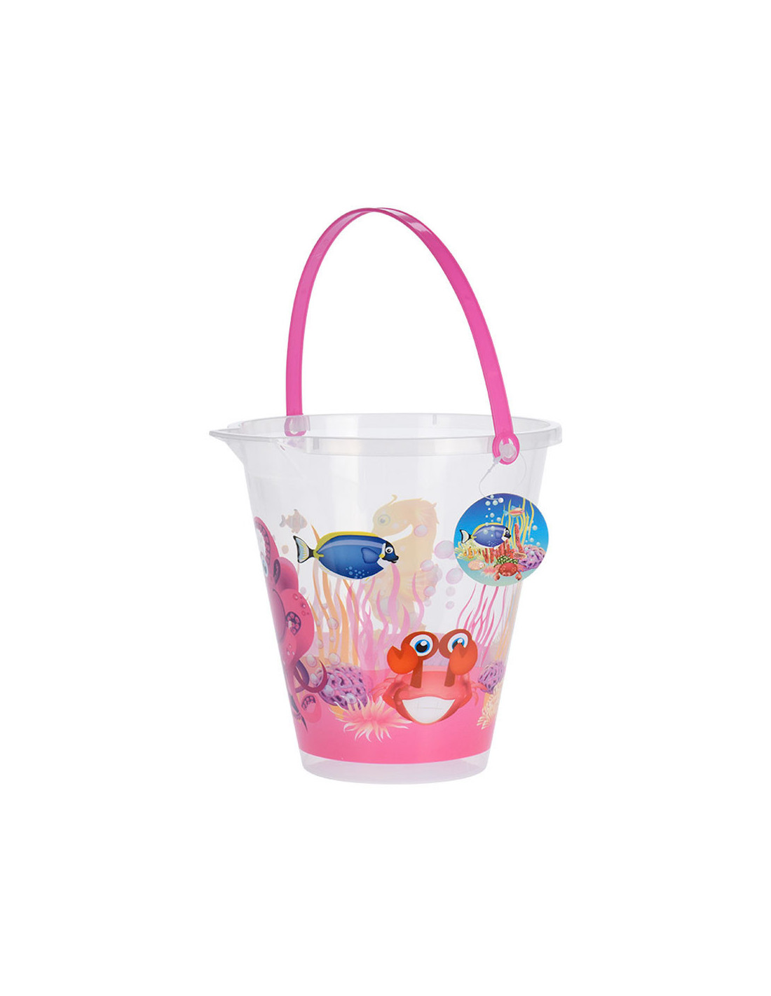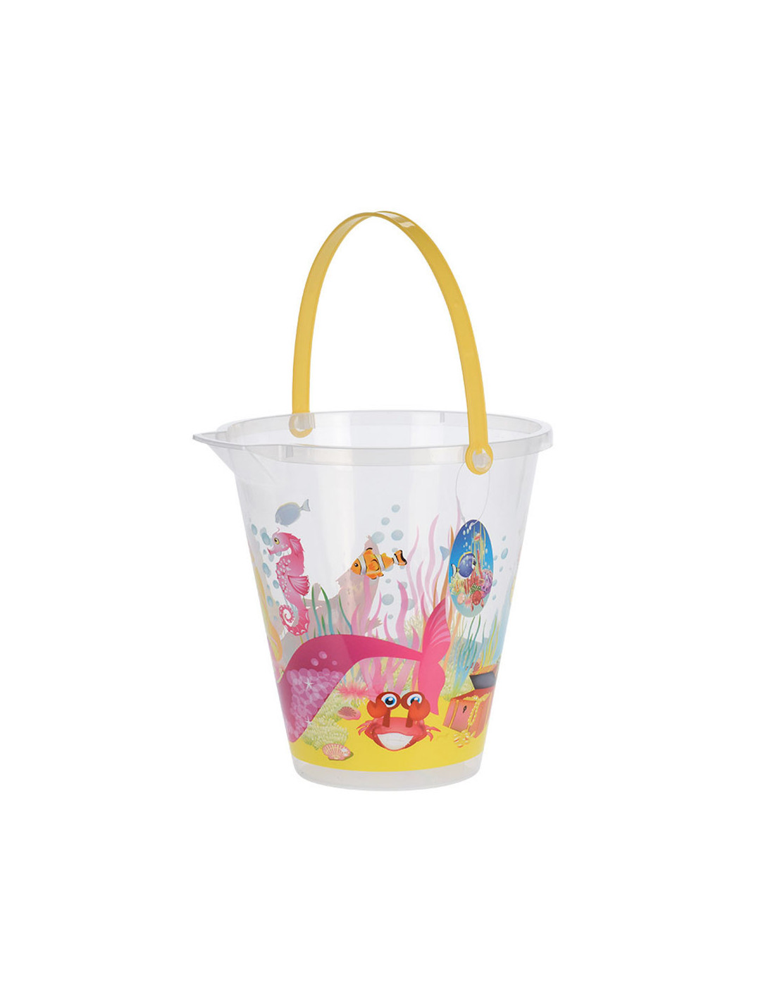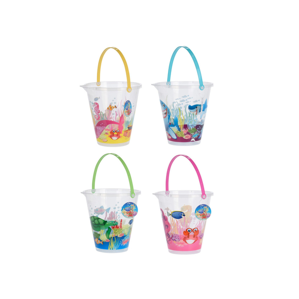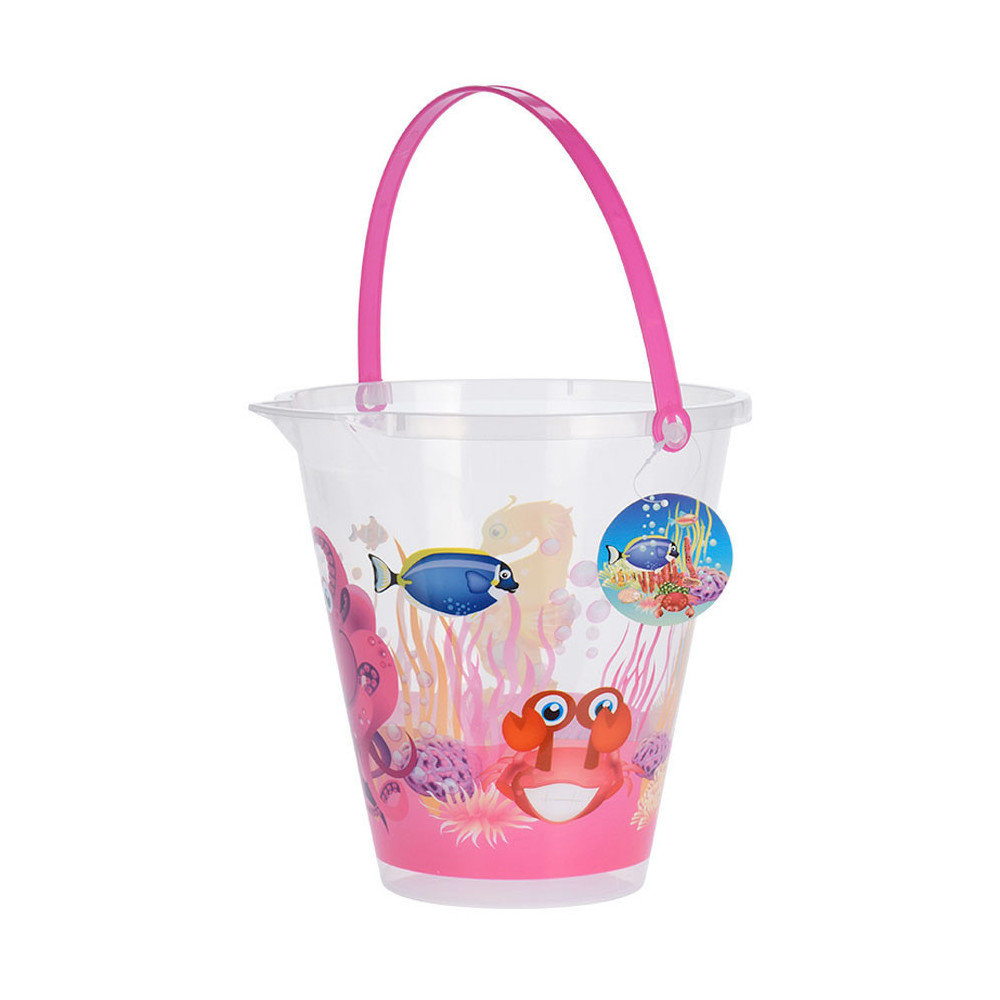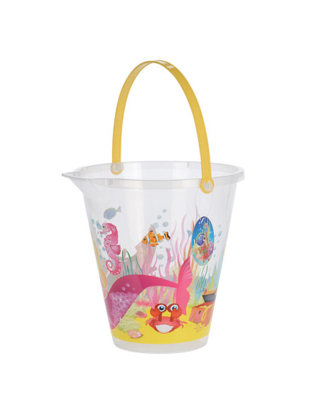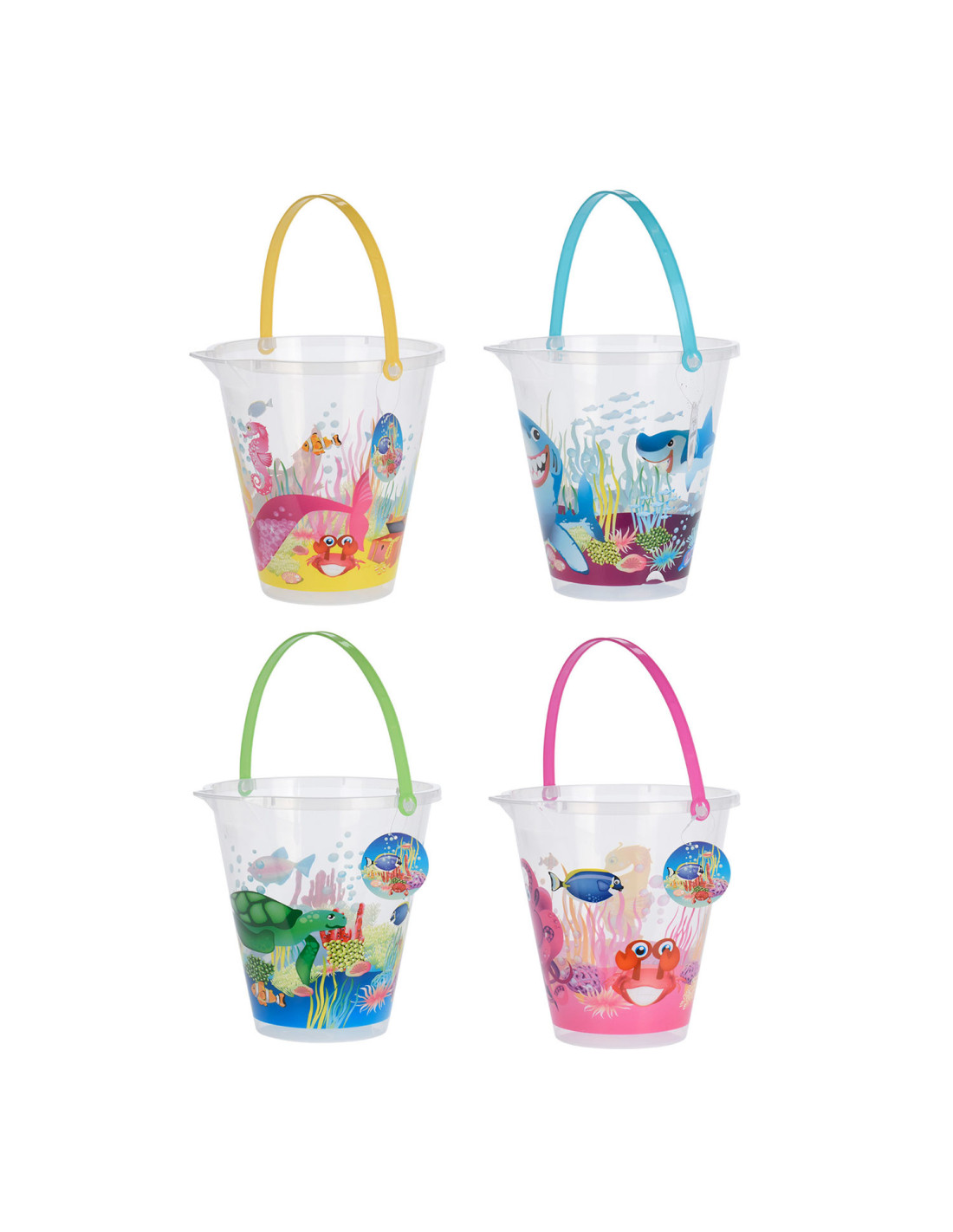 Verplaats water of zand met deze vrolijke strandemmer. De transparante emmer heeft een print van de onderwaterwereld rondom en een felgekleurd handvat. Dankzij de schenktuit aan de rand giet je het water of het zand gemakkelijk weer uit de emmer.