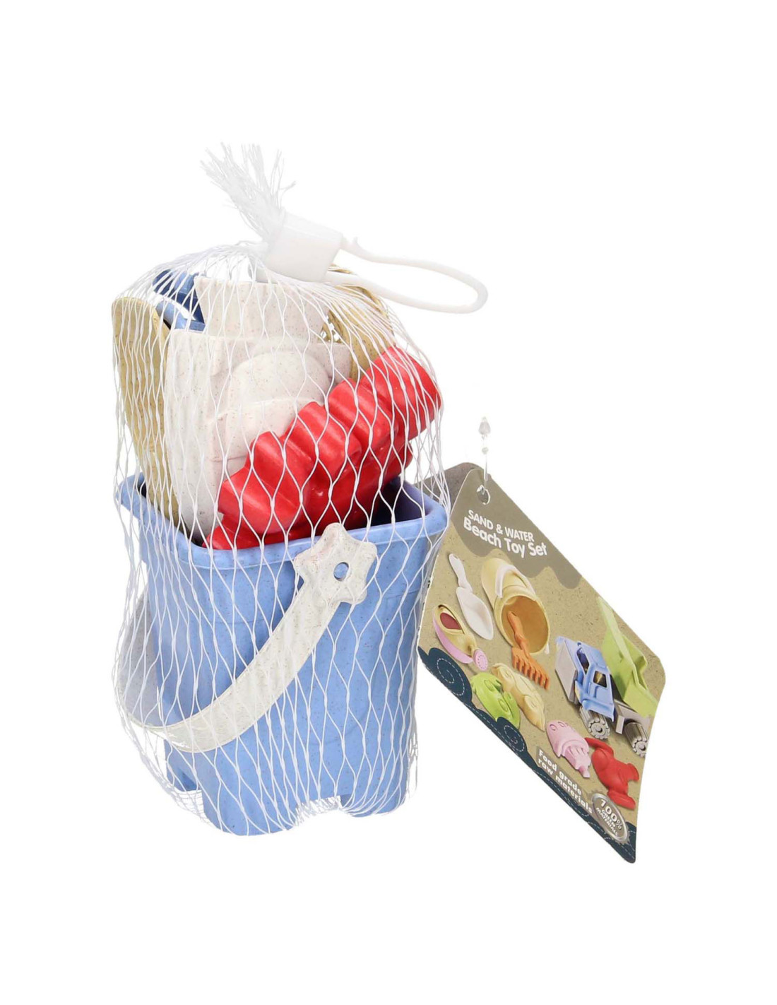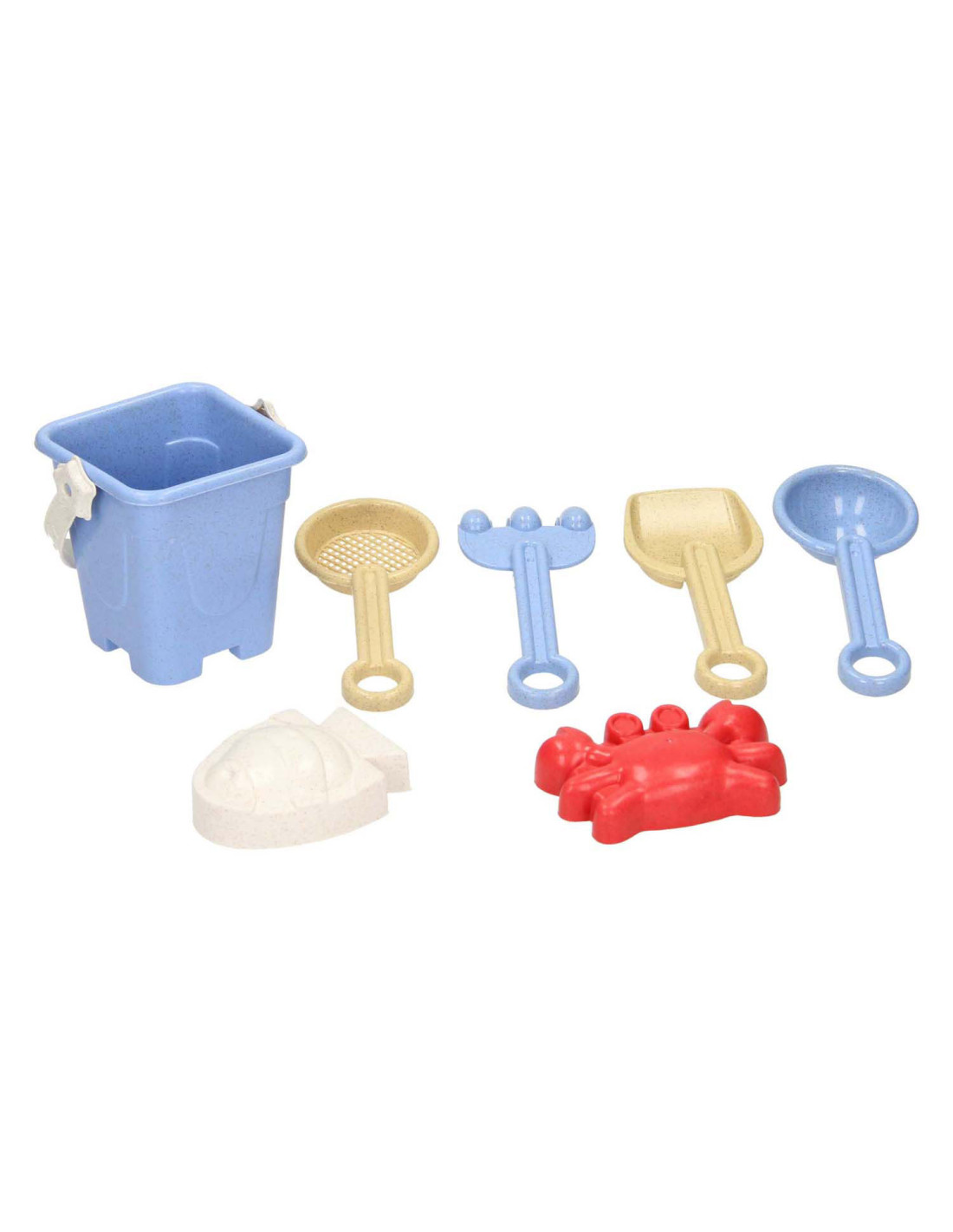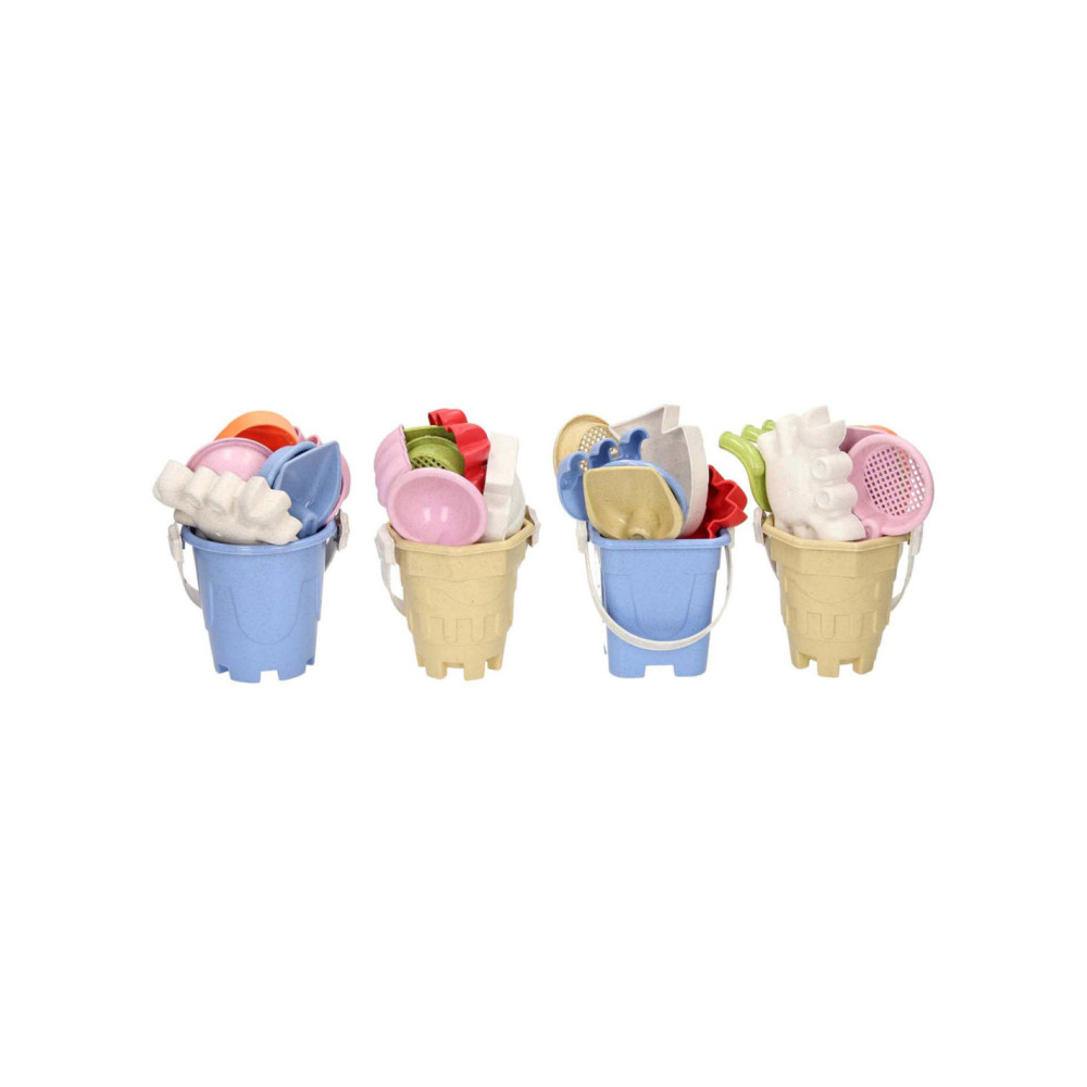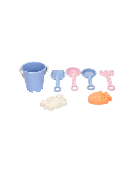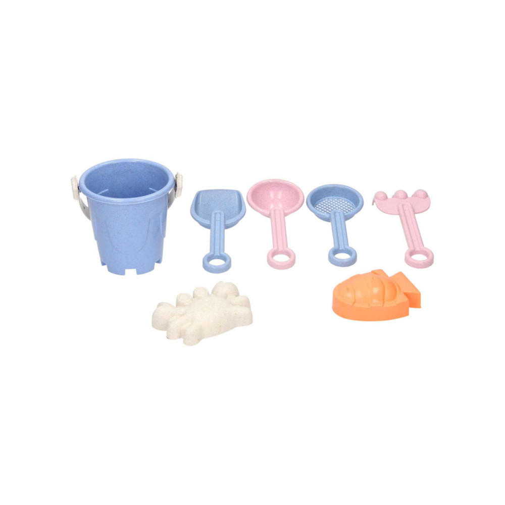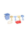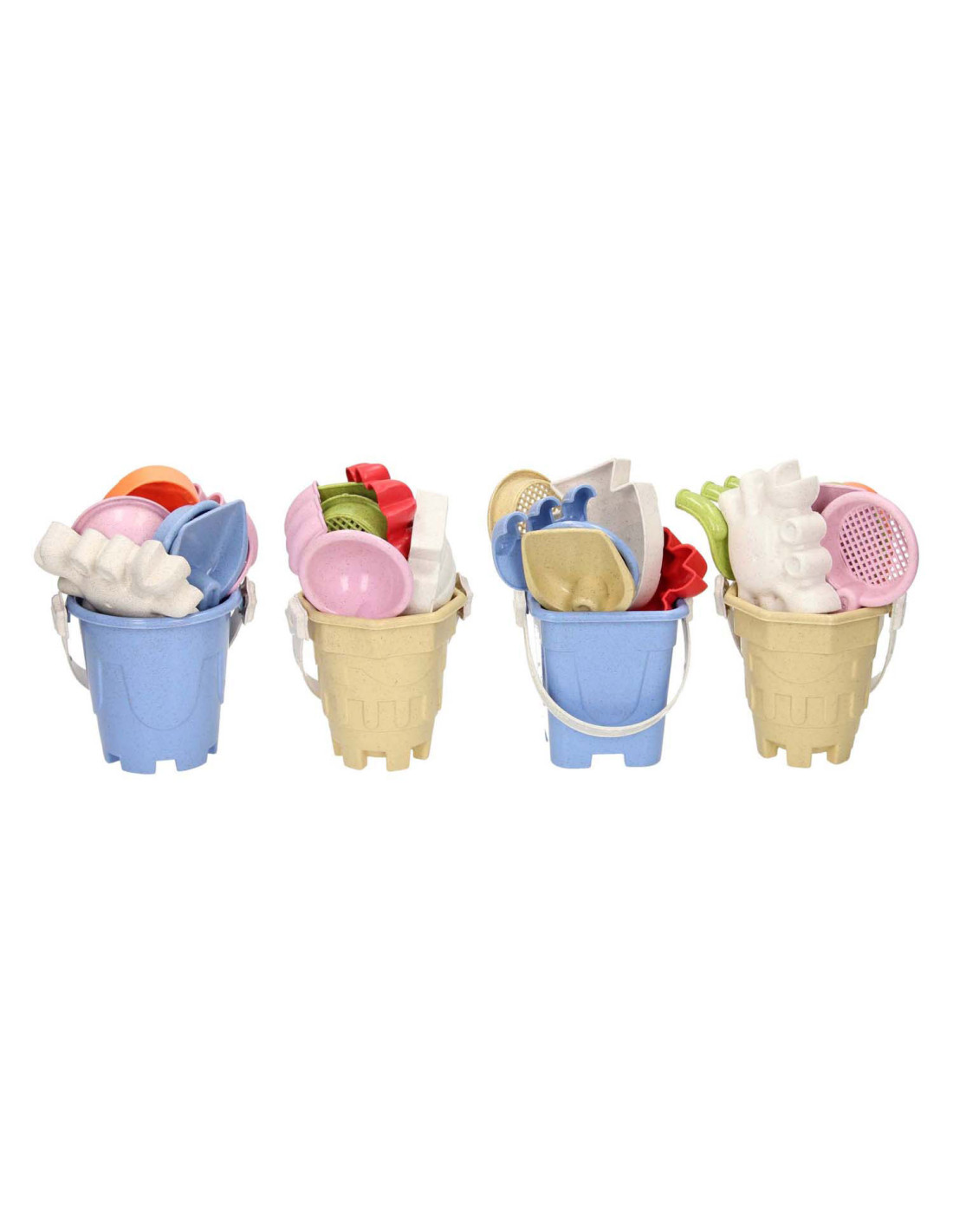 Strandsetje bestaande uit 1 kunststof emmer met hengsel, 4 stukken zandgereedschap en 2 zandvormen. Geschikt vanaf 3 jaar.