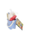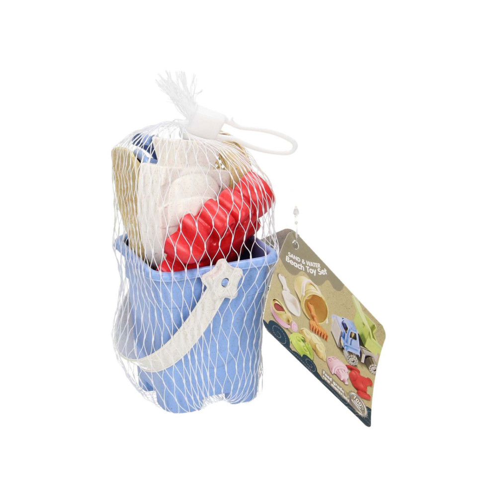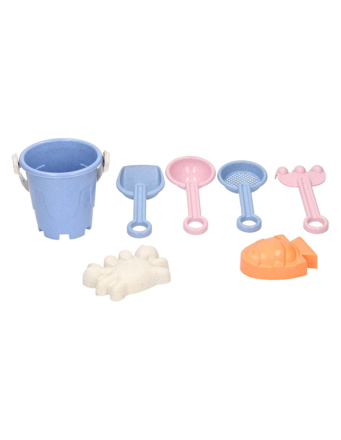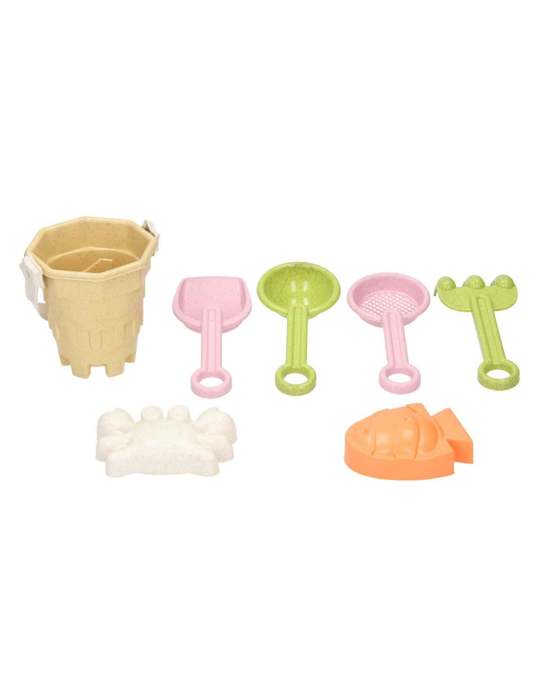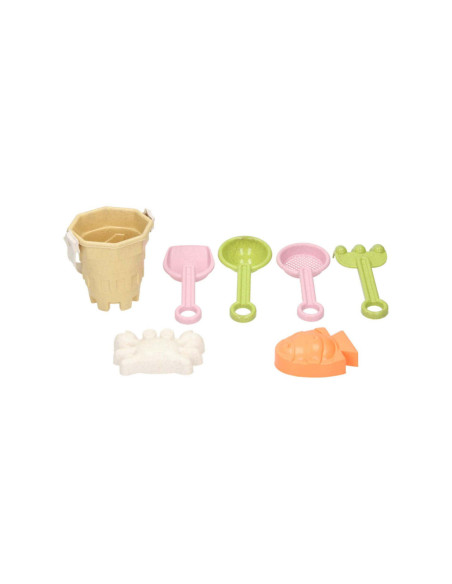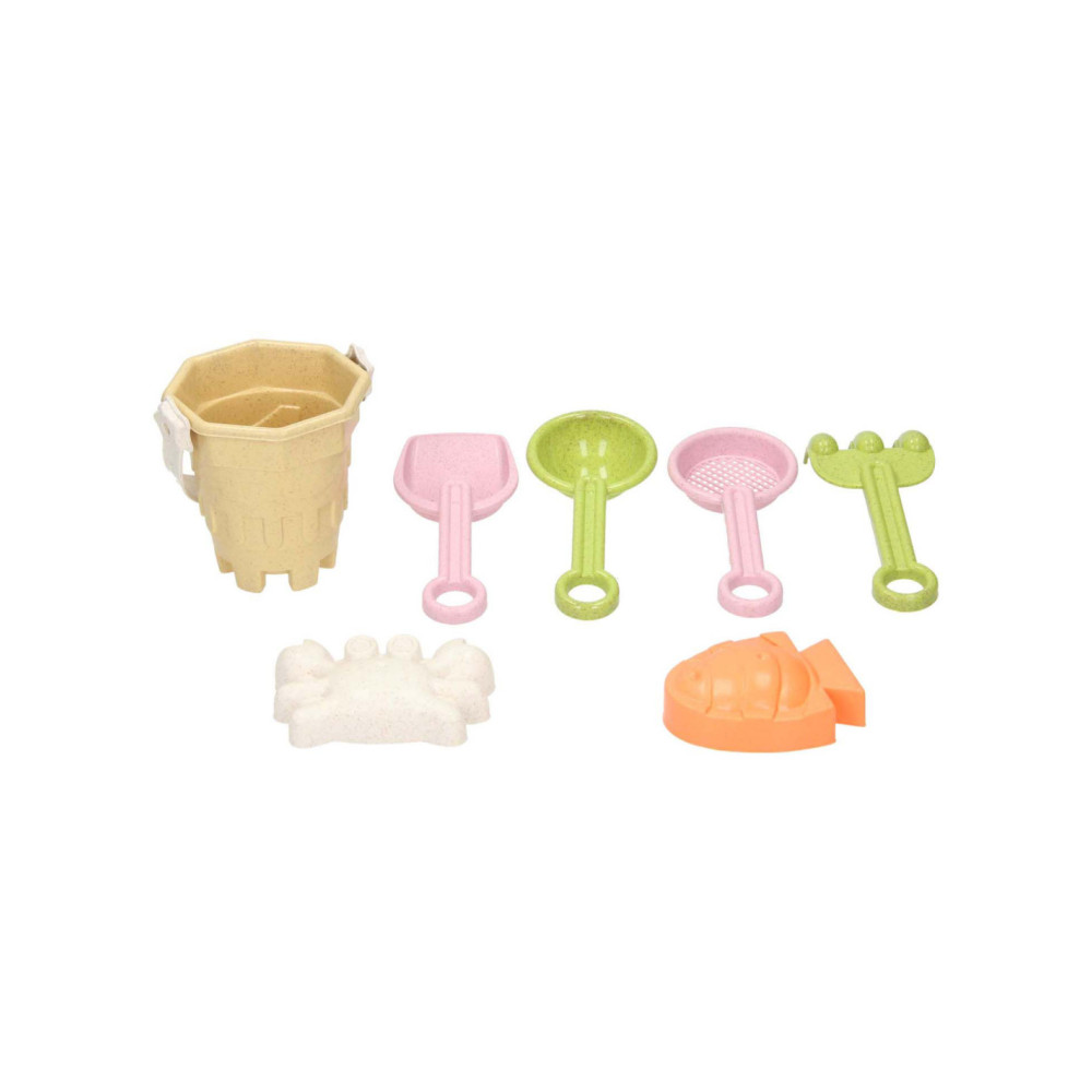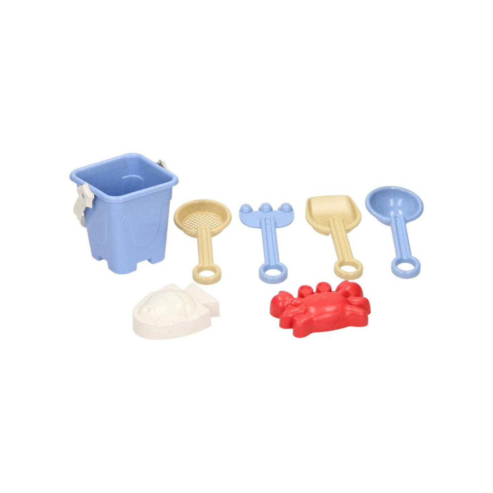 Strandsetje bestaande uit 1 kunststof emmer met hengsel, 4 stukken zandgereedschap en 2 zandvormen. Geschikt vanaf 3 jaar.