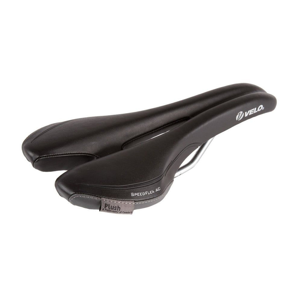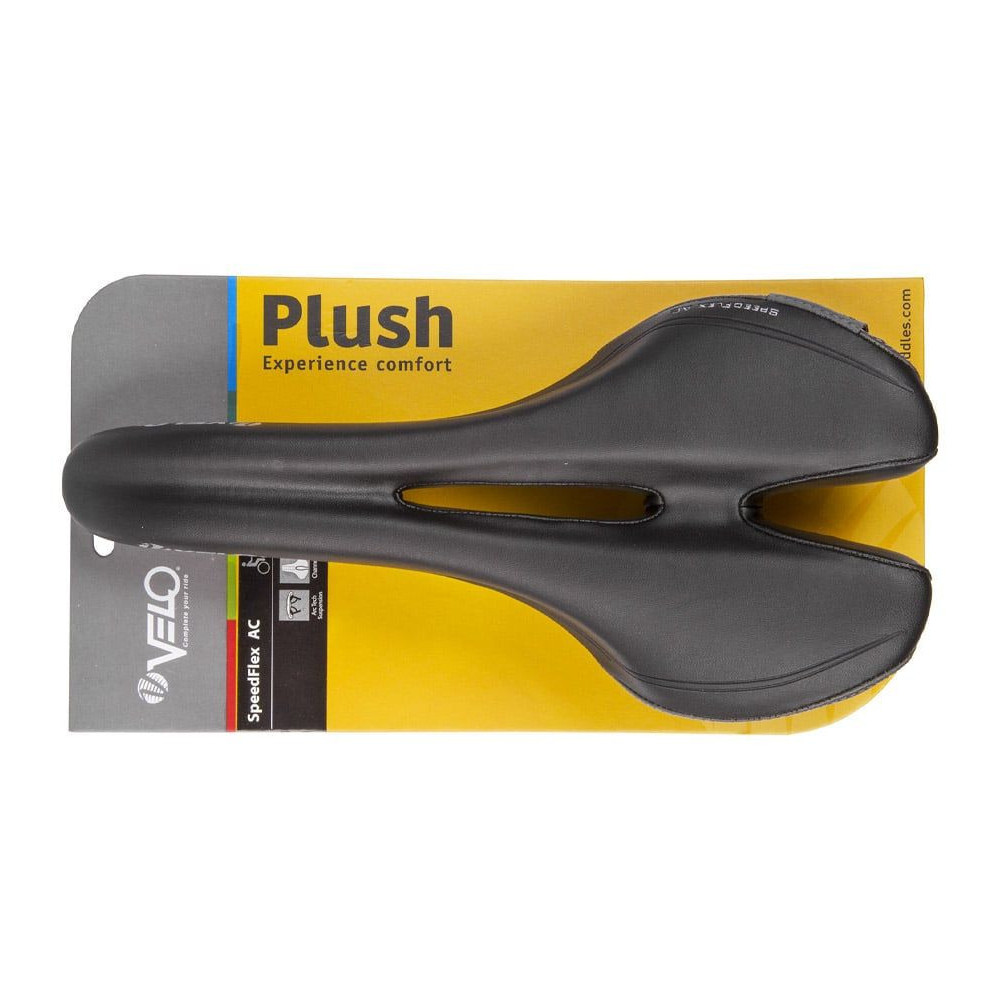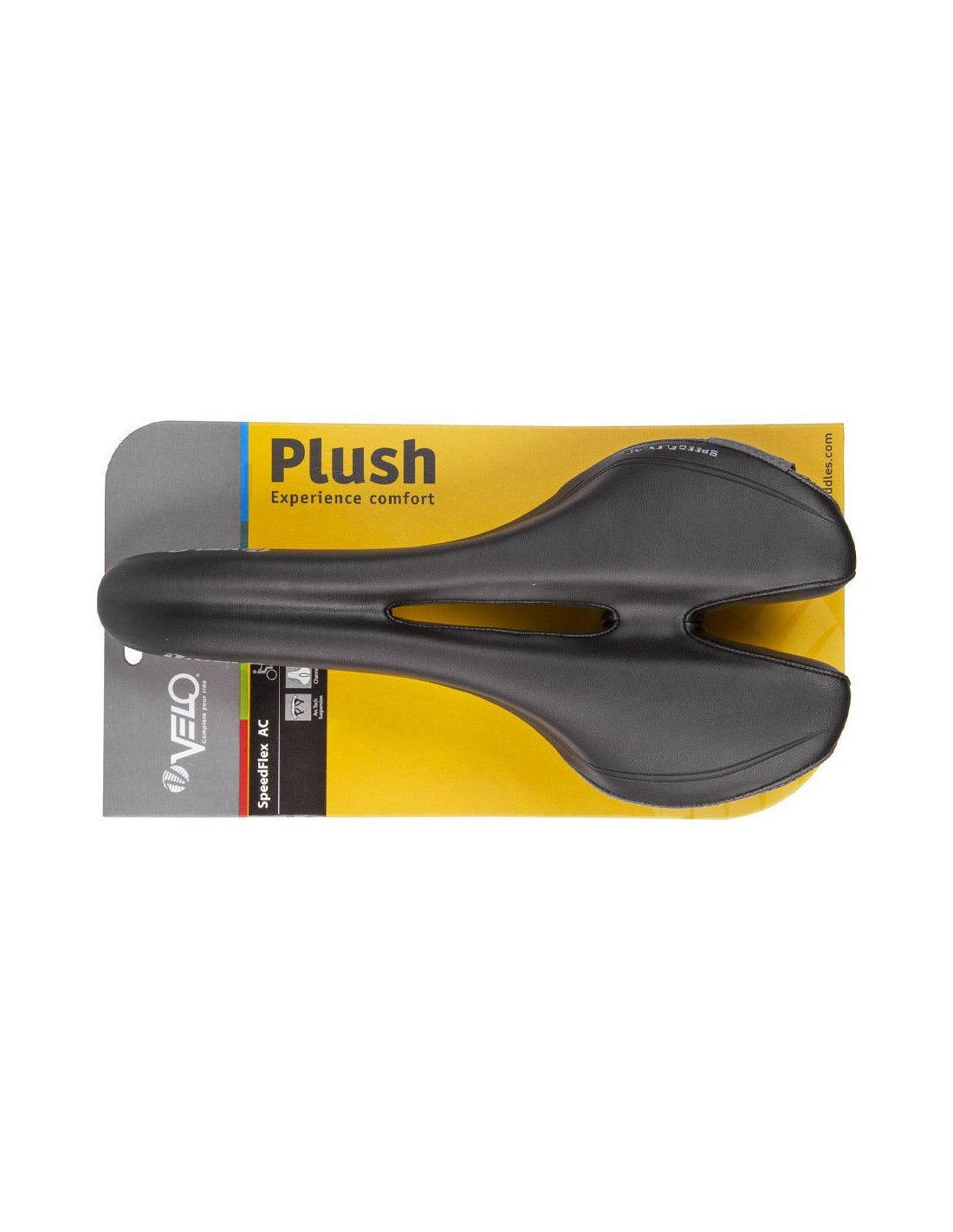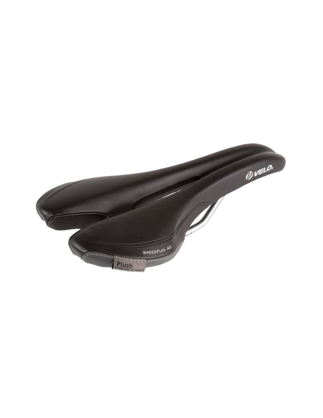 De Velo Plush Speedflex AC Zadel Zwart is een hoogwaardig fietszadel dat speciaal is ontworpen voor wegracen, triatlon en MTB. Het zadel is voorzien van rails met schaalverdeling, waardoor je het zadel eenvoudig kunt afstellen op de juiste hoogte en positie. Daarnaast beschikt het zadel over "Arc-Tech" vering, wat zorgt voor een optimale schokabsorptie en comfort tijdens het fietsen.Het "V-Cut" ontwerp van het zadel zorgt voor een betere drukverdeling en voorkomt wrijving en irritatie tijdens het fietsen. Het "O-Zone Full Cut" ontwerp zorgt voor een betere bloedcirculatie en voorkomt gevoelloosheid en pijn in het zitvlak. Het luchtkanaal ventilatiesysteem zorgt voor een goede luchtcirculatie en voorkomt oververhitting en transpiratie.Het zadel heeft een gewicht van slechts 276 gram en meet 275x130 mm. Het is gemaakt van hoogwaardige materialen en is zeer slijtvast. Kortom, de Velo Plush Speedflex AC Zadel Zwart is een uitstekende keuze voor iedereen die op zoek is naar een comfortabel en hoogwaardig fietszadel voor wegracen, triatlon en MTB.
