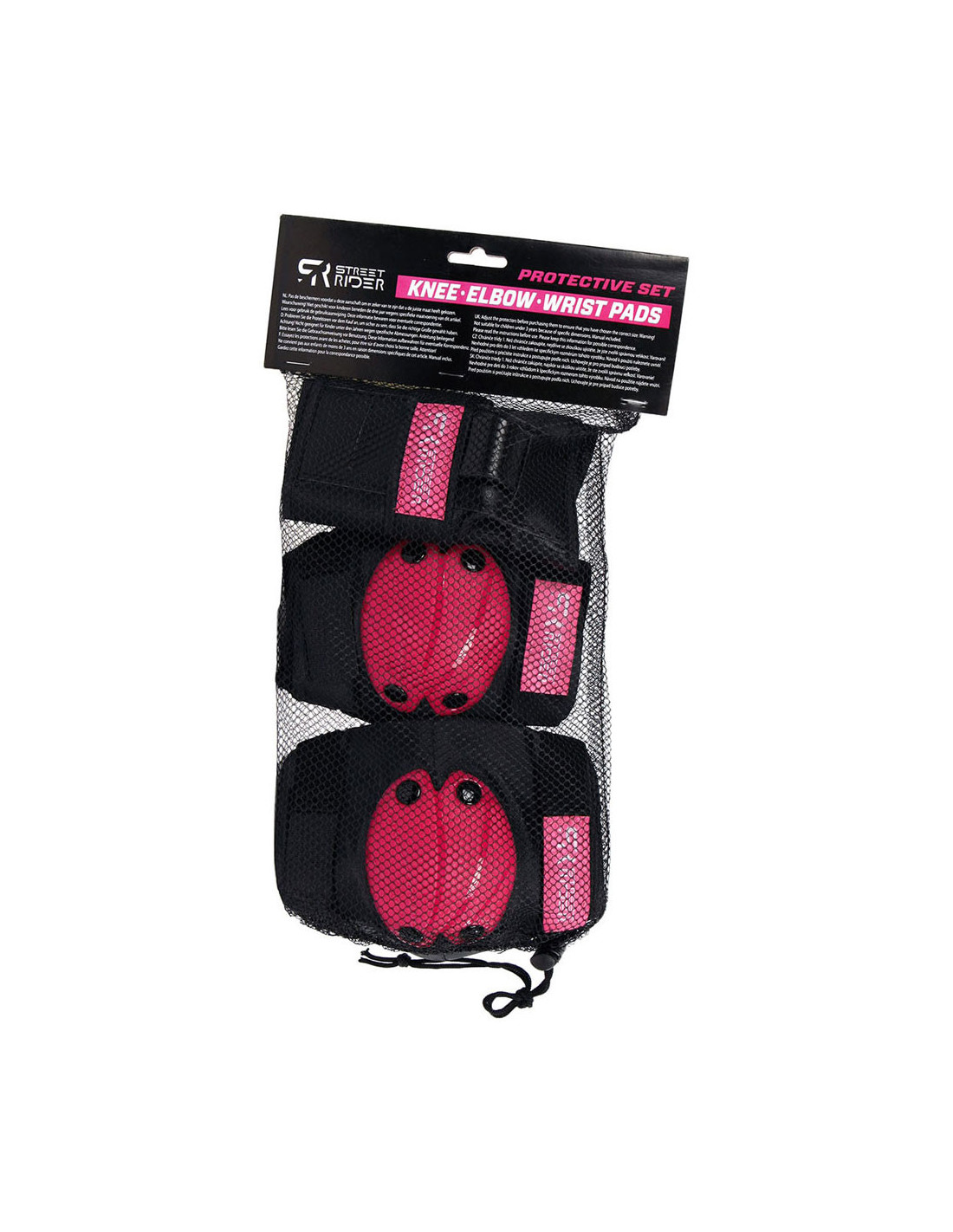 Roze skate beschermset voor kinderen in maat S, bestaande uit polsbeschermers, kniebeschermers en elleboogbeschermers. Gemaakt van kunststof en nylon.
