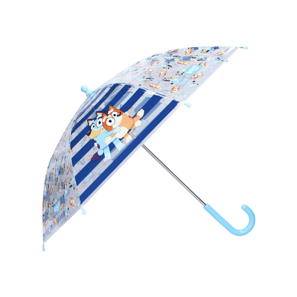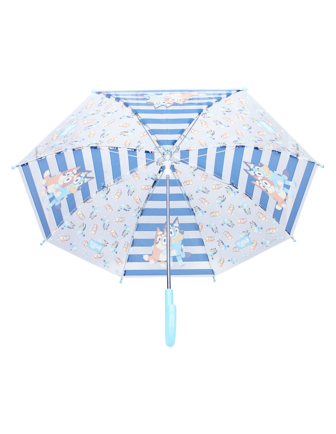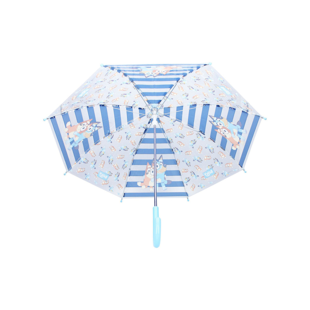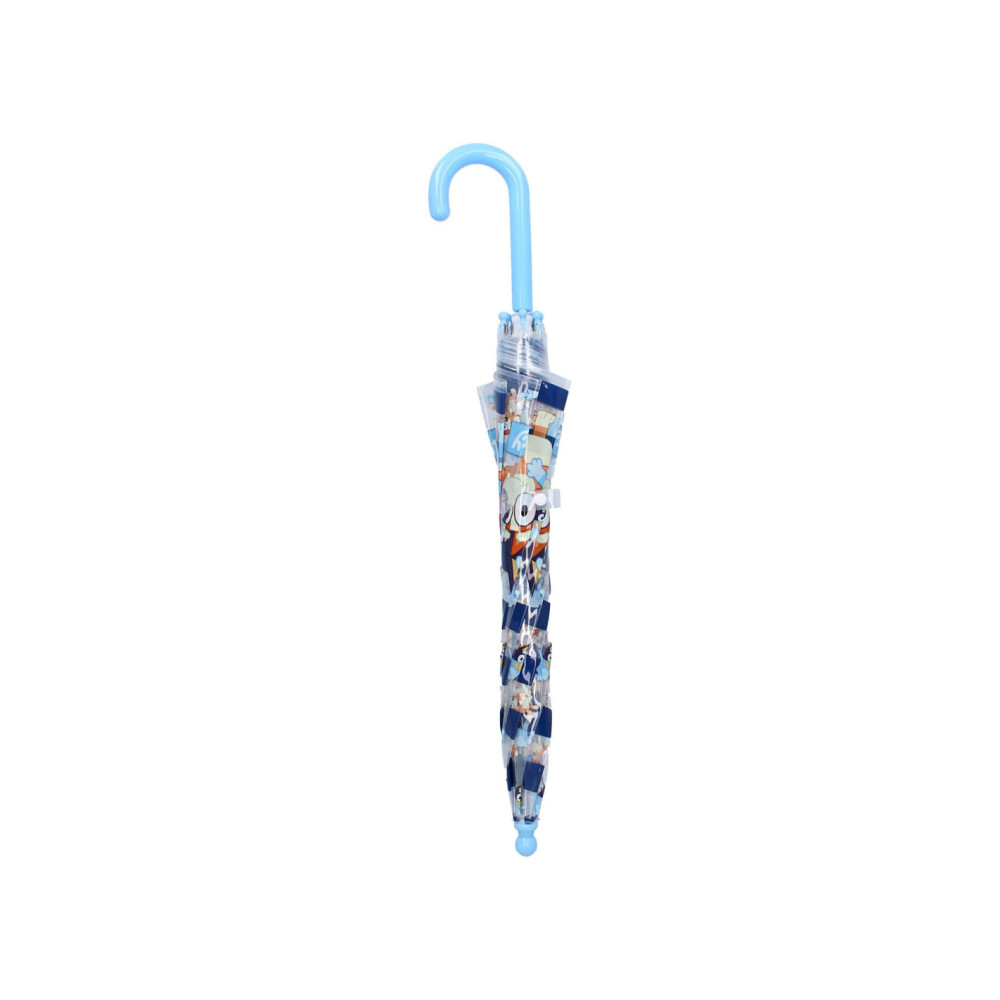 Op regenachtige dagen is een kind beschermt tegen het weer en voorzien van een te leuke paraplu van Bluey uit de Rainy Days collectie. Deze lichtblauwe paraplu heeft verschillende vlakken waar diverse prints op zijn afgebeeld. De hondjes Bluey en Bingo staan hierop afgebeeld. Dit geeft een varierend en speels effect. Het item is eenvoudig open en dicht te klappen en licht van gewicht, waardoor een kind dit gemakkelijk zelf kan doen. De paraplu heeft een rond, lichtblauw handvat en aan het uiteinden van de baleinen bevinden zich kleine dopjes waardoor een kind zich niet kan bezeren. De paraplu heeft een diameter van 71 centimeter.