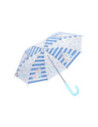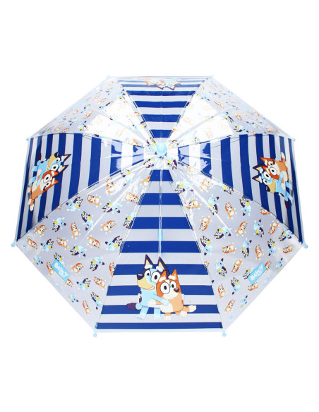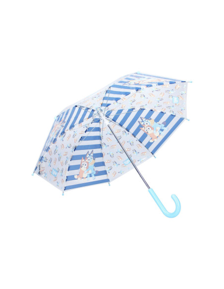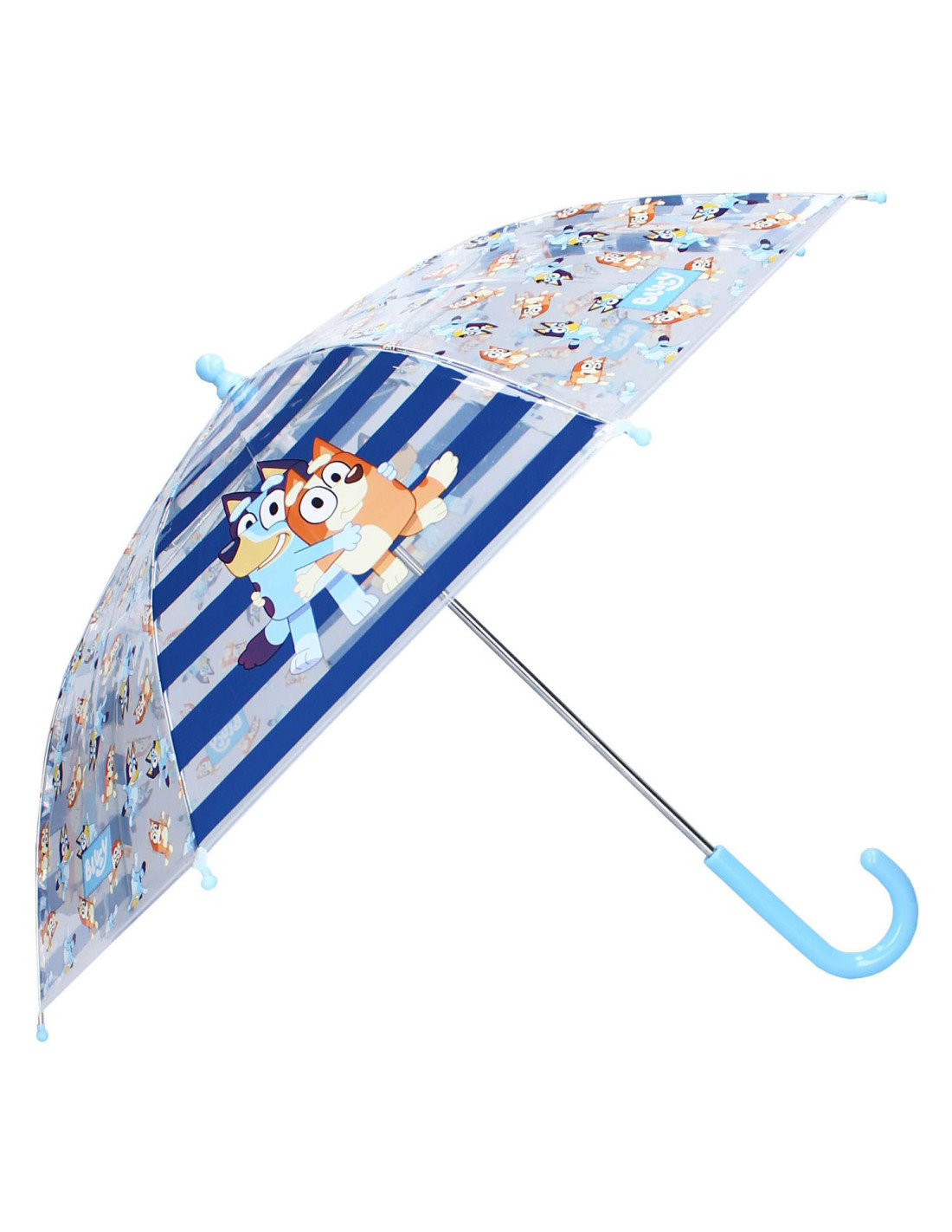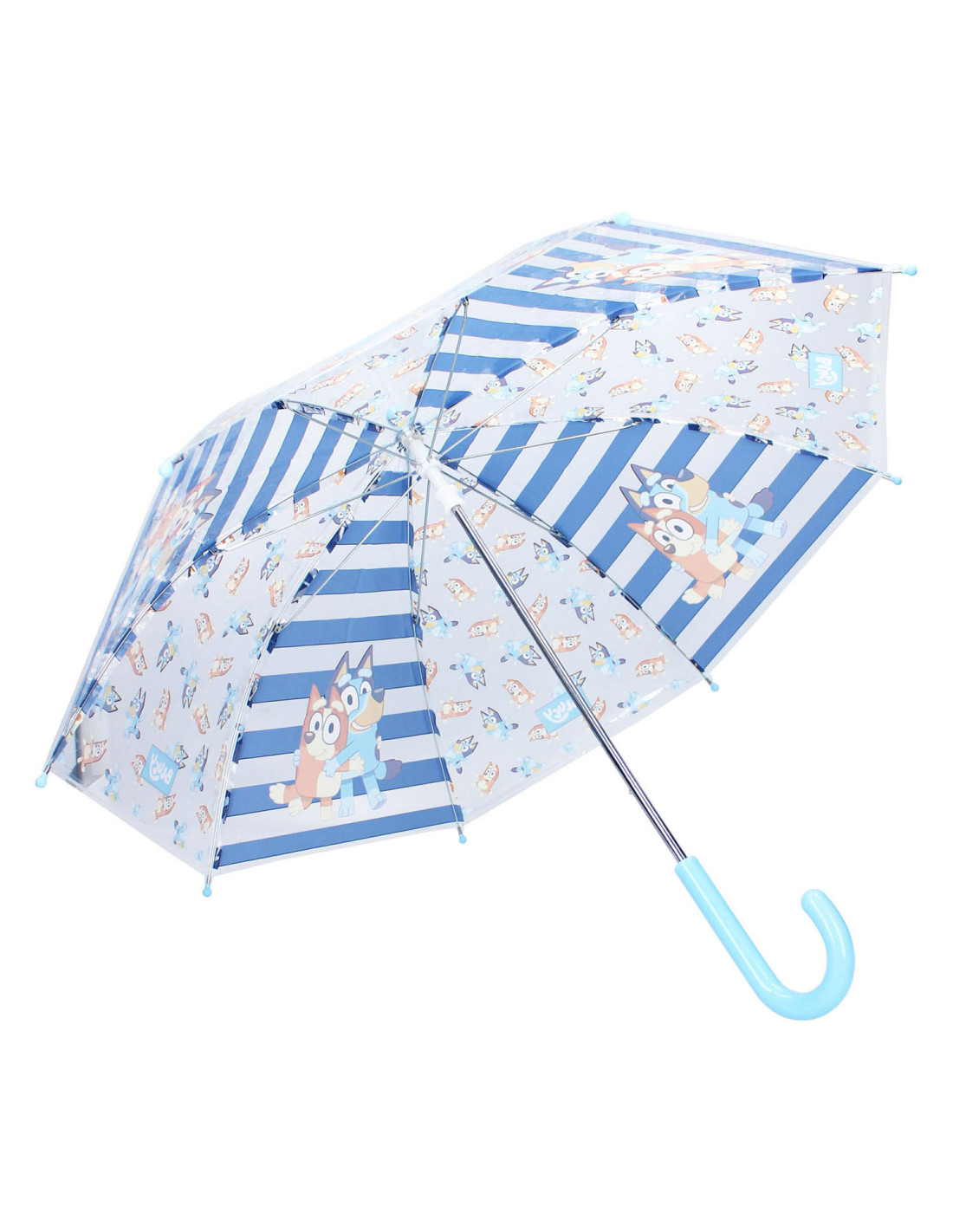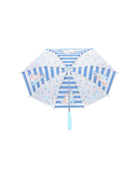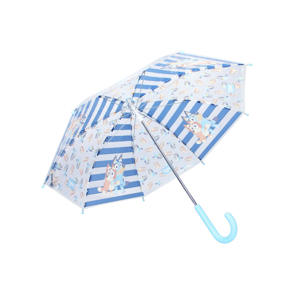 Op regenachtige dagen is een kind beschermt tegen het weer en voorzien van een te leuke paraplu van Bluey uit de Rainy Days collectie. Deze lichtblauwe paraplu heeft verschillende vlakken waar diverse prints op zijn afgebeeld. De hondjes Bluey en Bingo staan hierop afgebeeld. Dit geeft een varierend en speels effect. Het item is eenvoudig open en dicht te klappen en licht van gewicht, waardoor een kind dit gemakkelijk zelf kan doen. De paraplu heeft een rond, lichtblauw handvat en aan het uiteinden van de baleinen bevinden zich kleine dopjes waardoor een kind zich niet kan bezeren. De paraplu heeft een diameter van 71 centimeter.