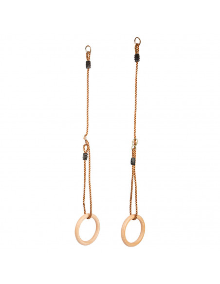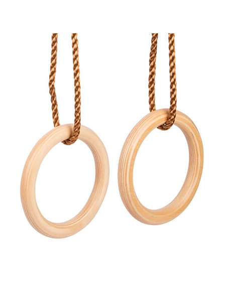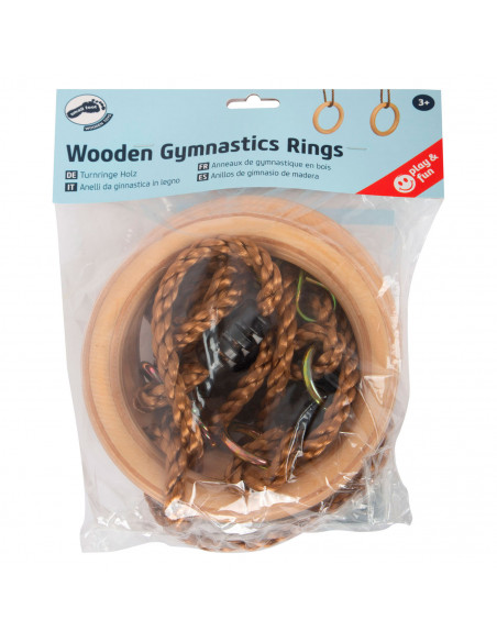 Deze houten gymnastiek ringen zijn ideaal voor kinderen om uren mee te spelen. Slingeren, duikelen: het kan niet op! Kleine acrobaten trainen met de ringen ritme, kracht, balans en uithoudingsvermogen. Het hout is fijn om vast te pakken en de verstelbare touwen zorgen ervoor dat de gymnastiekringen op de persoonlijke lengte van het kind afgesteld kunnen worden. Inclusief metalen ringen om ze op te kunnen hangen en te monteren. Het touw is 122 centimeter lang en de ringen hebben een doorsnede van 18 centimeter. Het maximale gewicht is 100 kg.