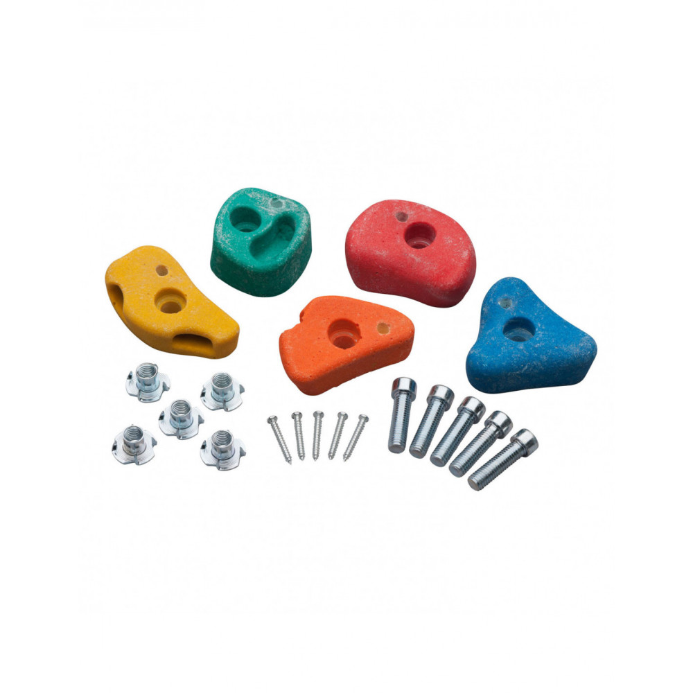 Klimsteen set klein model met 2 gaten (5st). De gekleurde stenen zijn gemaakt van composiet. De grepen hebben een diameter van 8 centimeter. Geschikt voor kinderen van 3 tot 12 jaar. De montage accessoires worden meegeleverd.