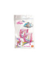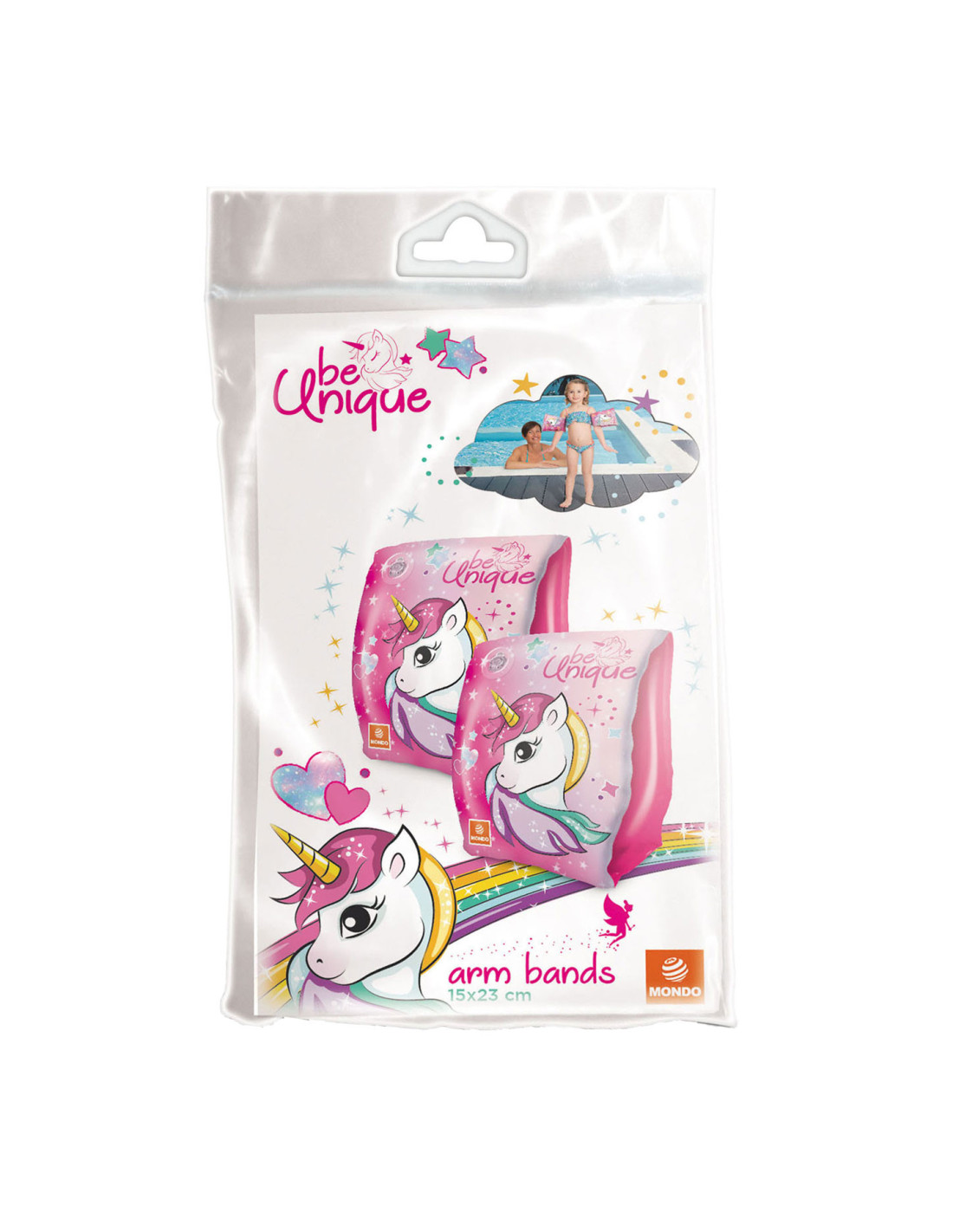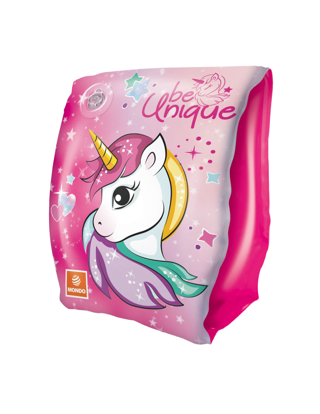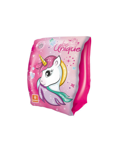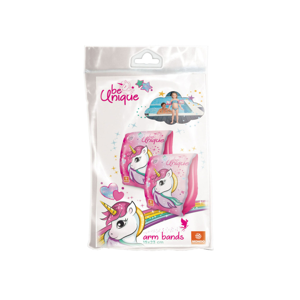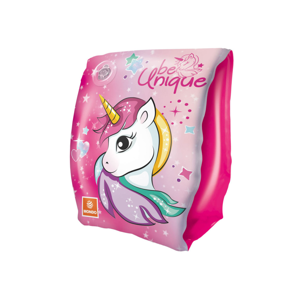 Roze zwembandjes met een eenhoorn erop afgebeeld. Afmeting: 15 bij 23 cm.