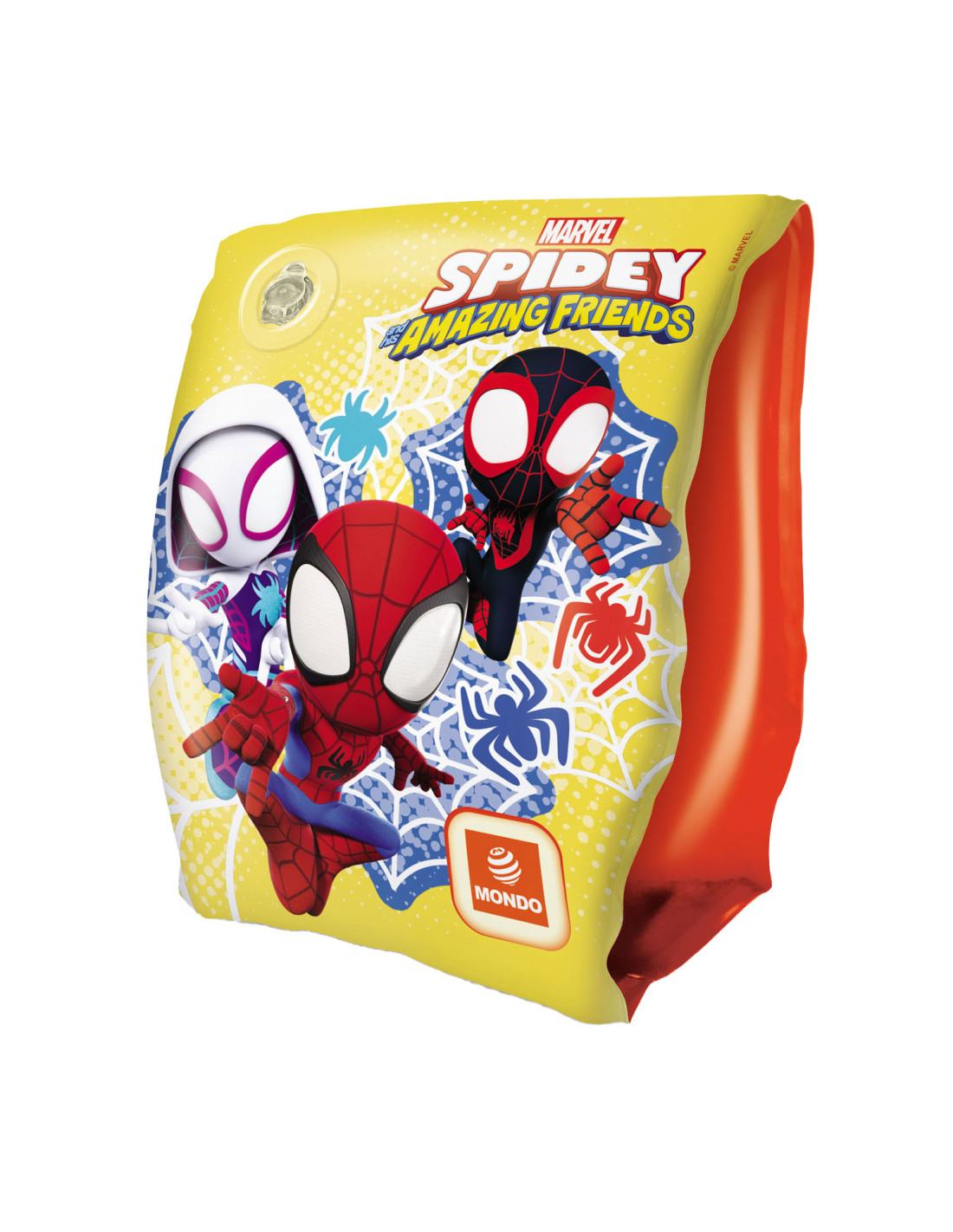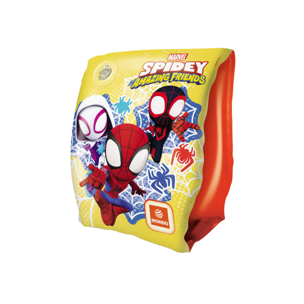 Gele zwembandjes met Spidey, Ghost Spider en Miles Morales erop afgebeeld. Afmeting: 15 bij 23 cm.