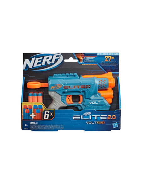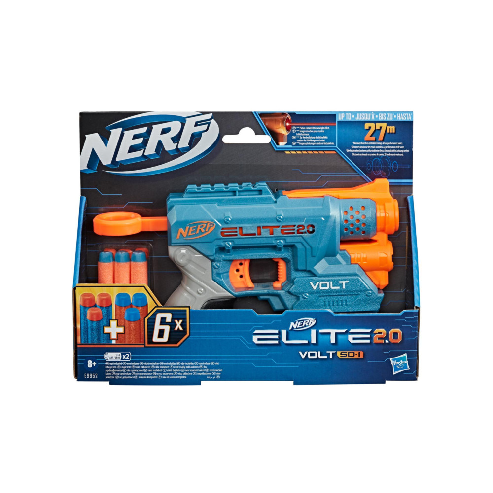 De NERF Elite 2.0 Volt SD 1 schiet darts tot 27 meter ver. e blaster heeft opslagruimte voor twee darts in de handgreep. Dankzij de ingebouwde aanpassingsmogelijkheden kun je de NERF-gun verder upgraden. Zo heeft de Nerf Elite 2.0 Volt SD-1-blaster twee rails om je wapen aan te passen met NERF-accessoires. De set bevat zes officiele NERF-darts en de lichtstraal werkt op batterijen. Oogbescherming, batterijen en extra accessoires zijn niet inbegrepen.