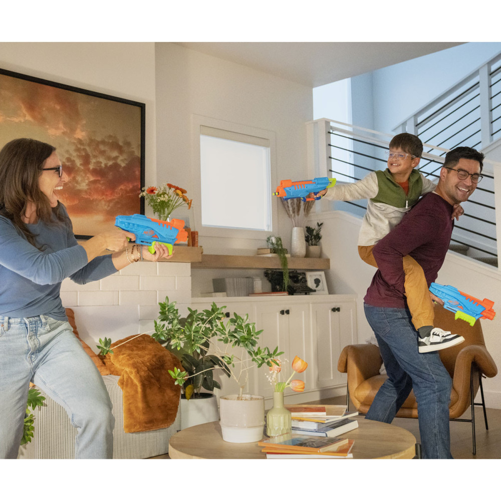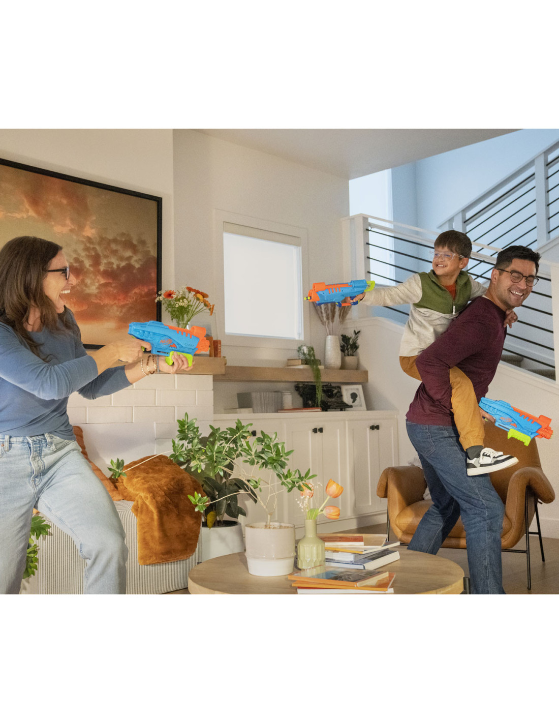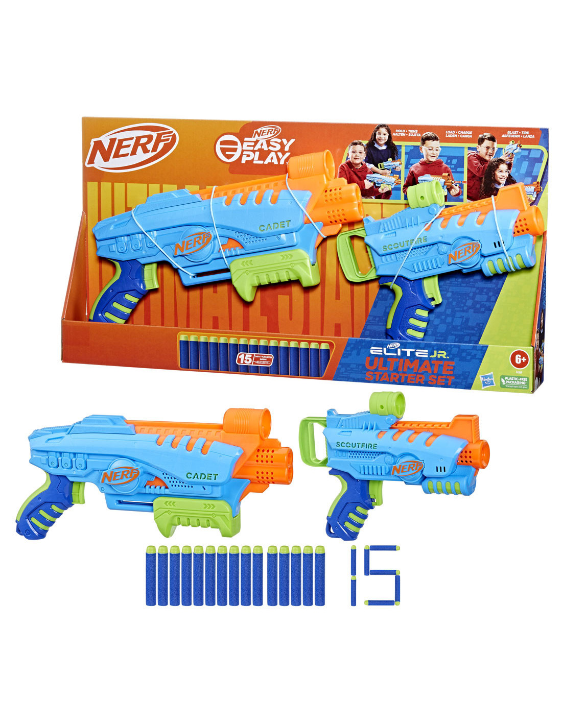 Nerf Elite Jr Easy-Play-speelgoedfoamblasters van Nerf zijn ontworpen voor jongens en meisjes die voor de eerste keer aan Nerf-gevechten deelnemen. Dankzij de speciale functies kunnen kinderen er makkelijk mee spelen, zodat ze in een mum van tijd spannende Nerf-gevechten spelen. Ze storten zich in wervelend dartblasterplezier binnen en buiten en ervaren de kick van het helemaal zelf-doen. De blasters zijn eenvoudig vast te pakken, passen comfortabel in kleine handjes en zijn lichtgewicht om eenvoudig door kinderen tijdens buitenspellen gedragen te worden. De darts kunnen makkelijk worden geladen dankzij de voorlader. Schieten is eenvoudig met de handgrepen met de laagste trekkracht van alle Nerf-dartblasters. Met dit ontwerp kunnen kinderen zich helemaal storten op snelle acties en pronken met hun schietvaardigheid, terwijl ze alle stappen zelf uitvoeren! Bij de Easy-Play Nerf Elite Jr Ultimate Starter Set horen 2 speelgoedfoamdartblasters, 2 doelwitten en 15 Nerf Elite-foamdarts. Een bril wordt aangeraden (niet inbegrepen). Nerf en alle bijbehorende eigenschappen zijn handelsmerken van Hasbro.