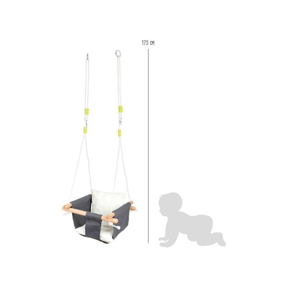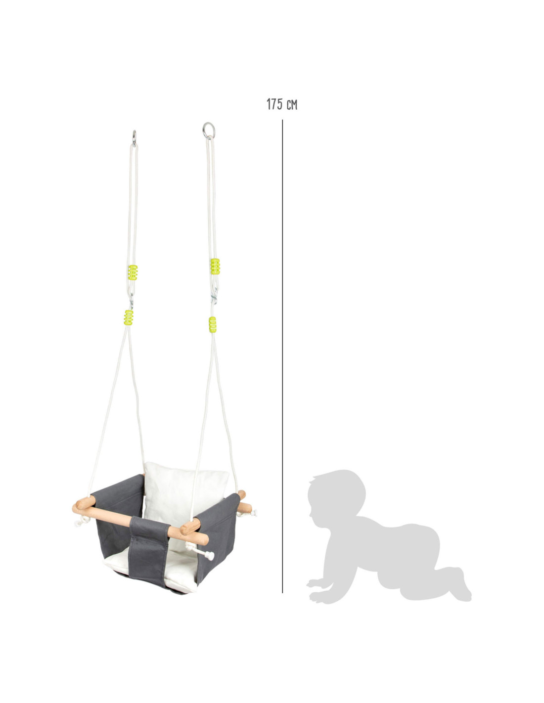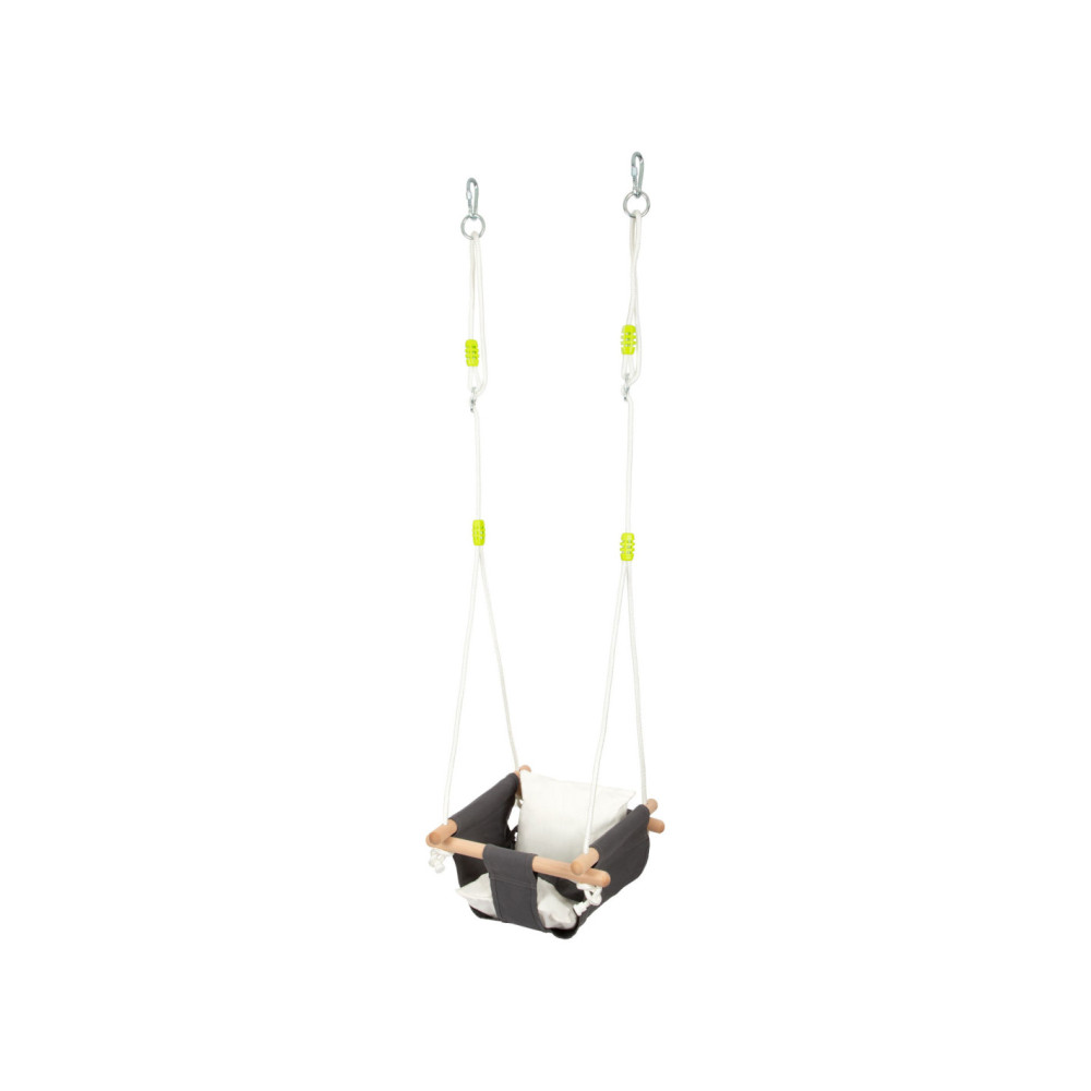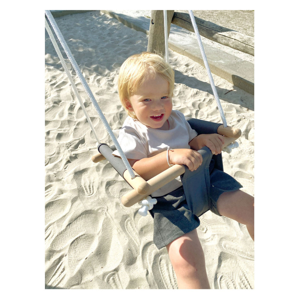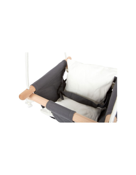 Deze schommel van hoogwaardig beukenhout is tegelijkertijd een rustige plek en de lievelingsplek van baby's. Vier dwarsbalken en een in lengte verstelbare riem geven structuur en ondersteuning, en de onderhoudsvriendelijke geweven stof past zich optimaal aan de lichaamsvorm van een baby aan. Het simpele, moderne design en het subtiele kleurdesign maken van deze babyschommel een echte eyecatcher in de kinderkamer. Voorgemonteerd en klaar om te zwaaien. Met robuuste, in lengte verstelbare touwen en metalen ringen en karabijnhaken om op te hangen en te monteren. En deze schommel groeit mee! Met het kussen is de zitting kleiner te maken, ideaal voor jongere kinderen vanaf 18 maanden. Later kan het kussen worden verwijderd.