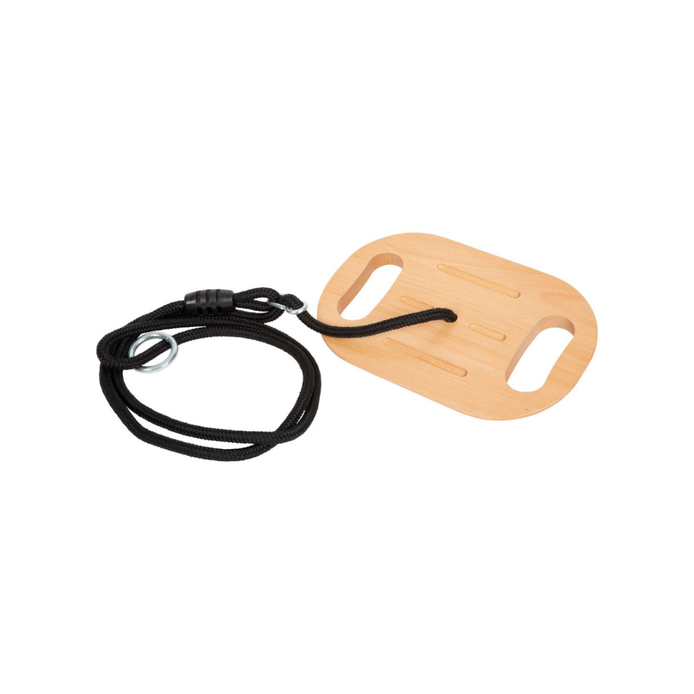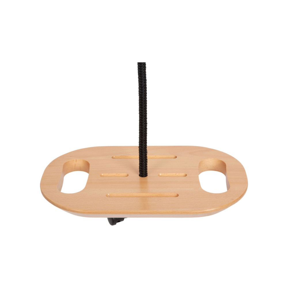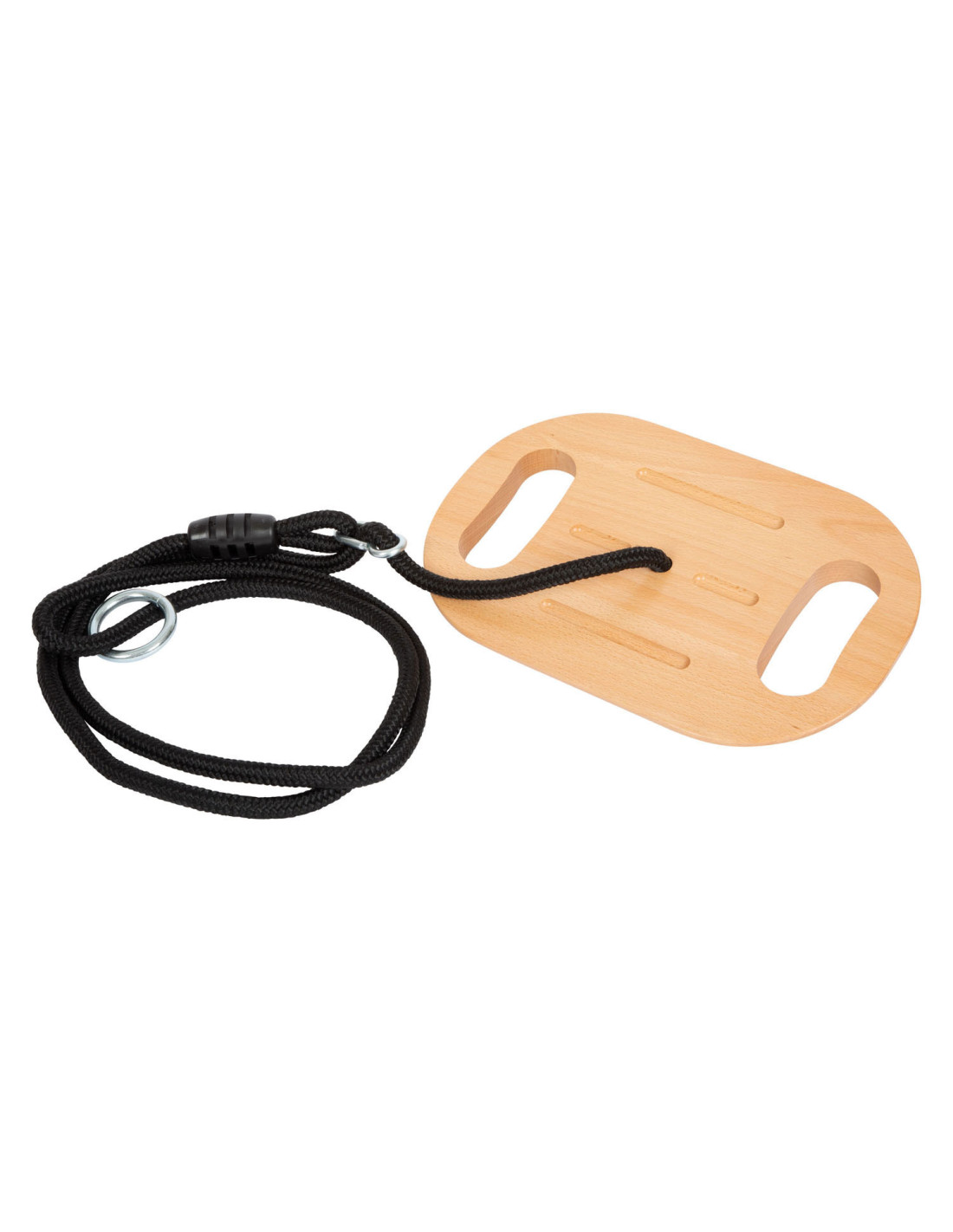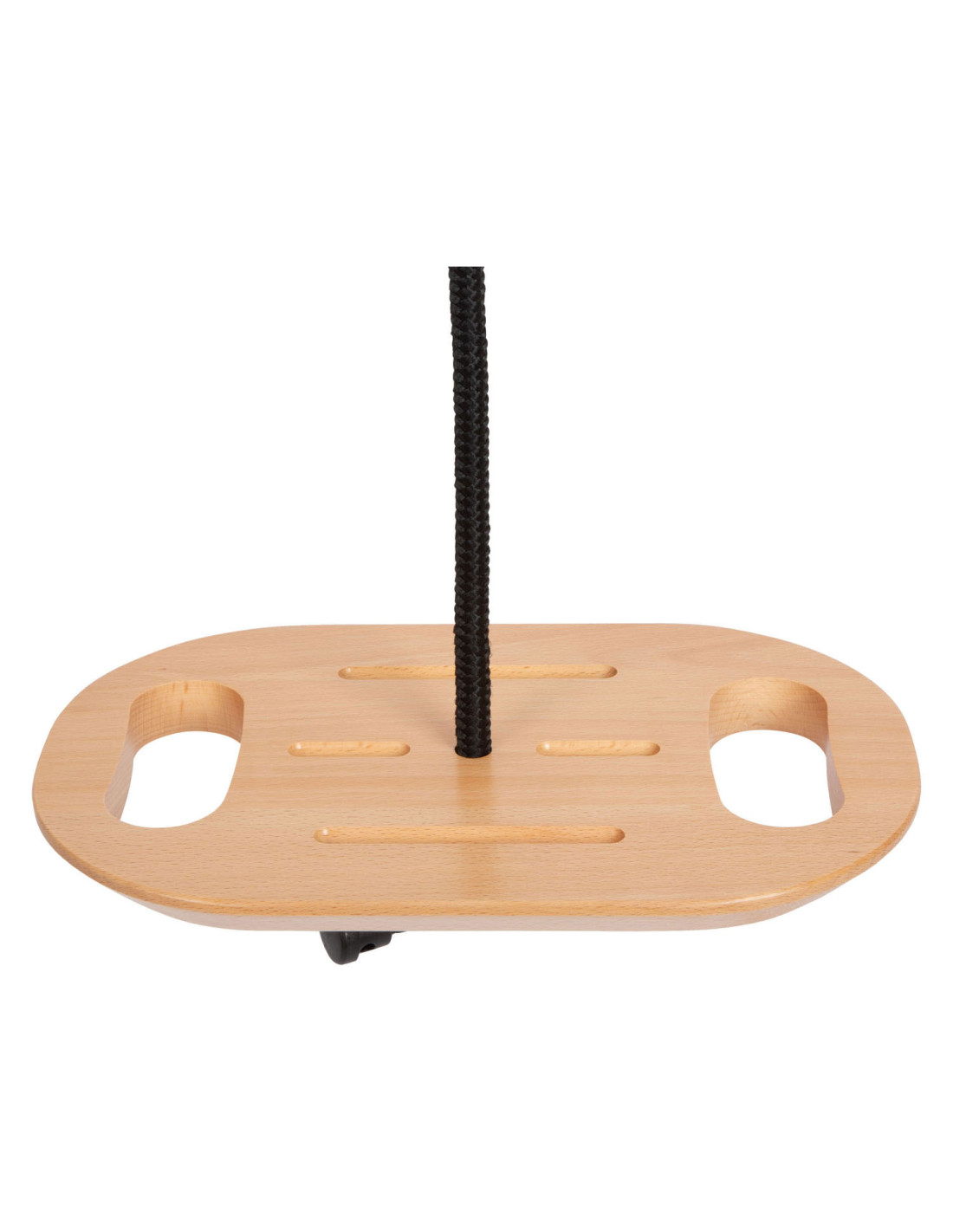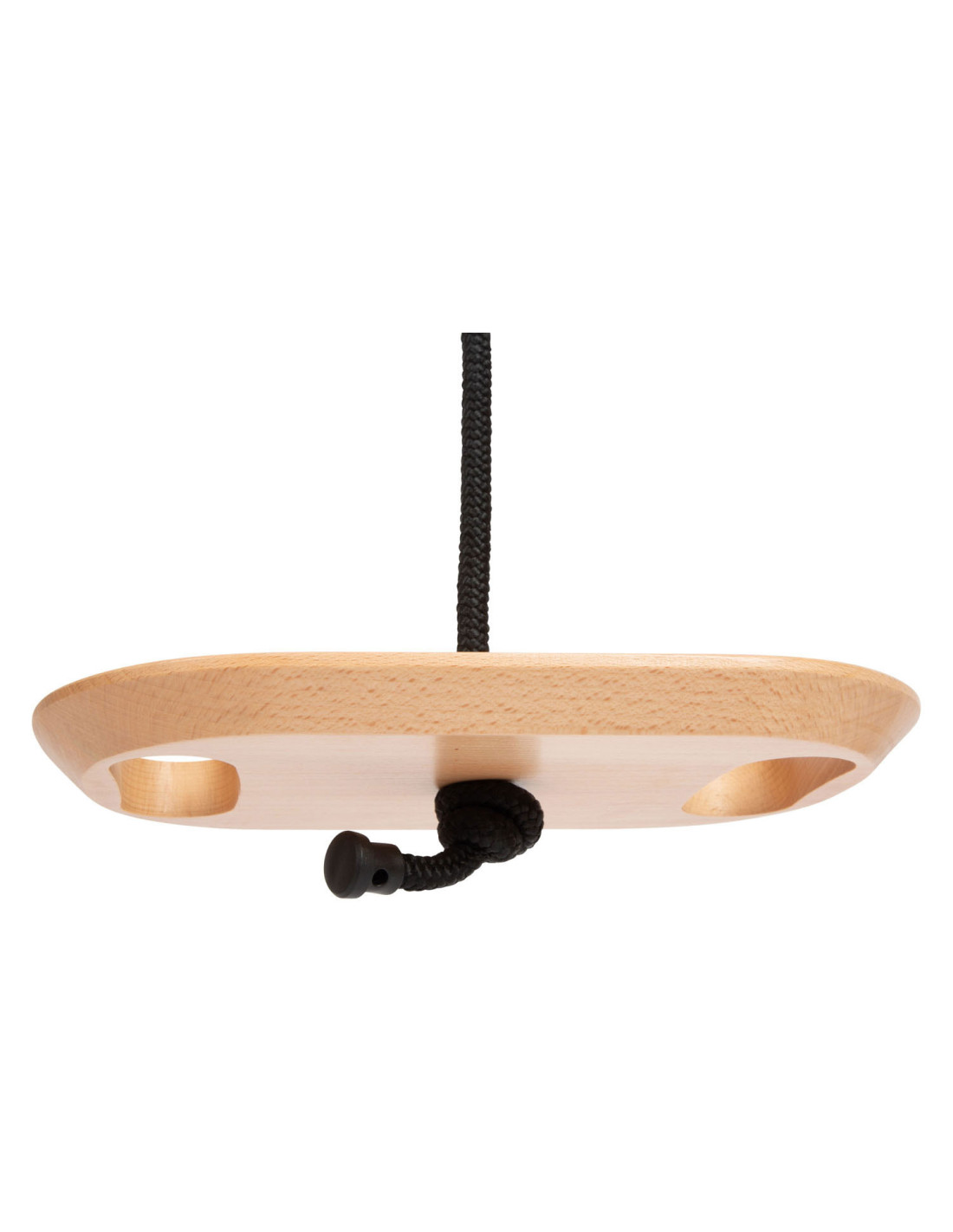 Schommelplezier tijdens het hangen en zitten! Deze schijfschommel is een absolute blikvanger, gemaakt van robuust massief hout gecombineerd met puur zwarte touwen en kan zowel zittend als hangend aan de handgrepen worden gebruikt. Randen op het zitvlak zorgen voor een veilige zitplaats, terwijl het robuuste, grijpbare kunststof touw veilig kan worden vastgehouden. Dankzij een metalen ring kan deze in lengte verstelbare schommel snel worden opgehangen en afgebroken. Hij kan tot 100 kg gewicht dragen en is daarom ook geschikt voor volwassenen.