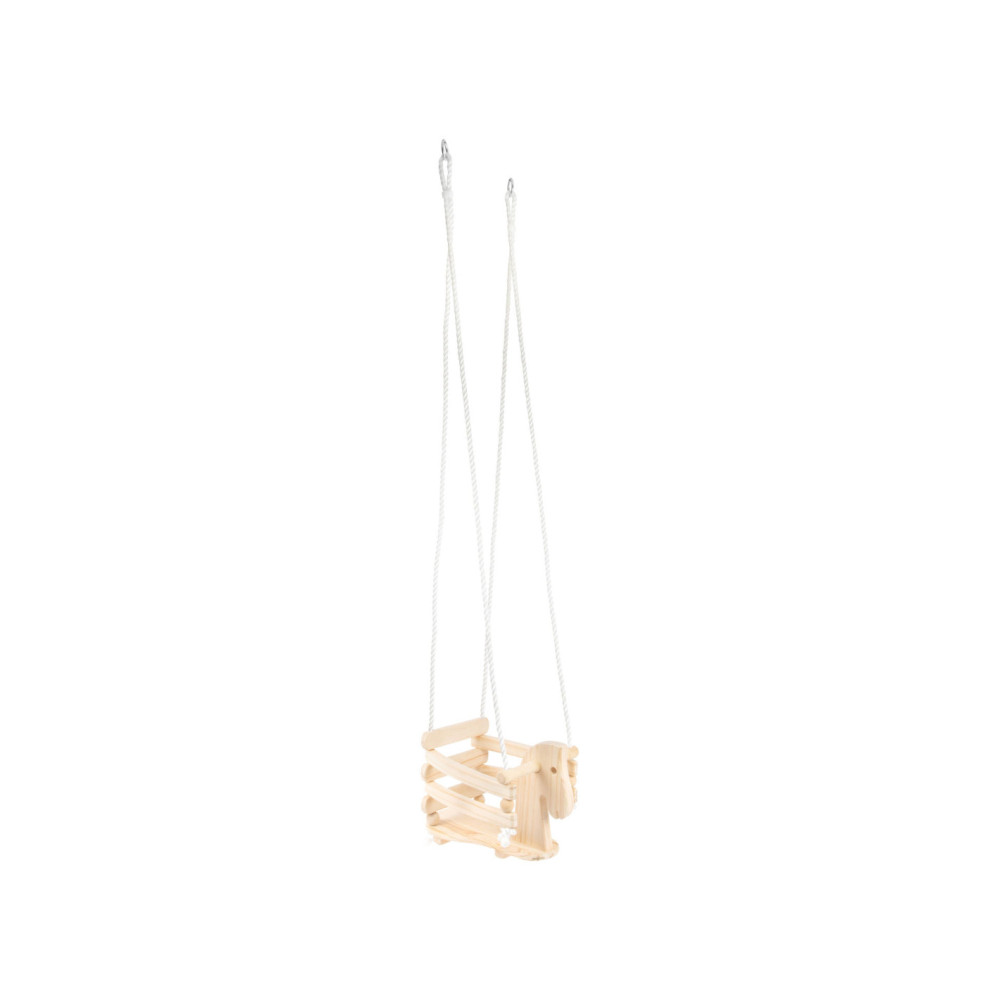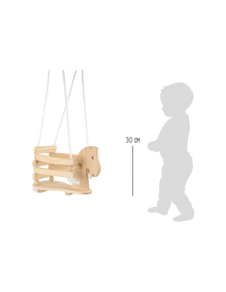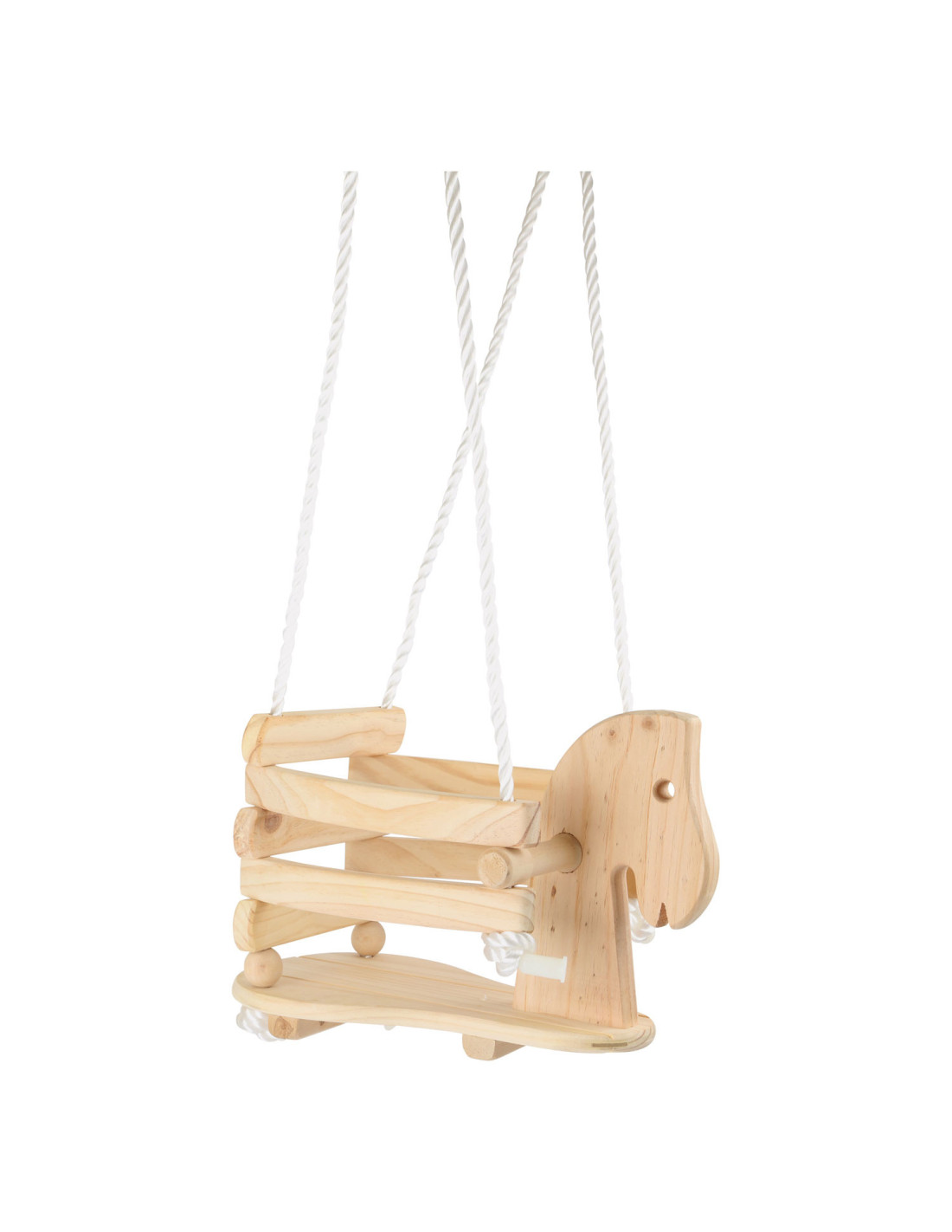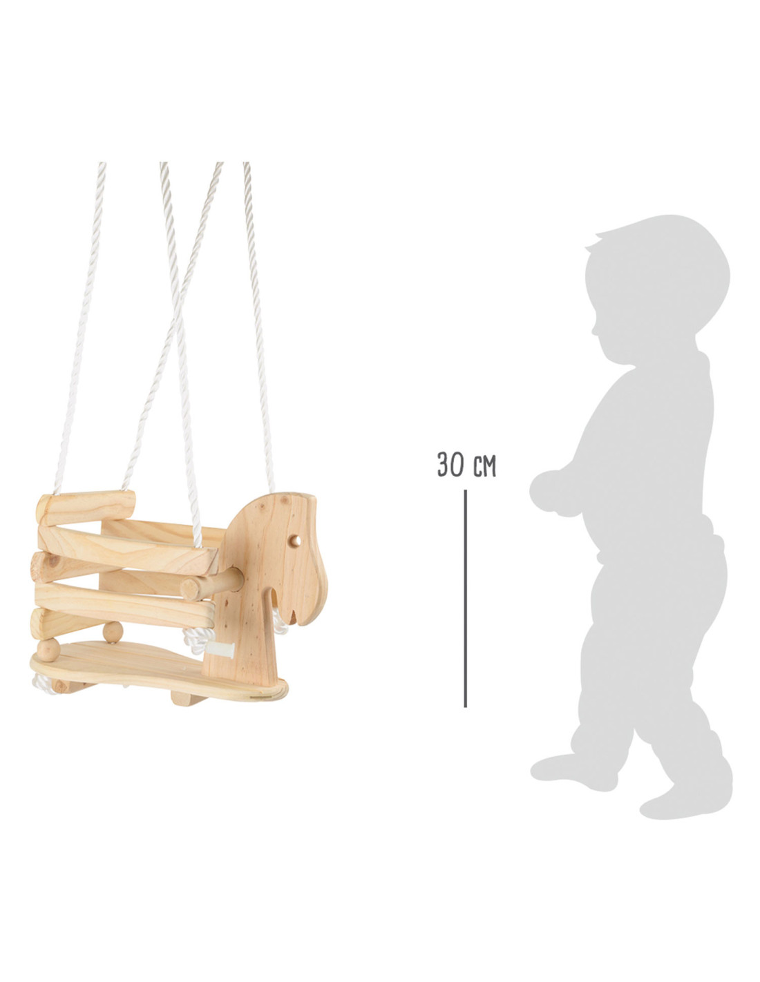 Wie de wolken wil beklimmen, moet zo snel mogelijk in deze schommel gaan zitten. Het is gemaakt van natuurlijk afgewerkt hout en het paardenhoofd biedt een veilige houvast terwijl het hoog de hemel in zwaait. Massief hout, stabiel ontwerp met extra hoge zijkanten. Maximaal draagvermogen is 30 kg.